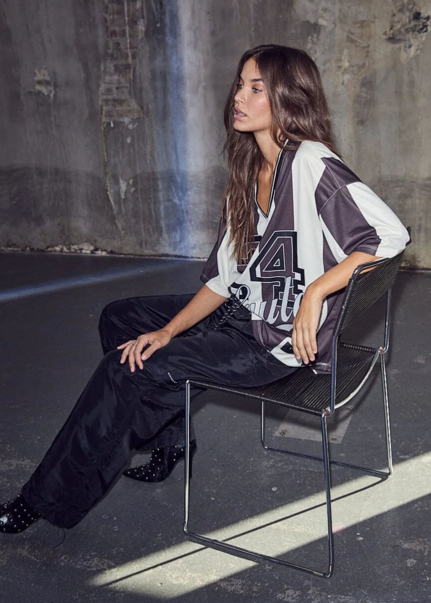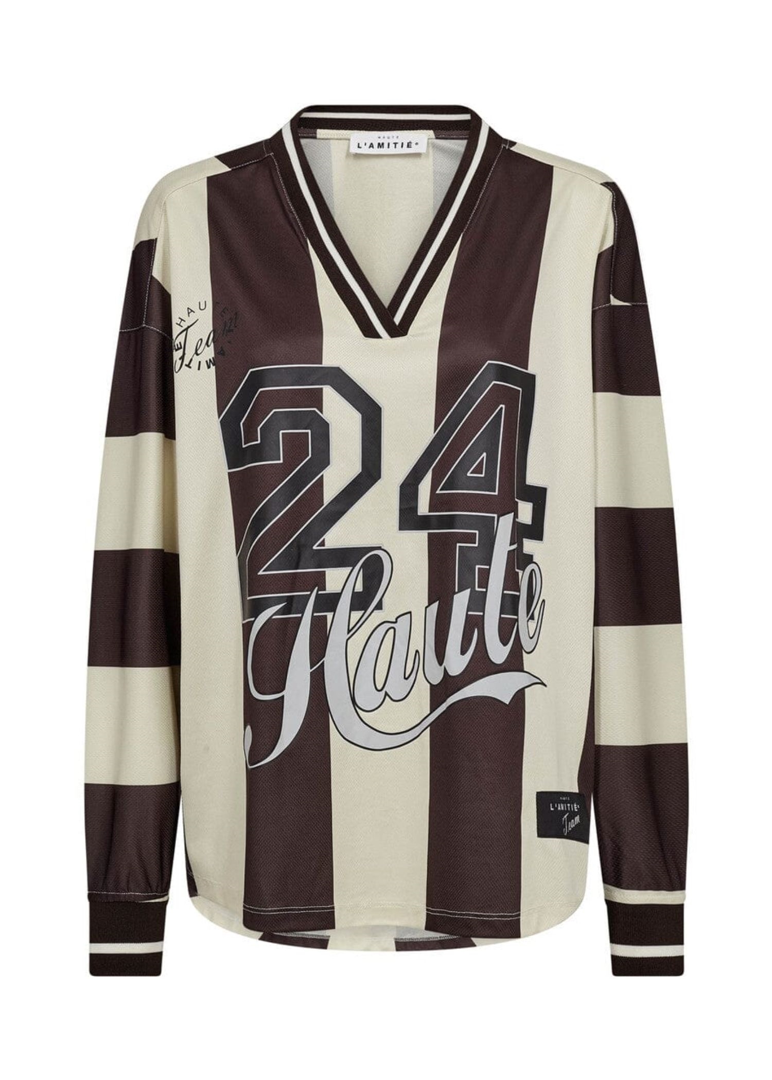 Cool brun/off white stribet football bluse fra haute L'Amitie i en glat let shiny polyesterkvalitet med print både for og bag. Blusen har v-hals + lange ærmer med elastikribkant.