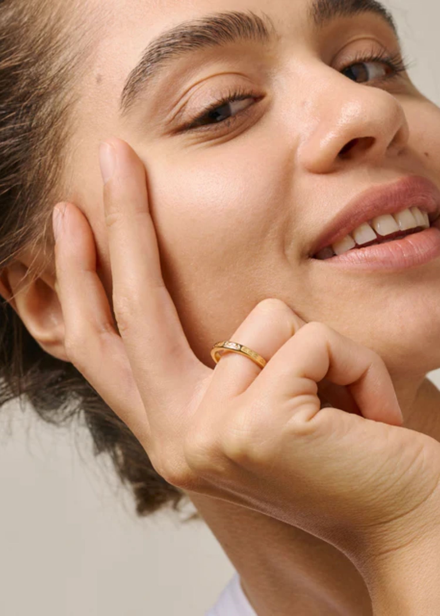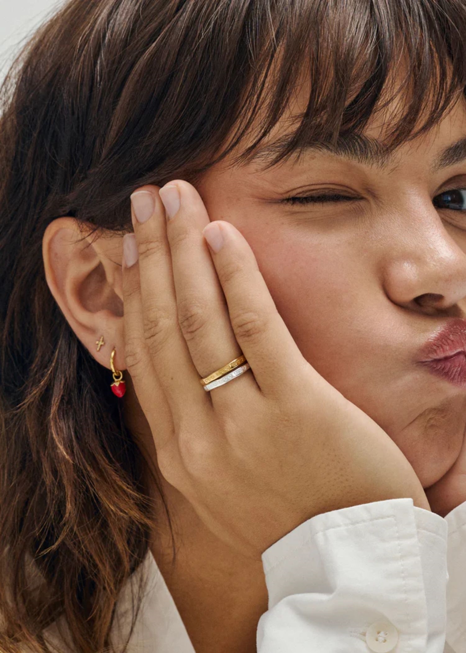 Ring heart fra Enamel belagt med 18 karat guld, er en diskret måde at sige ’jeg elsker dig’ på. Ringen er enkel i sit udtryk, men kigger du godt efter, så er der indgraveret små hjerter hele vejen rundt. Guldringen har et lækkert, håndlavet udtryk, som giver den et særligt og personligt touch.
