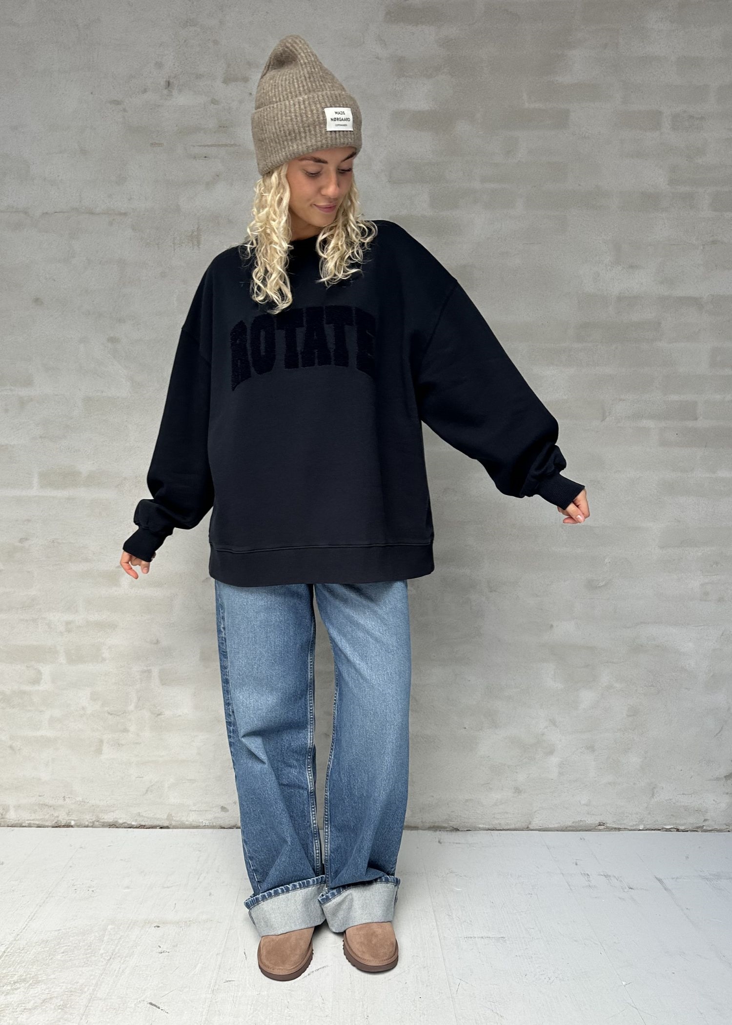 Navy oversize sweat fra Rotate Sunday med tone i tone frotte logo på brystet.