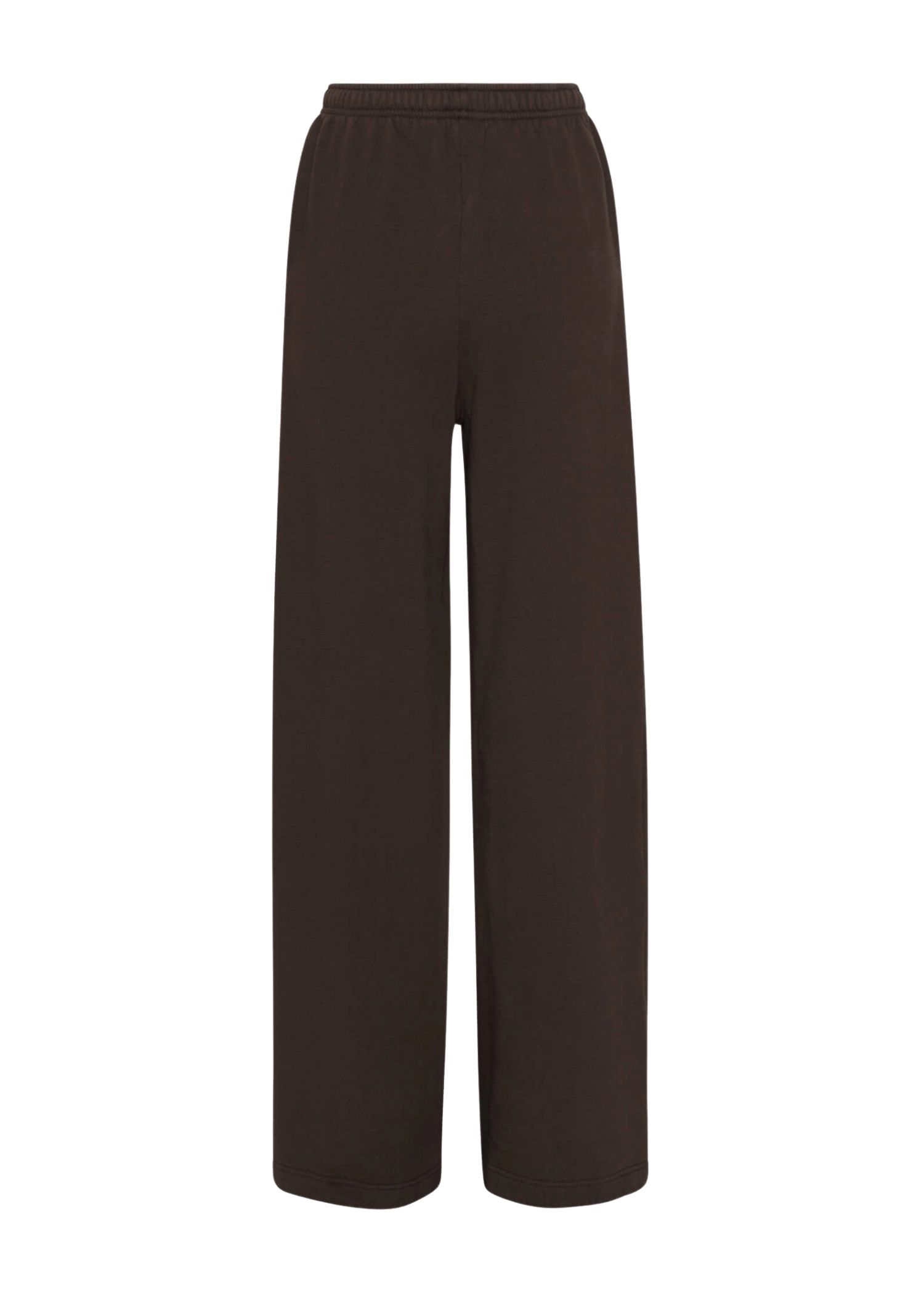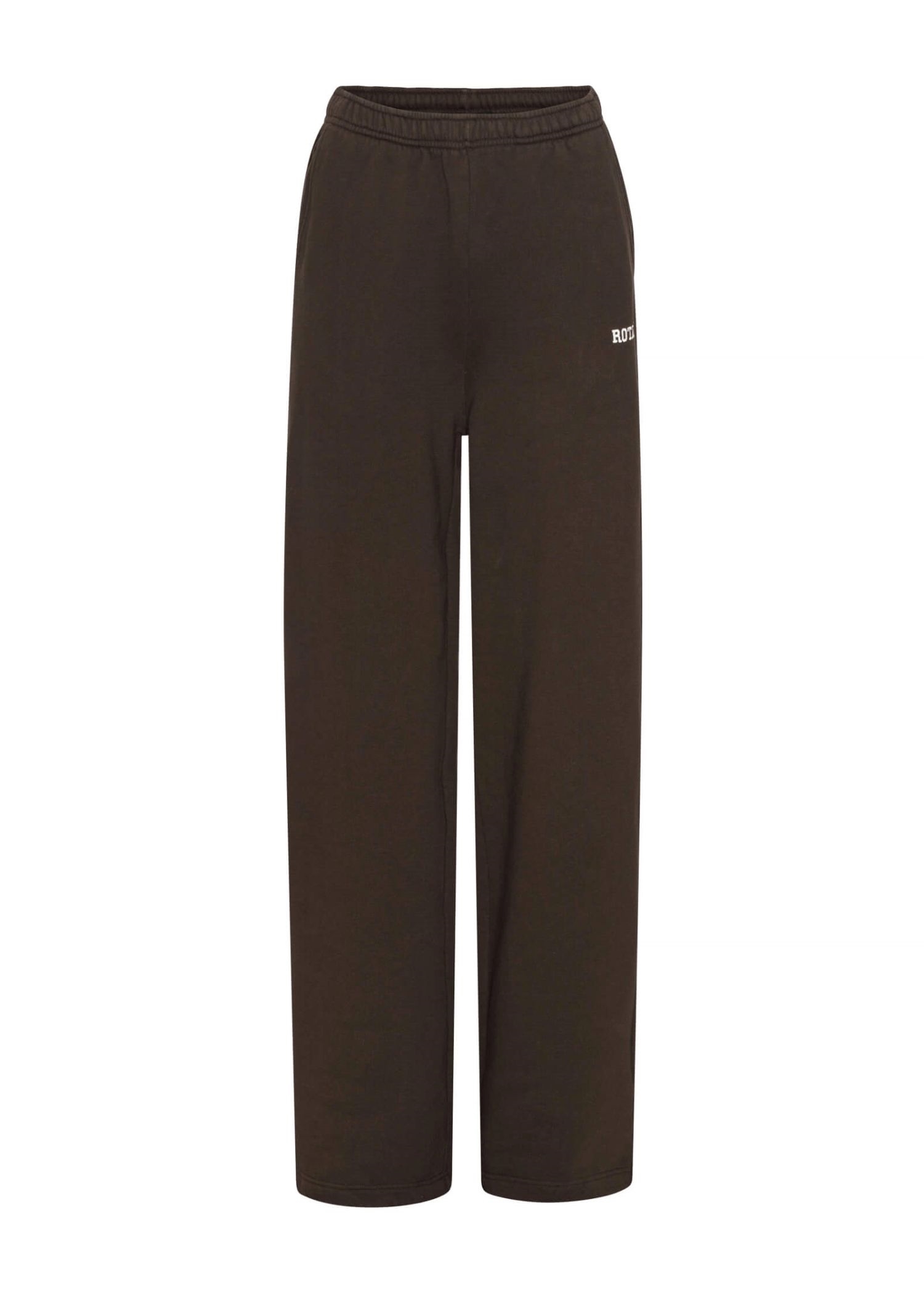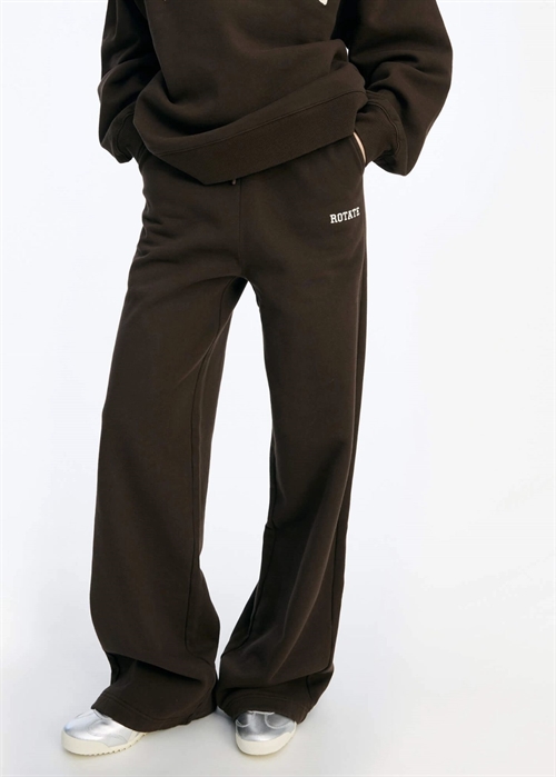 Mørkebrun sweat buks fra Rotate med brede lige ben, elastik i taljen, lommer i siden, samt off white broderet logo ved venstre lomme.