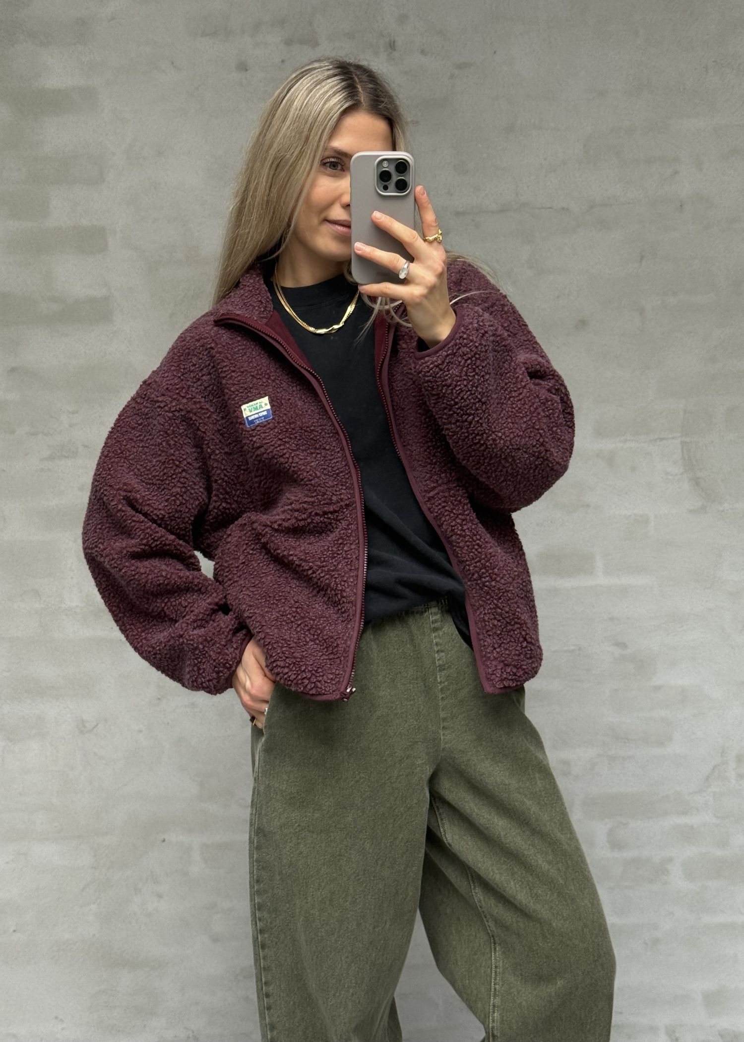 Bordeaux meleret boucle jakke fra American Vintage. Jakken har lynlåslukning ned foran, lommer i siden med lynlåslukning, høj krave, samt elastikafslutning ved ærmer.