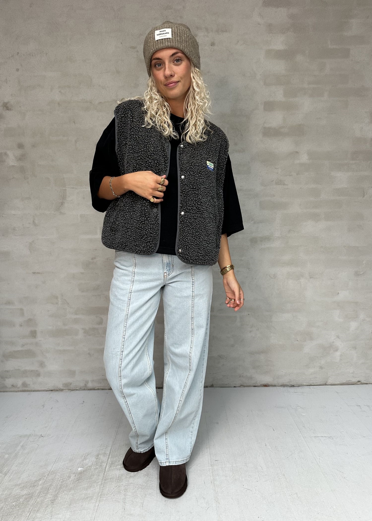 Koksgrå meleret boucle vest fra American Vintage. Vesten er bred i modellen, har grå kantbånd, tryklåsknapper ned foran, påsyet logo foran, samt lommer foran med skjult lynlåslukning.