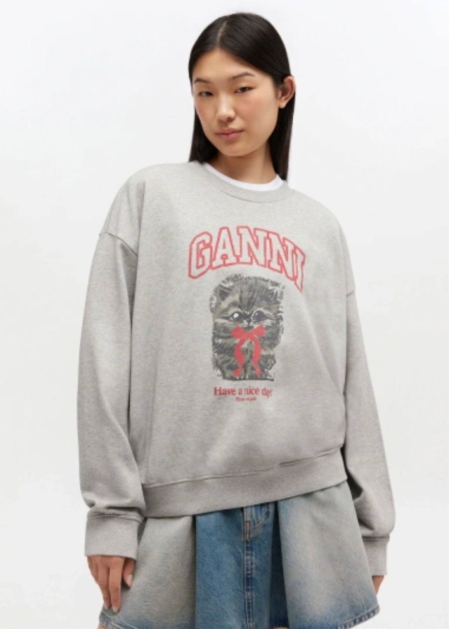 Lysegrå sweatshirt fra Ganni med rund halsudskæring, lange ærmer og GANNI-logo. Sweatshirten har et grafisk katteprint og teksten 'Have a nice day! Please recycle!'.