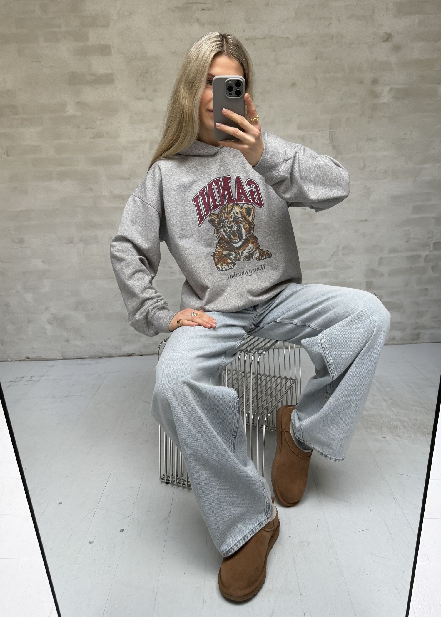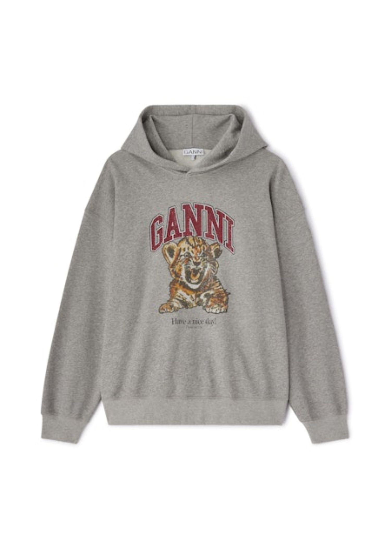 Lysegrå meleret hoodie fra Ganni med 3D glimmer logo + baby tiger print.