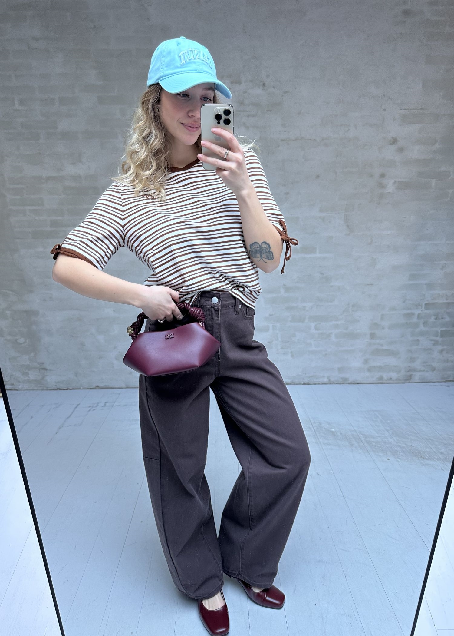 Brun stribet Janet T-shirt fra Baum lavet i økologisk bomuldsjersey med en afslappet, let cropped pasform med rund hals og bindebånd i ærmerne.