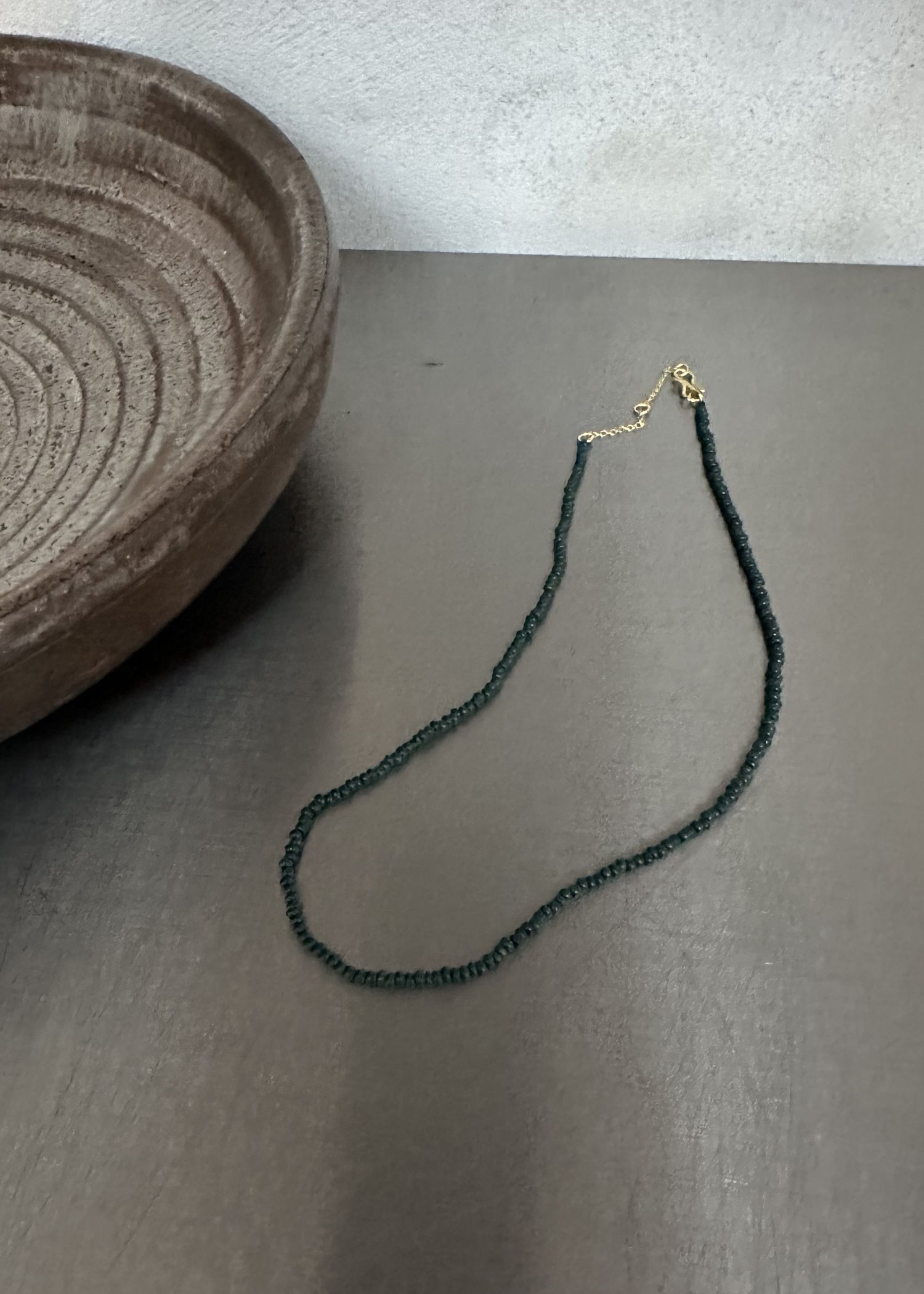 Fin håndlavet halskæde med små grønne glasperler fra Annavii. Halskæden er justerbar i længden med den forgyldte smalle forlængerkæde som lukkes med en s-lås.