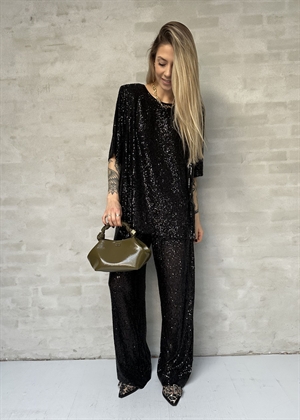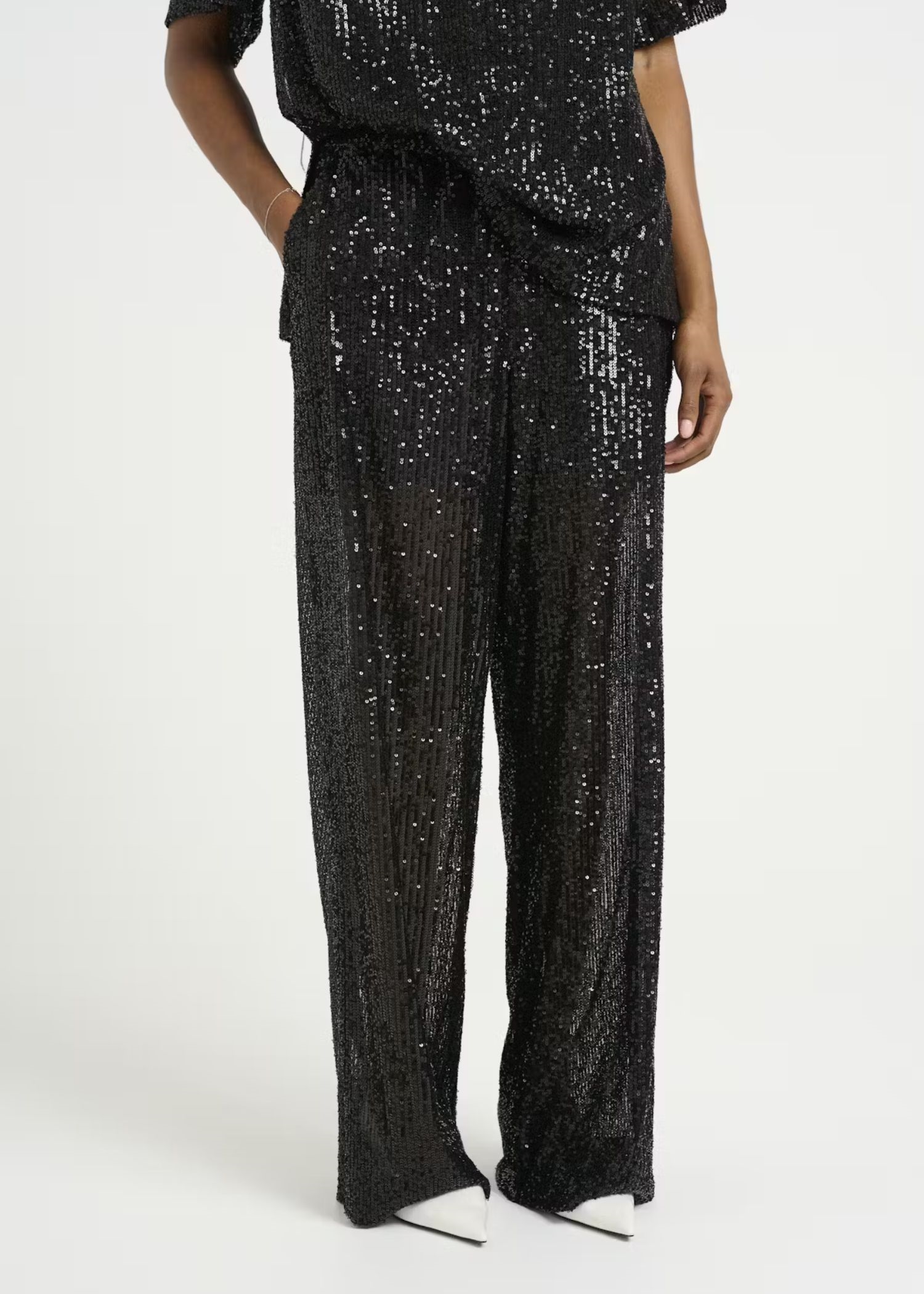 Sorte paillet bukser fra Gestuz i en let blød polyester/viskose kvalitet. Bukserne har elastikkant, skrålommer i siden, lange løse ben, samt er transparente fra låret og ned.