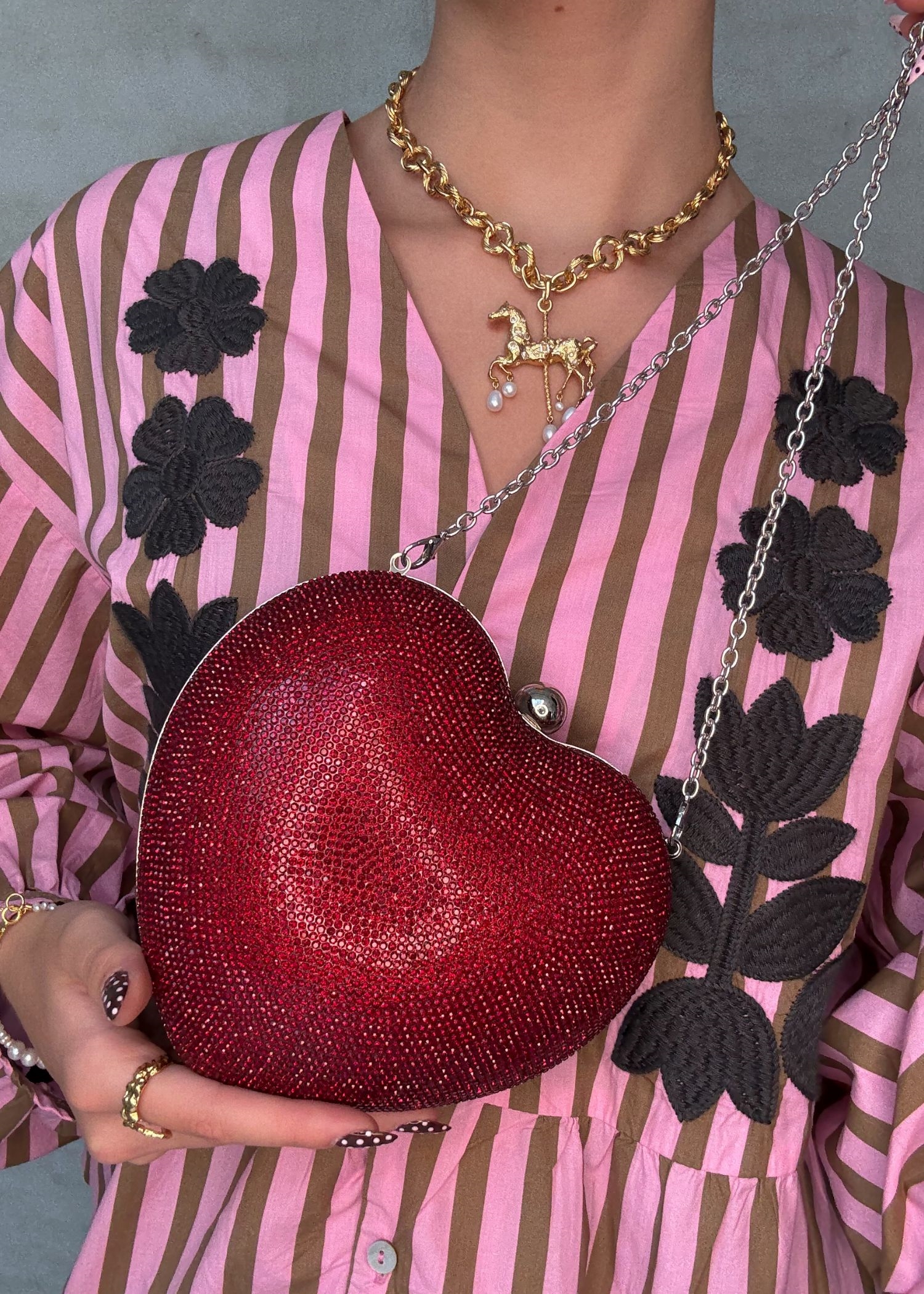 Rød hjerteformet taske fra Becksöndergaard er det ultimative statement piece til dine festlige lejligheder. Tasken er dækket af glitrende røde rhinsten og har en elegant sølvkæde, som gør det muligt at bære den over skulderen eller i hånden. Med sin hårde ydre form og unikke facon kombinerer den både det feminine og det iøjnefaldende – perfekt til at pifte ethvert outfit op.