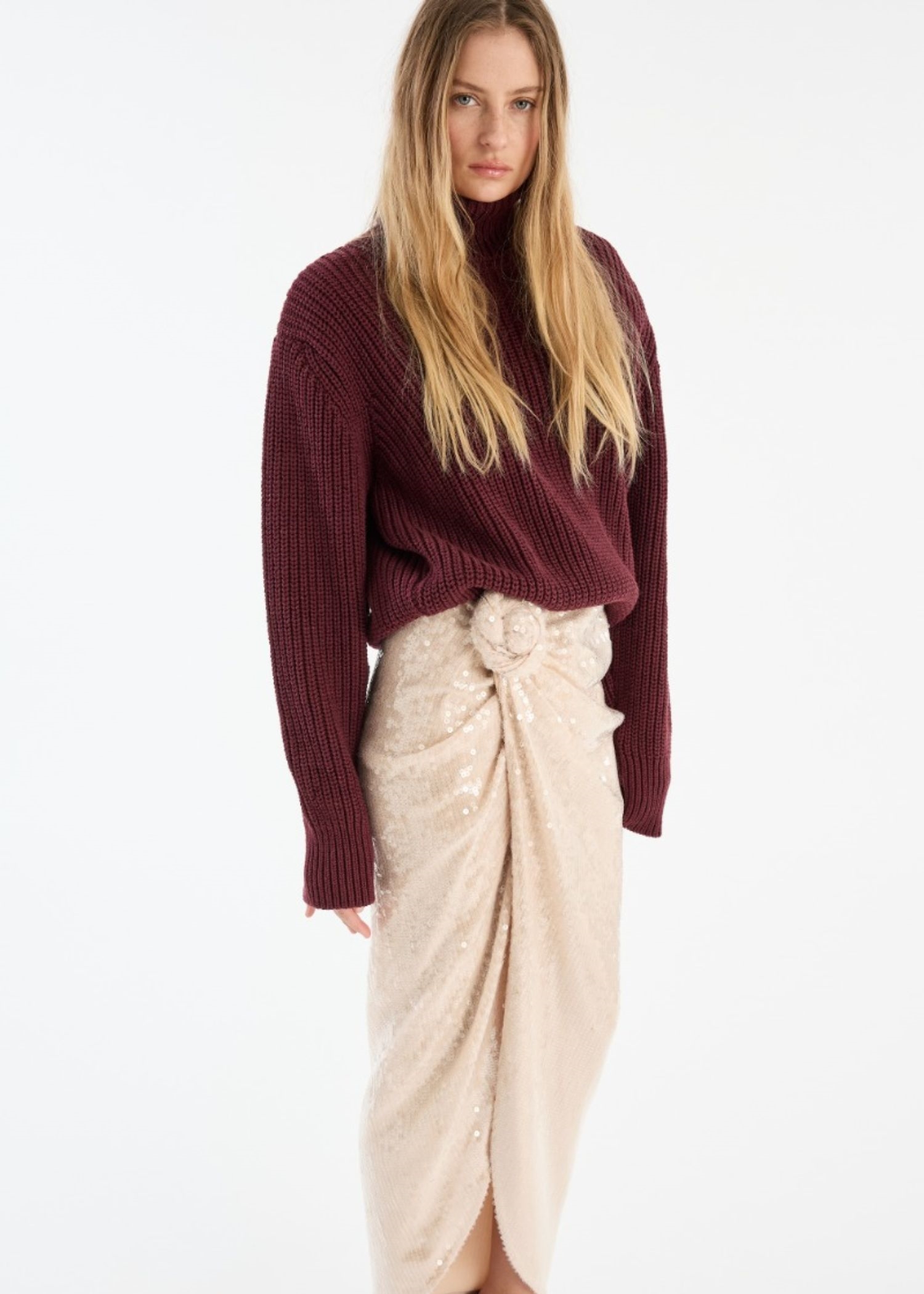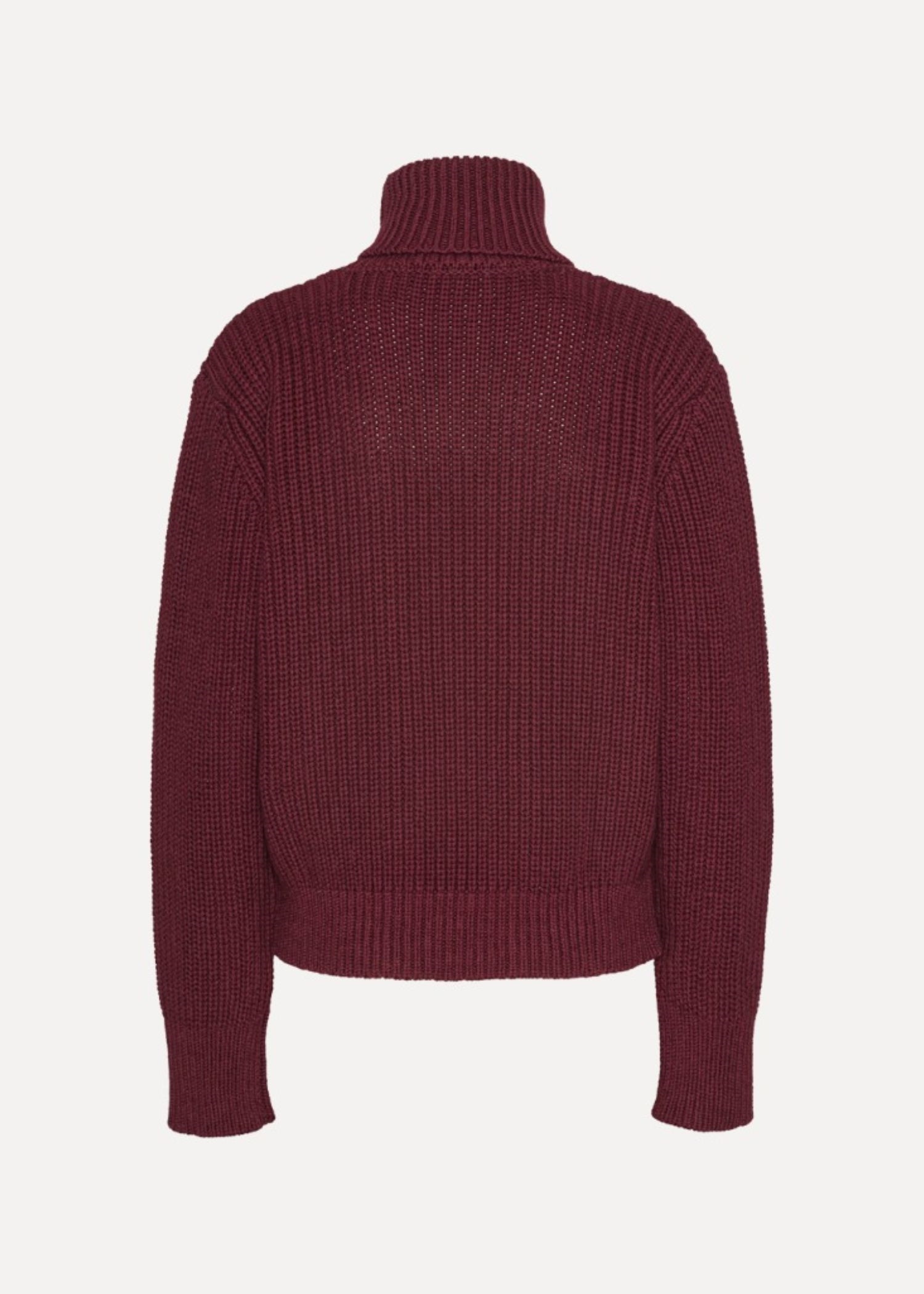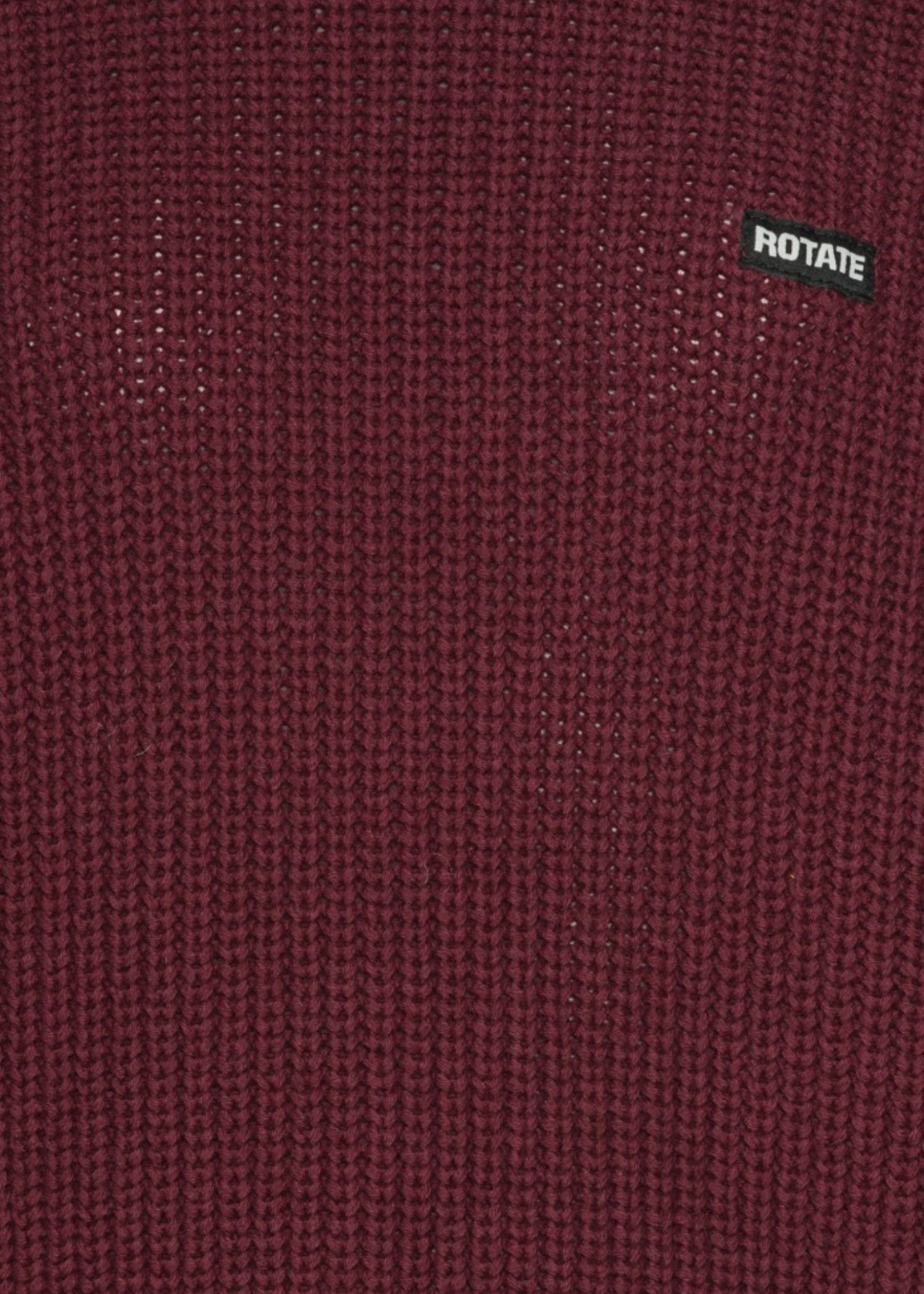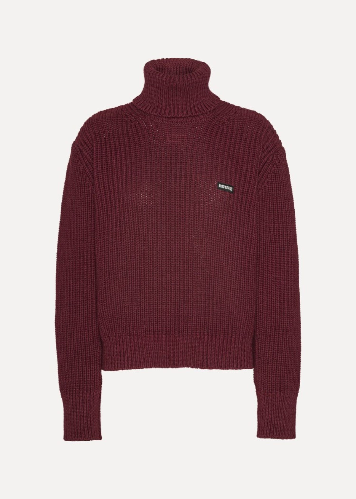 Vinrød strik fra Rotate i en lidt kraftigere uld/bomuldskvalitet med turtleneck og sort påsyet logo på det ene bryst.