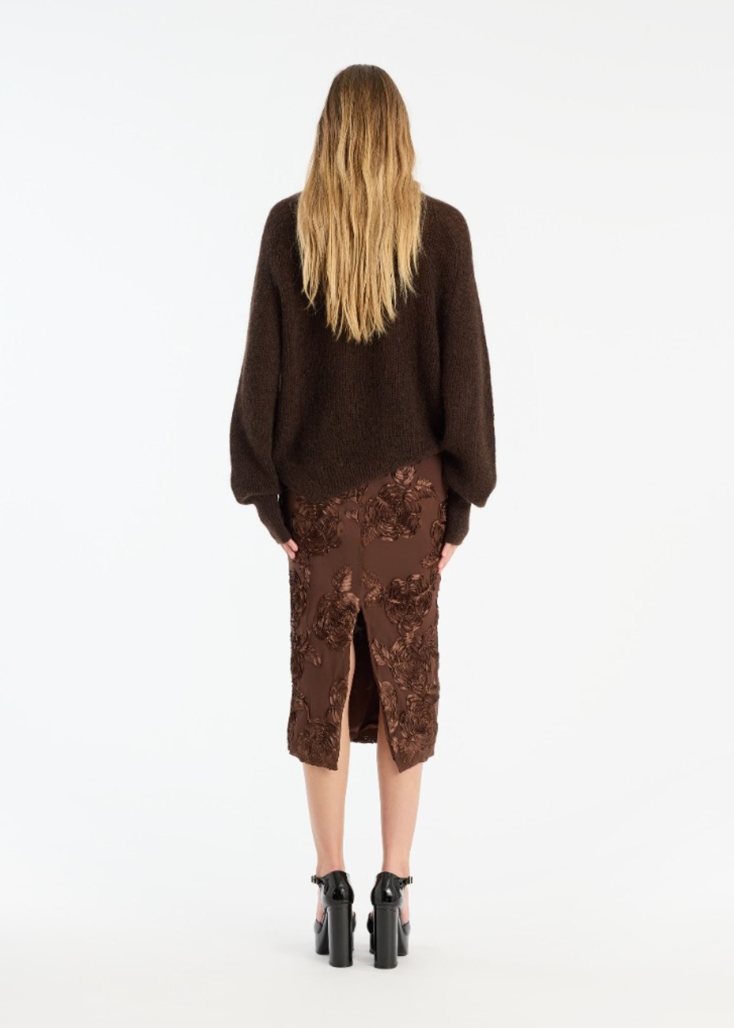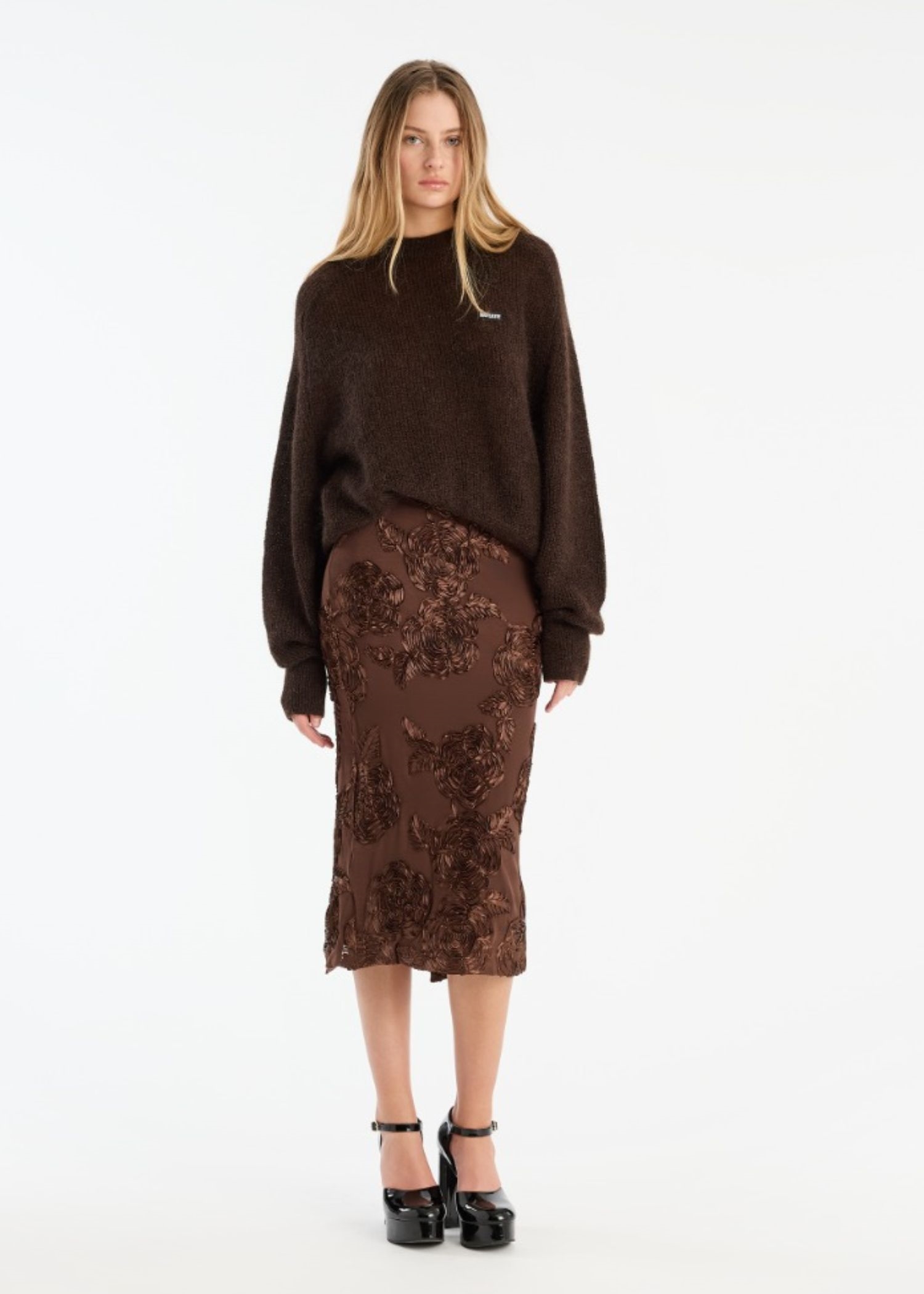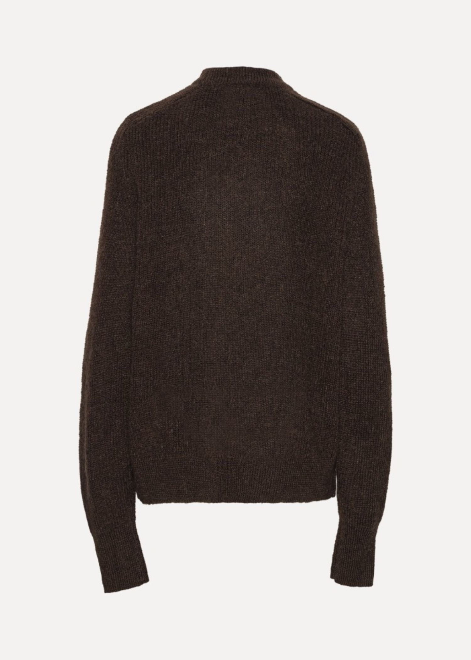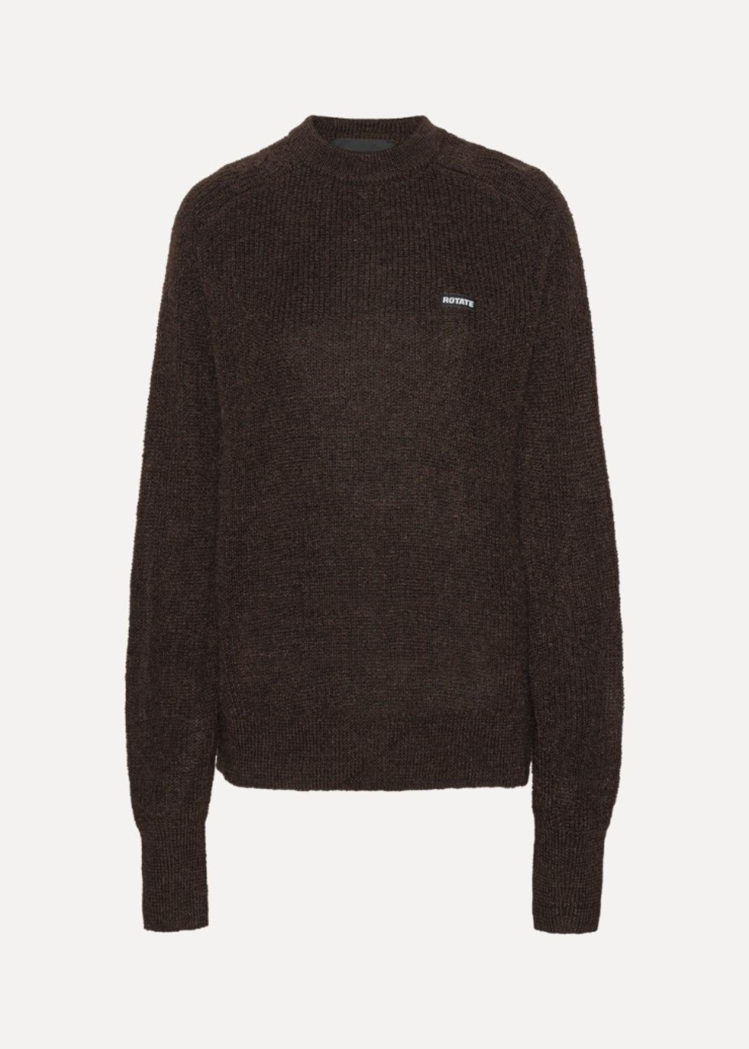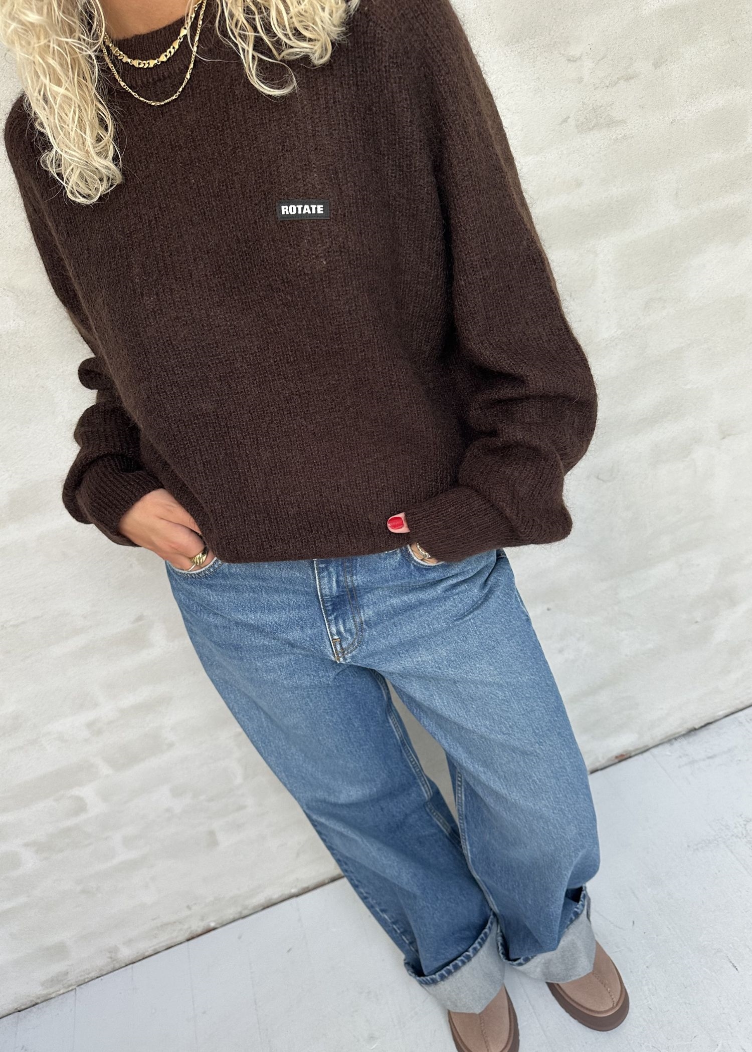 Mørkebrun strik fra Rotate i en let strikkvalitet med løs pasform, samt logo på brystet.