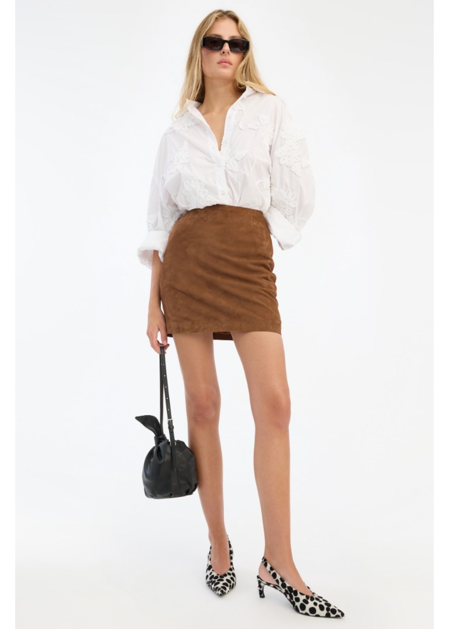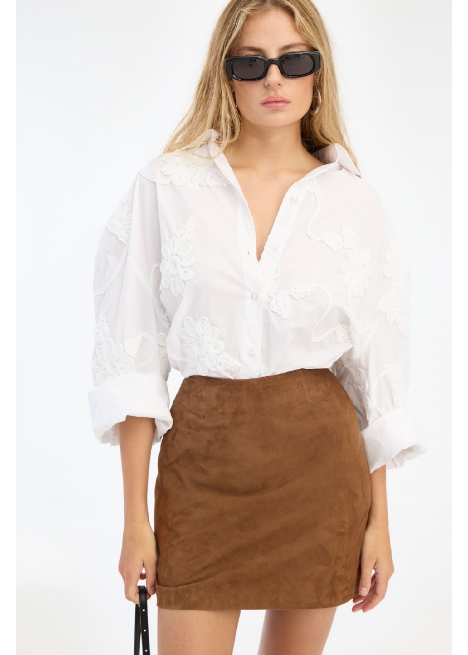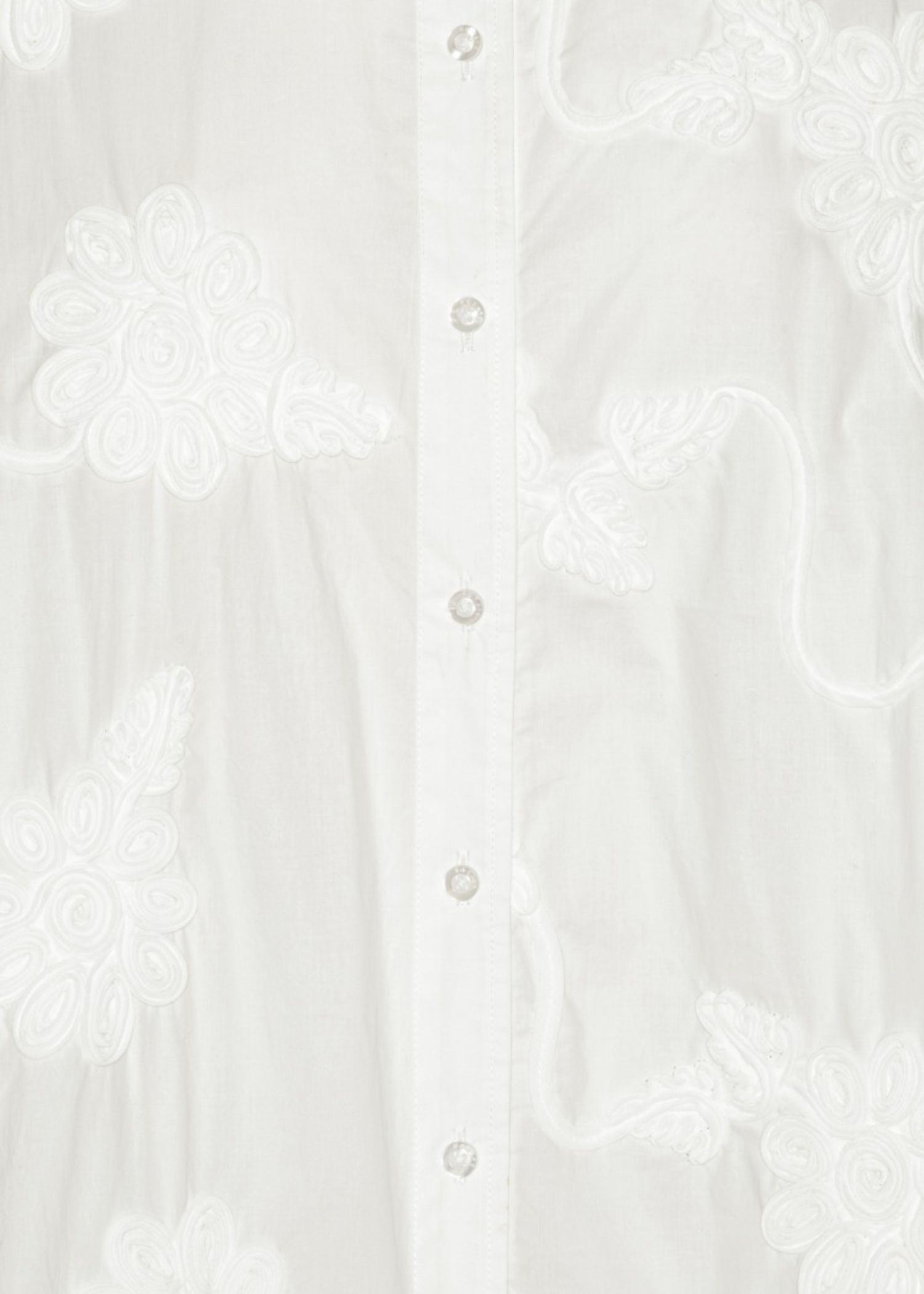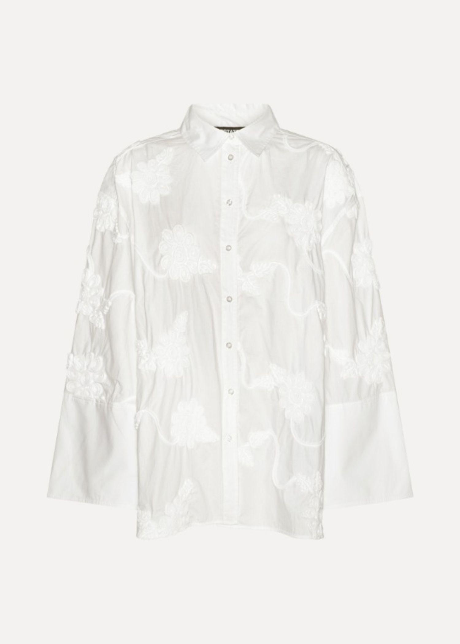 Hvid ROTATE Flower Oversized Skjorte er en romantisk og moderne skjorte, der kombinerer klassisk skjortedesign med feminine detaljer. Den er dekoreret med smukke 3D-blomsterapplikationer, som giver et eksklusivt udtryk og gør den perfekt til både hverdagsbrug og festlige anledninger.