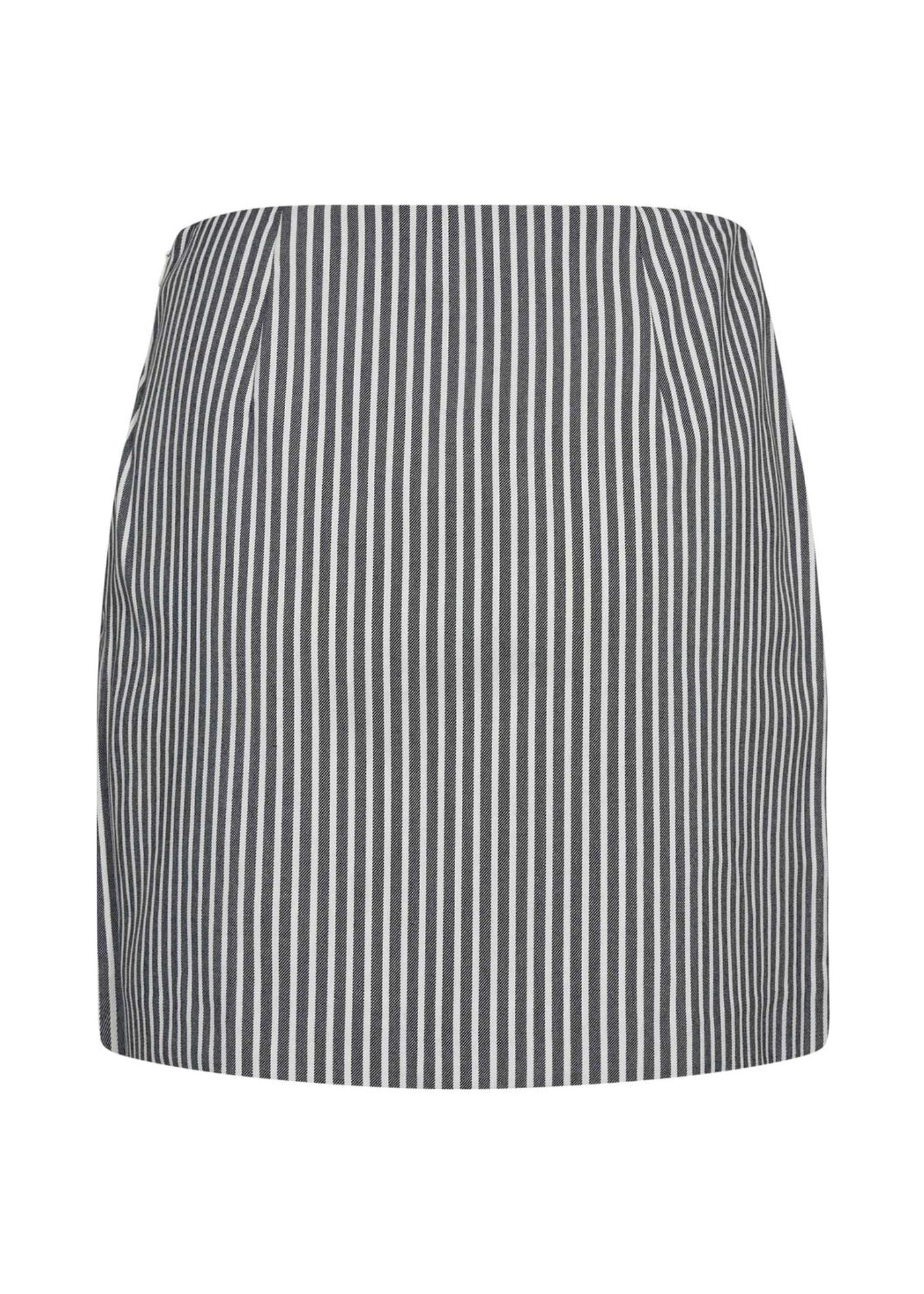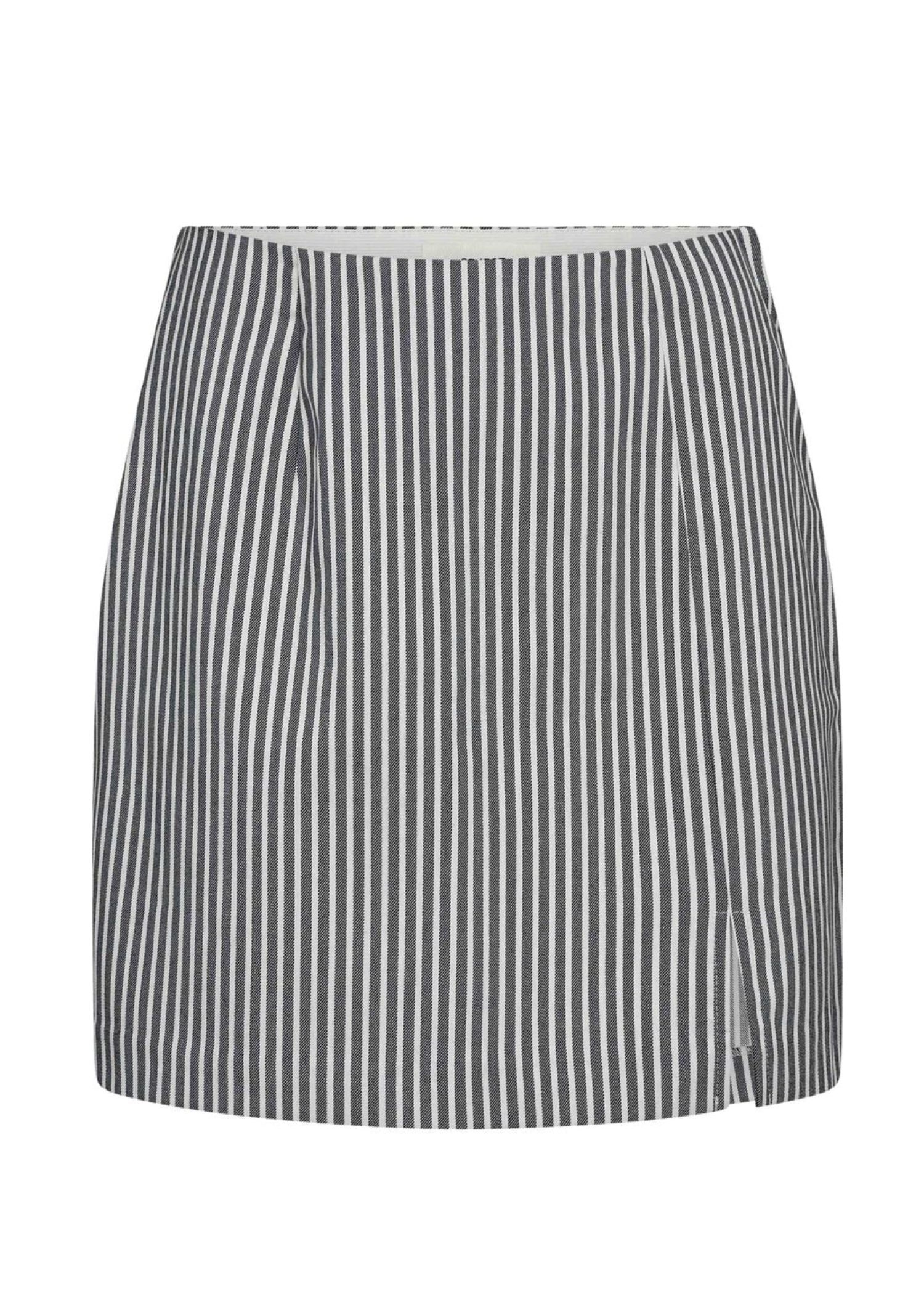 Kort mini skirt fra faded navy/hvid strib med elastik i taljen, skjult lynlåslukning i siden, samt lille slids foran i den ene side.