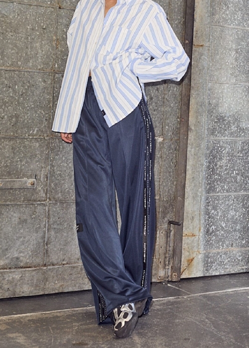 Buksen i en glat polyesterkvalitet, har elastik i taljen, brede lige ben, samt sidelommer med lynlåslukning.