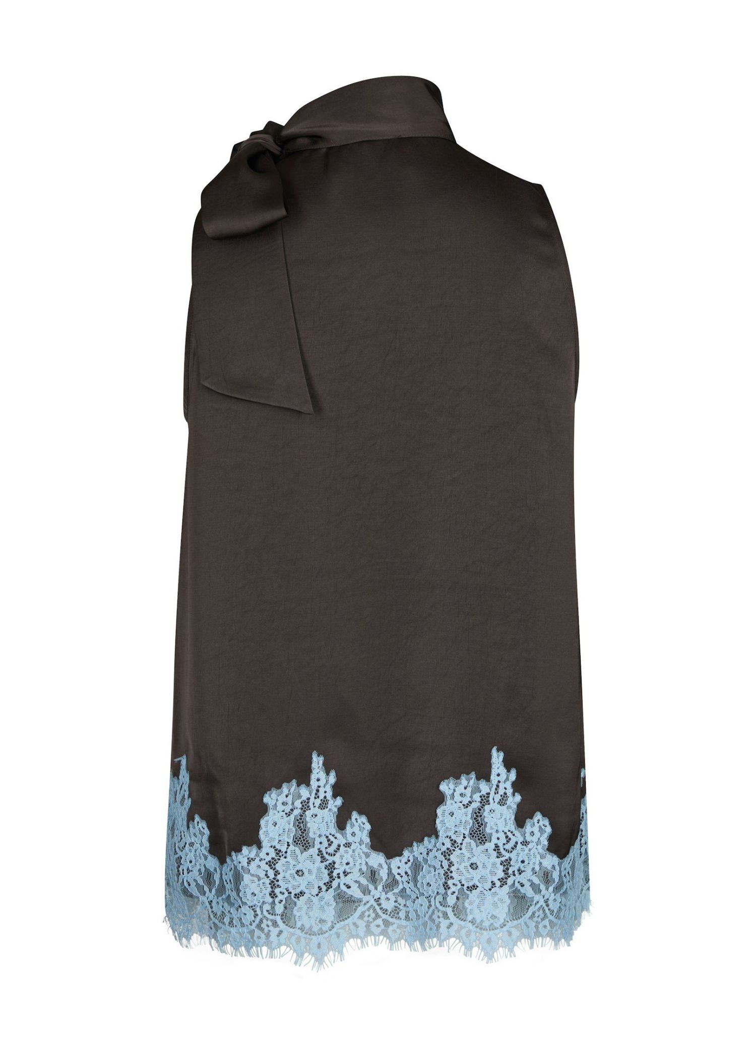 Mørkebrun top fra Neo Noir i en let shiny kvalitet med lyseblå lace detaljer forneden.