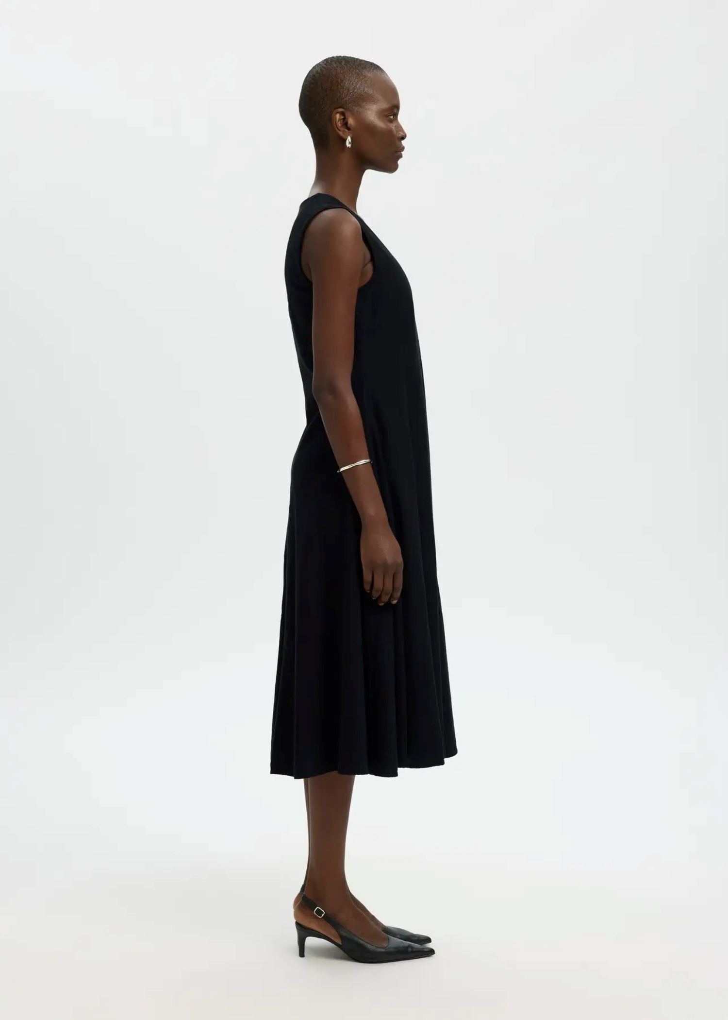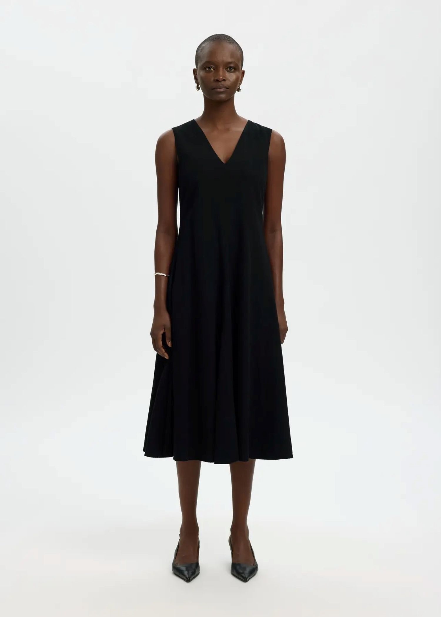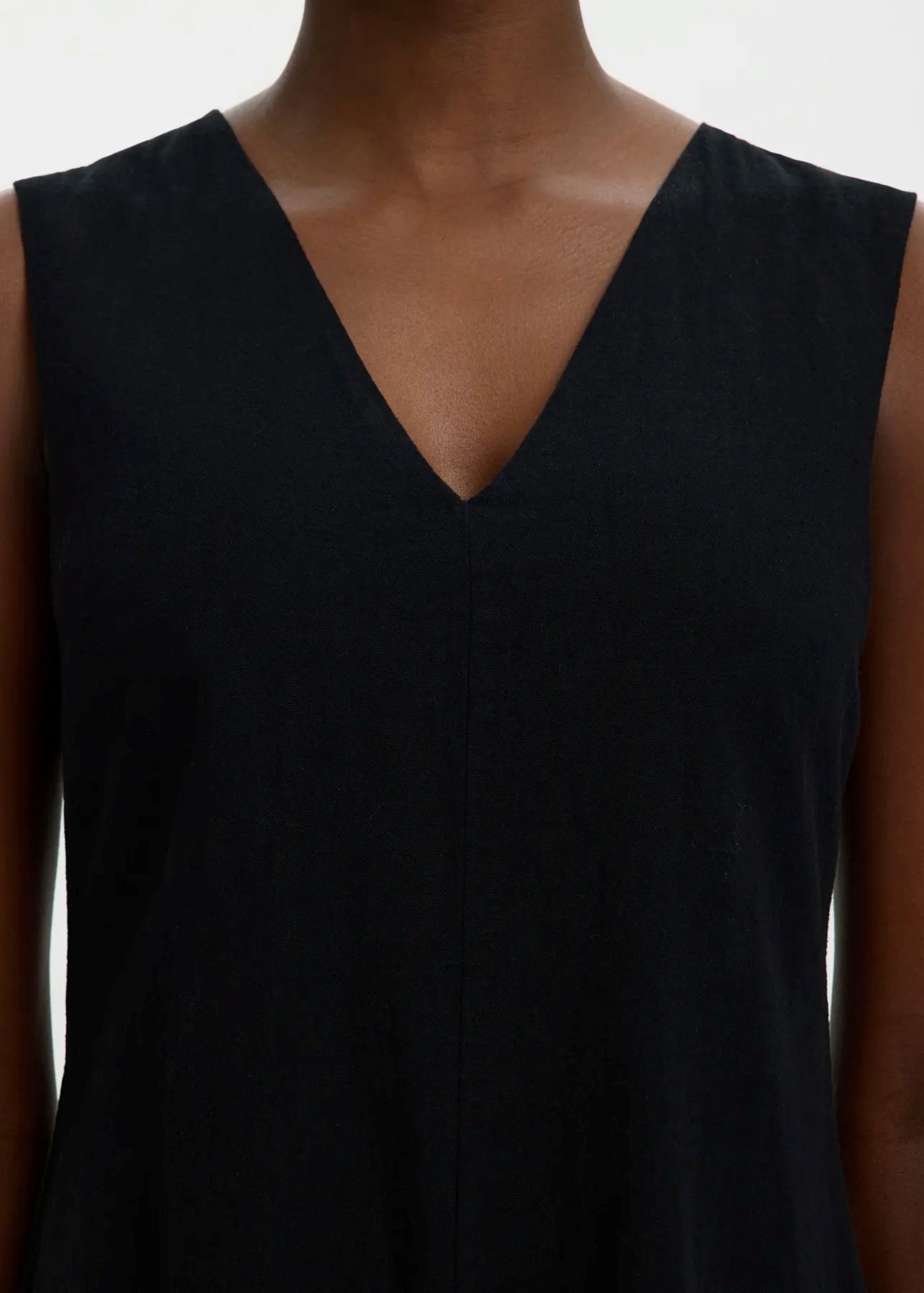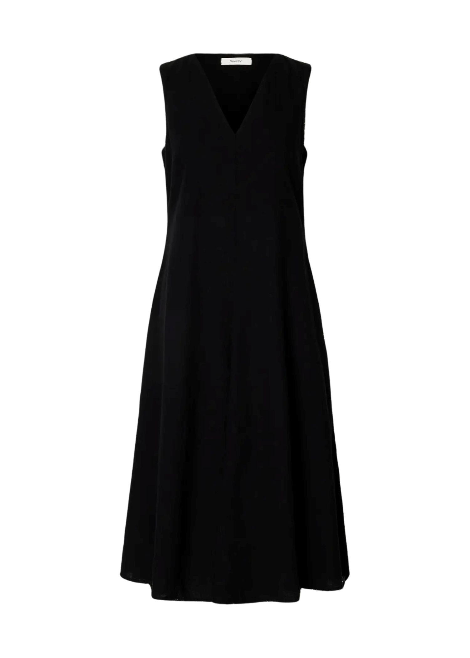 Sort hør kjole fra Selected Femme med v-hals og skjult lynlås lukning i den ene side.