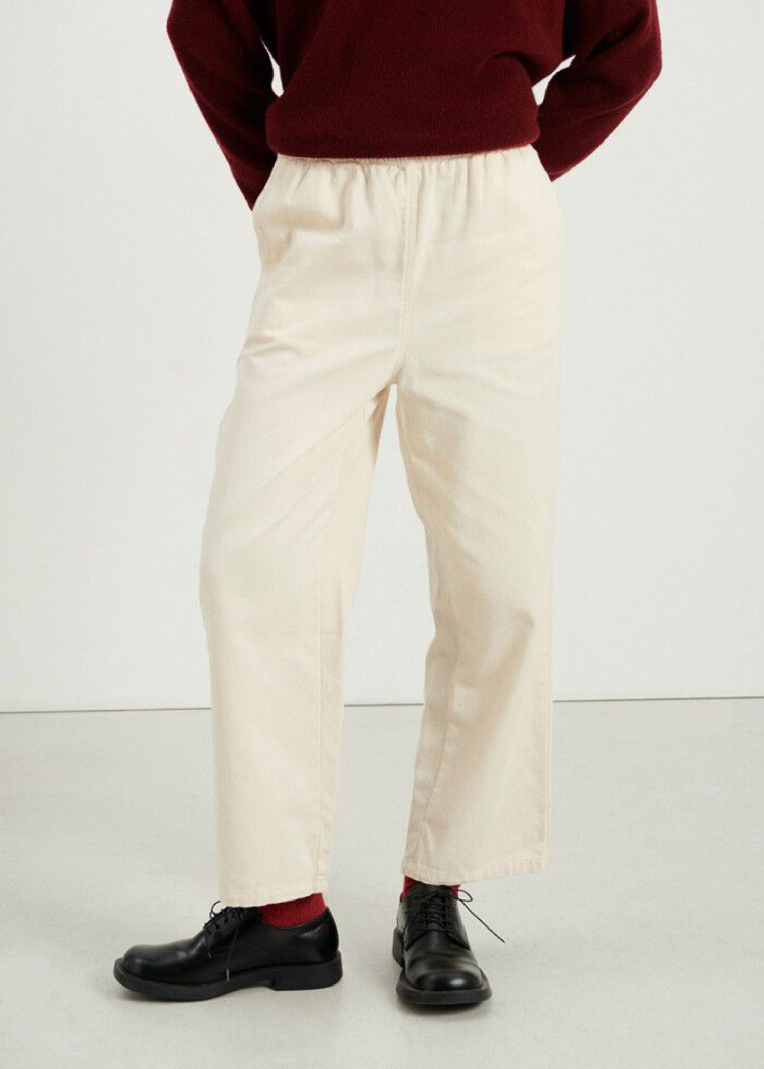 Buksen er løs i modellen med brede cropped ben, elastik i taljen, lommer i siden, samt baglommer.