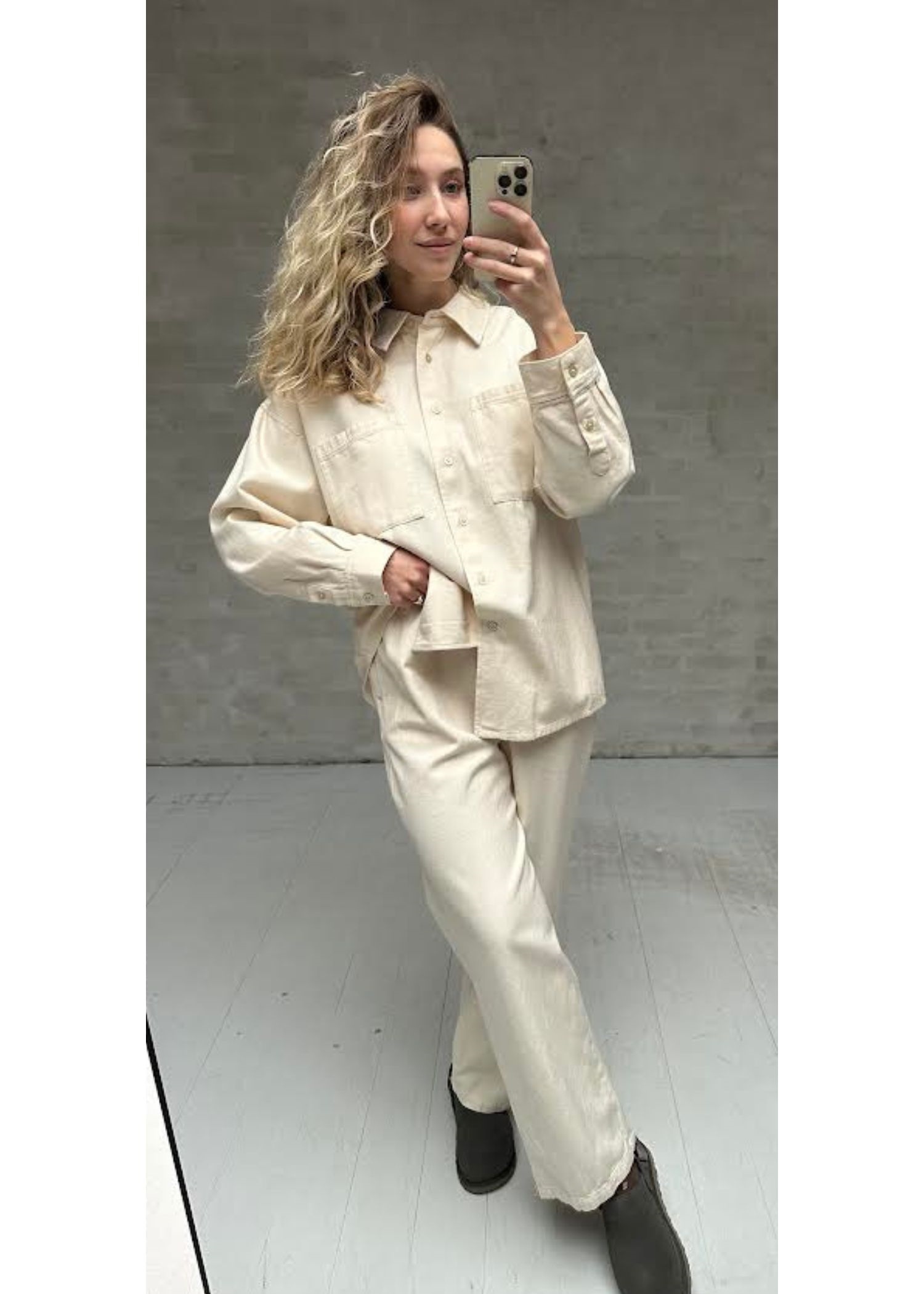 Off White oversize skjorte fra American VIntage i en blød canvas kvalitet med krave, brystlommer, knapper ned foran, lange løse ærmer med knaplukning ved manchet, samt  et diskret logo på ryggen som tilføjer skjorten et elegant præg.