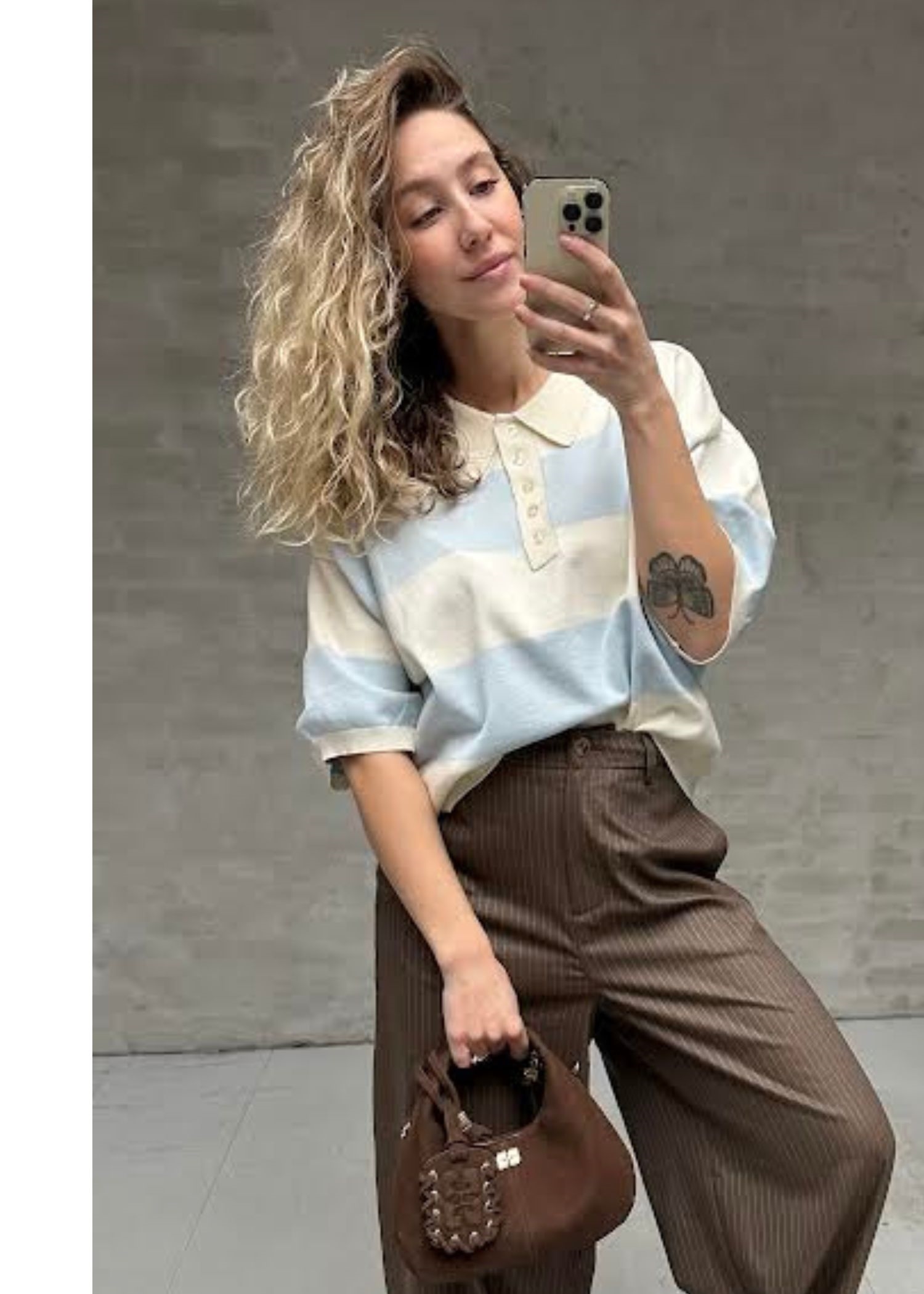 Lyseblå/Off stribet strik polo fra Gestuz med kort bred pasform, stolpelukning samt broderet logo på det ene bryst.