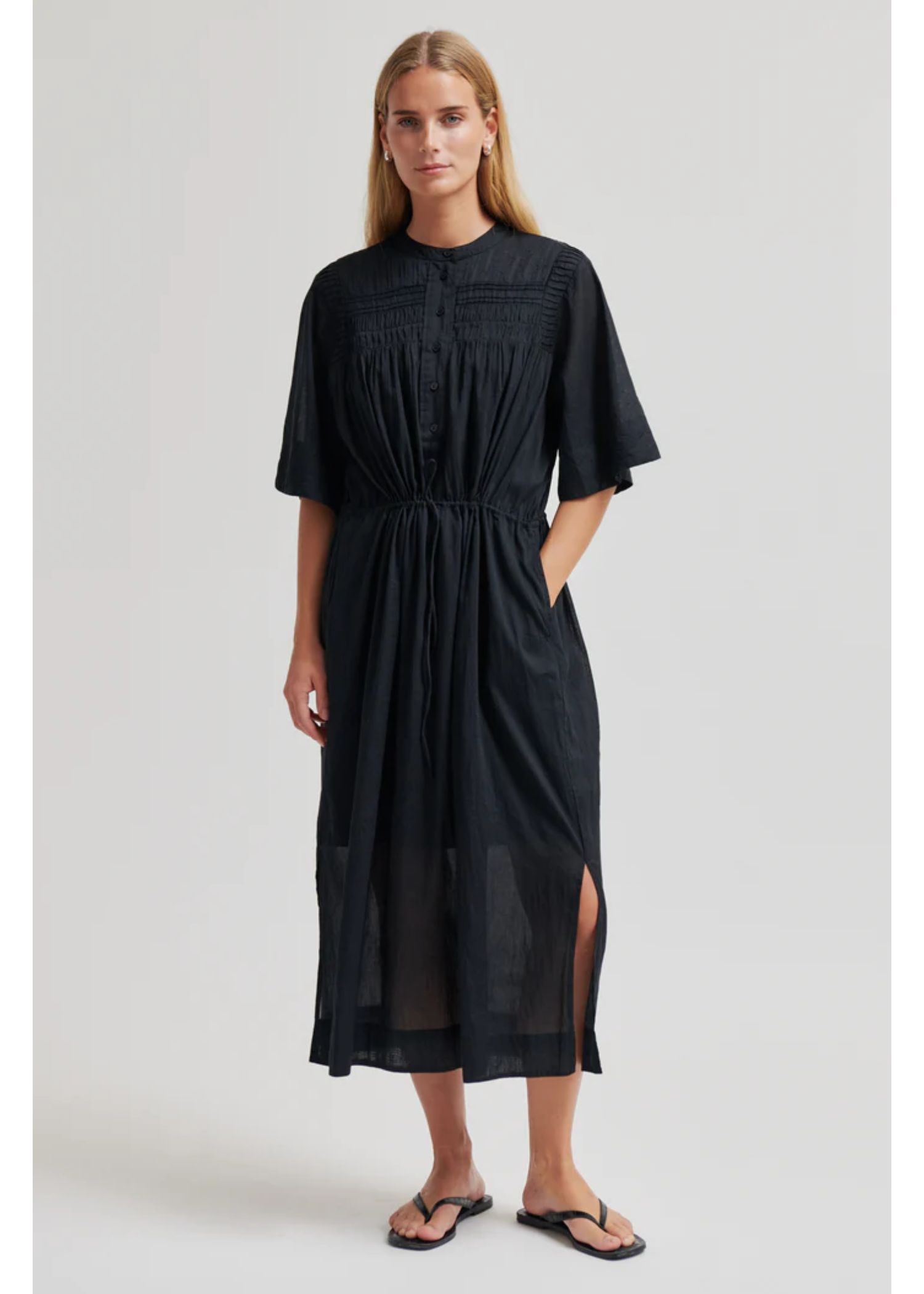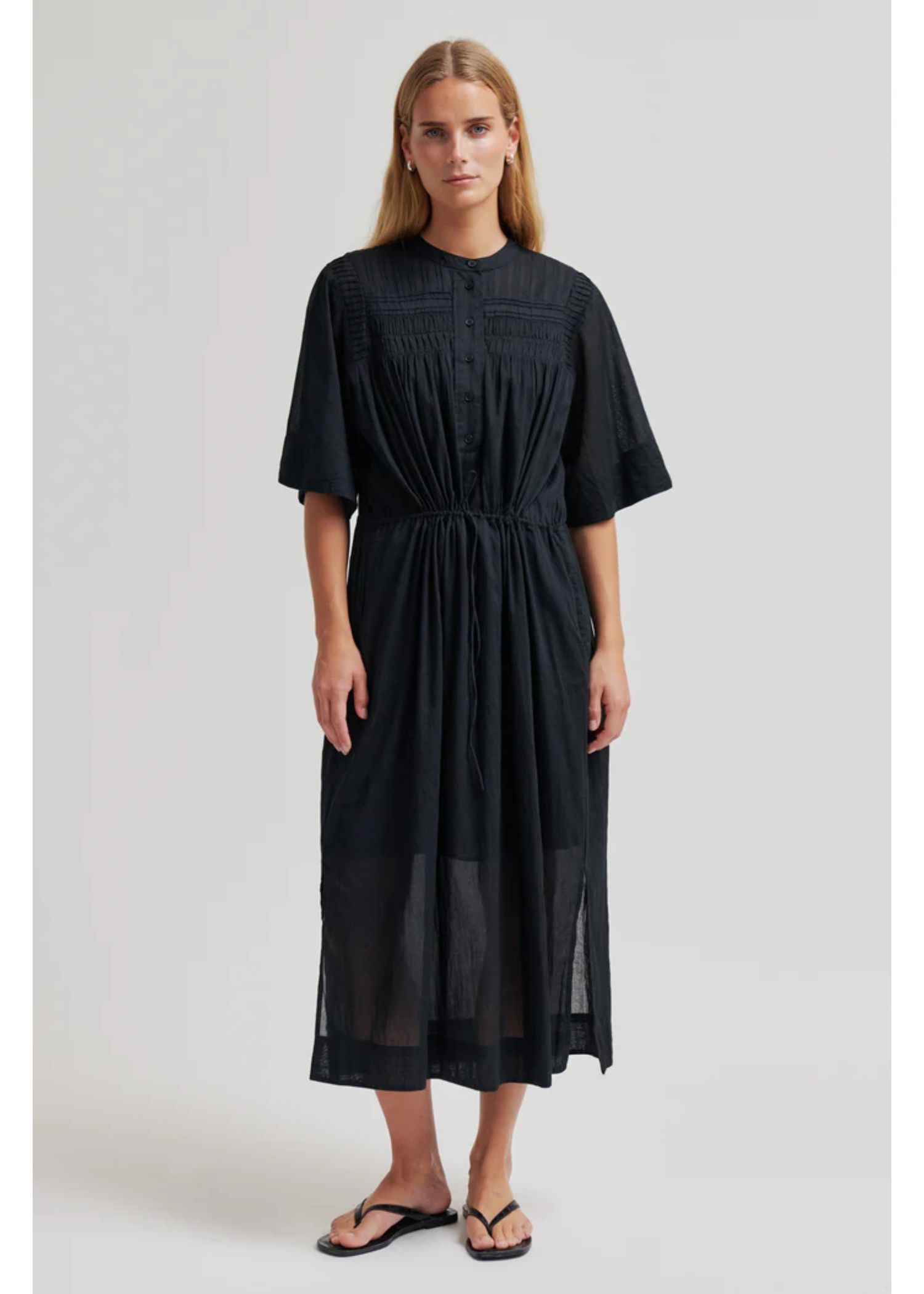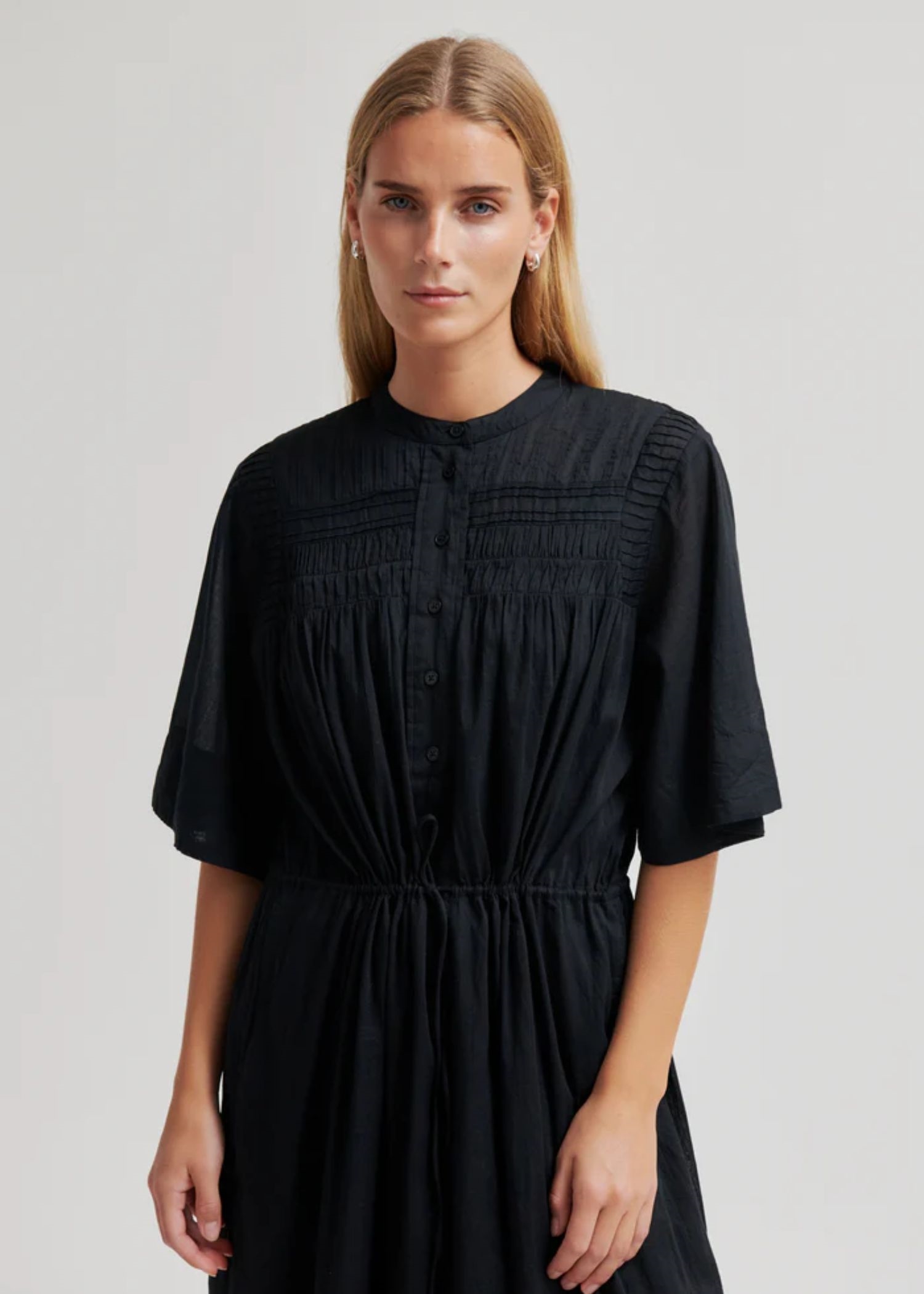 Second Female oversized kjole i sort. Kjolen er fremstillet i blød bomuld. Rund hals og knaplukning. Lodrette og vandrette stikninger på brystet. Løbegang i taljen og skjulte sidelommer. Aftagelig underkjole. Løs, bred pasform.