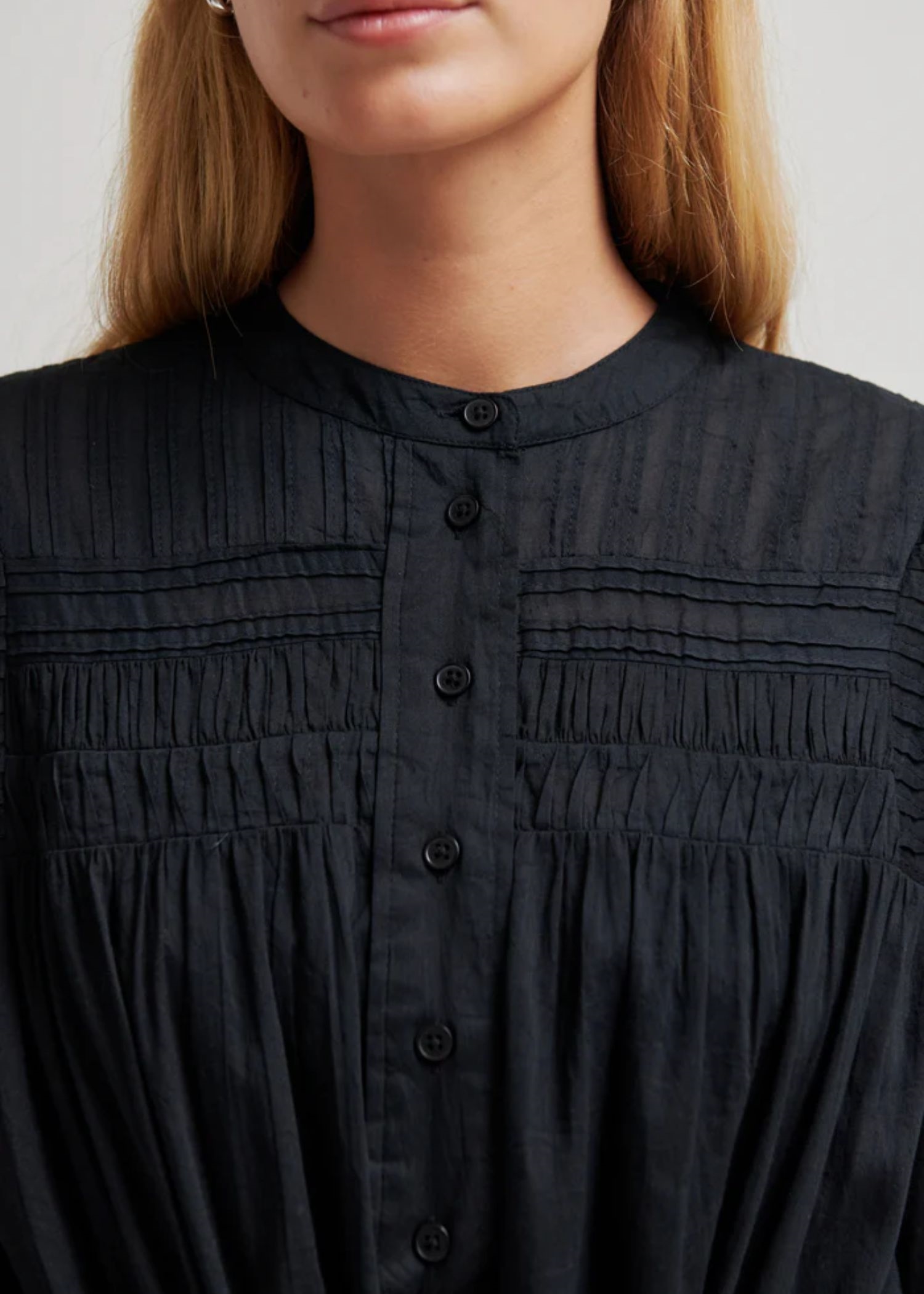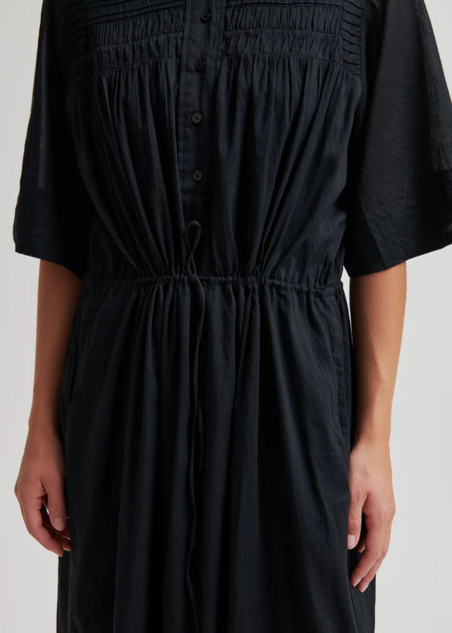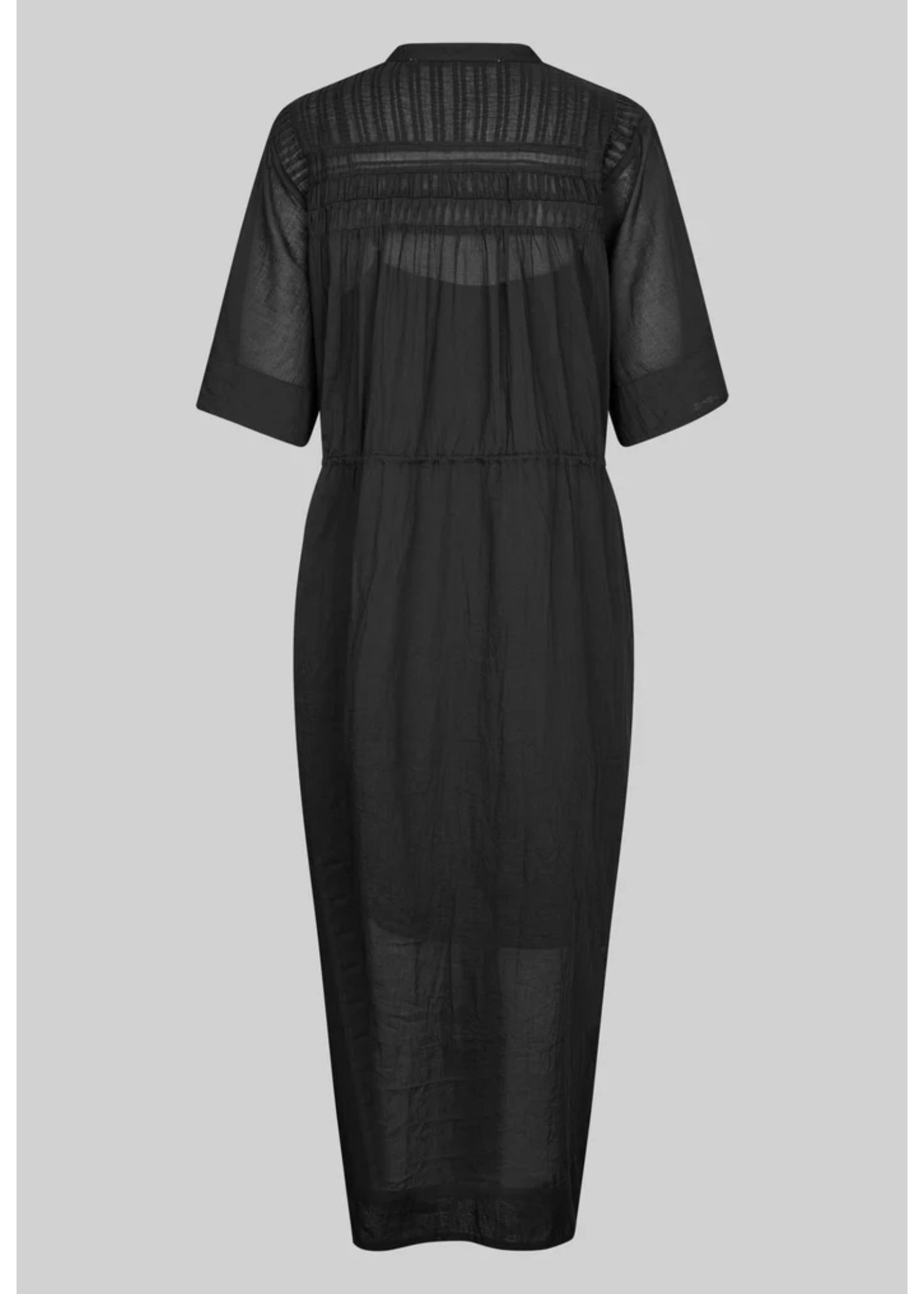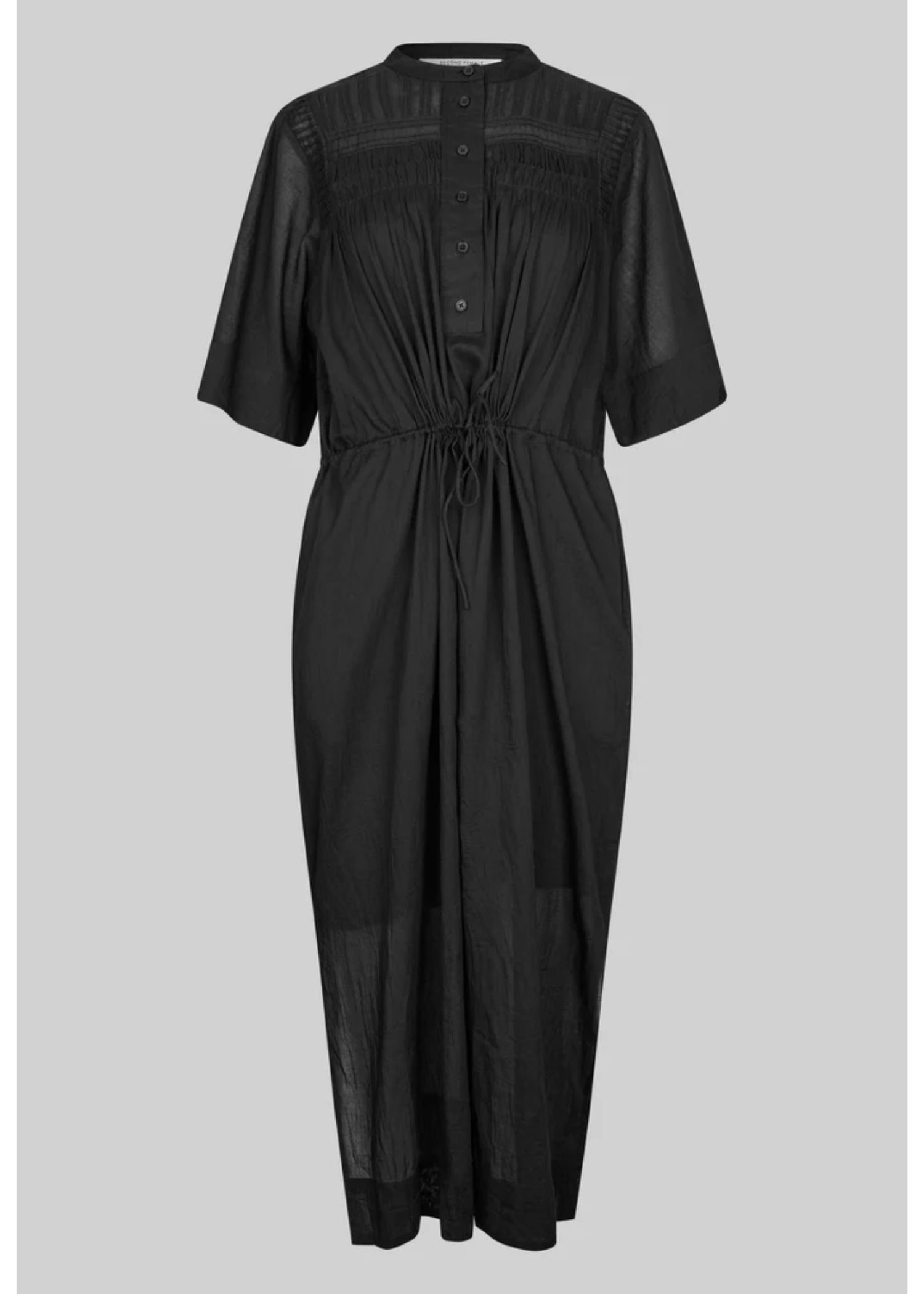 Second Female oversized kjole i sort. Kjolen er fremstillet i blød bomuld. Rund hals og knaplukning. Lodrette og vandrette stikninger på brystet. Løbegang i taljen og skjulte sidelommer. Aftagelig underkjole. Løs, bred pasform.