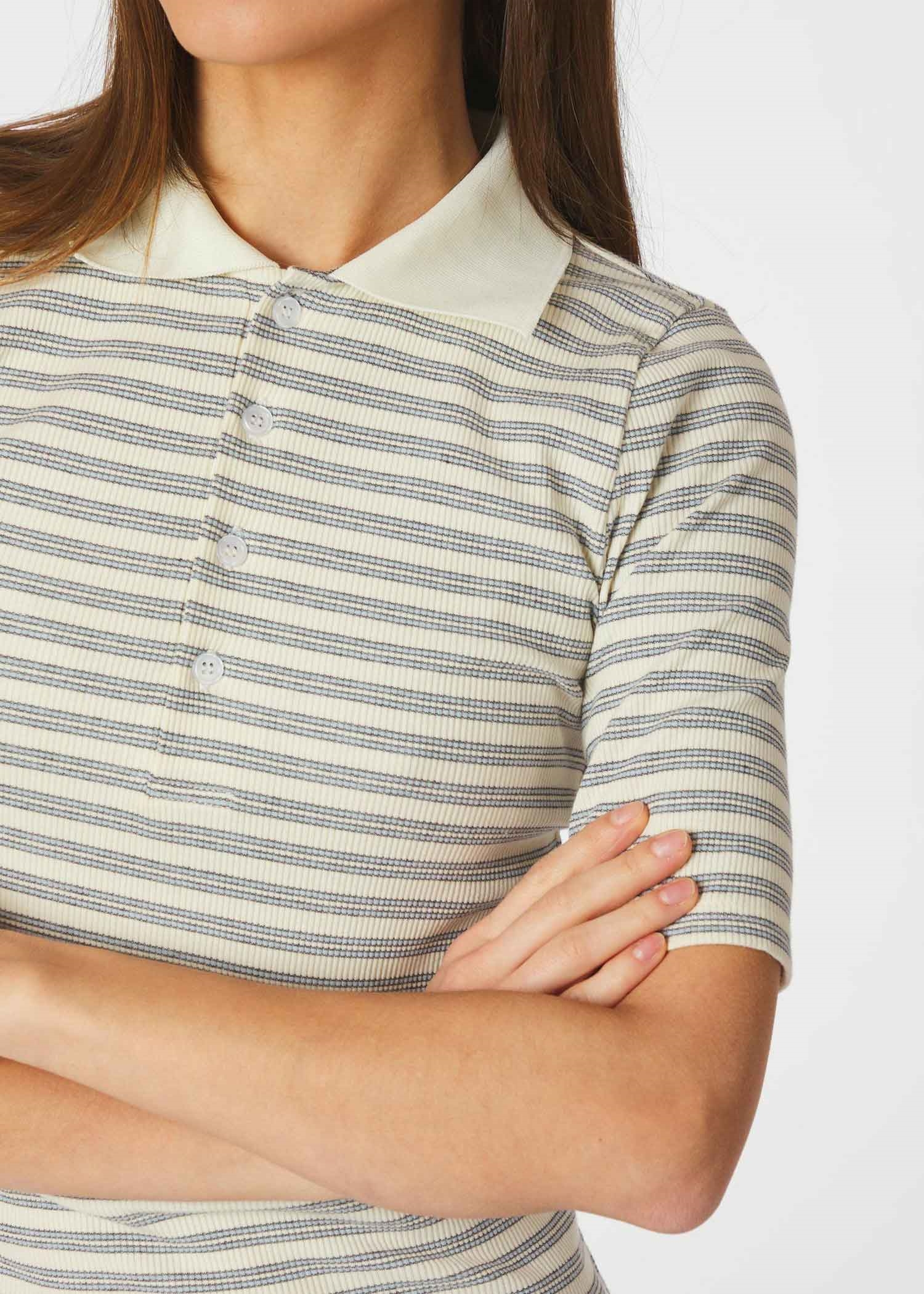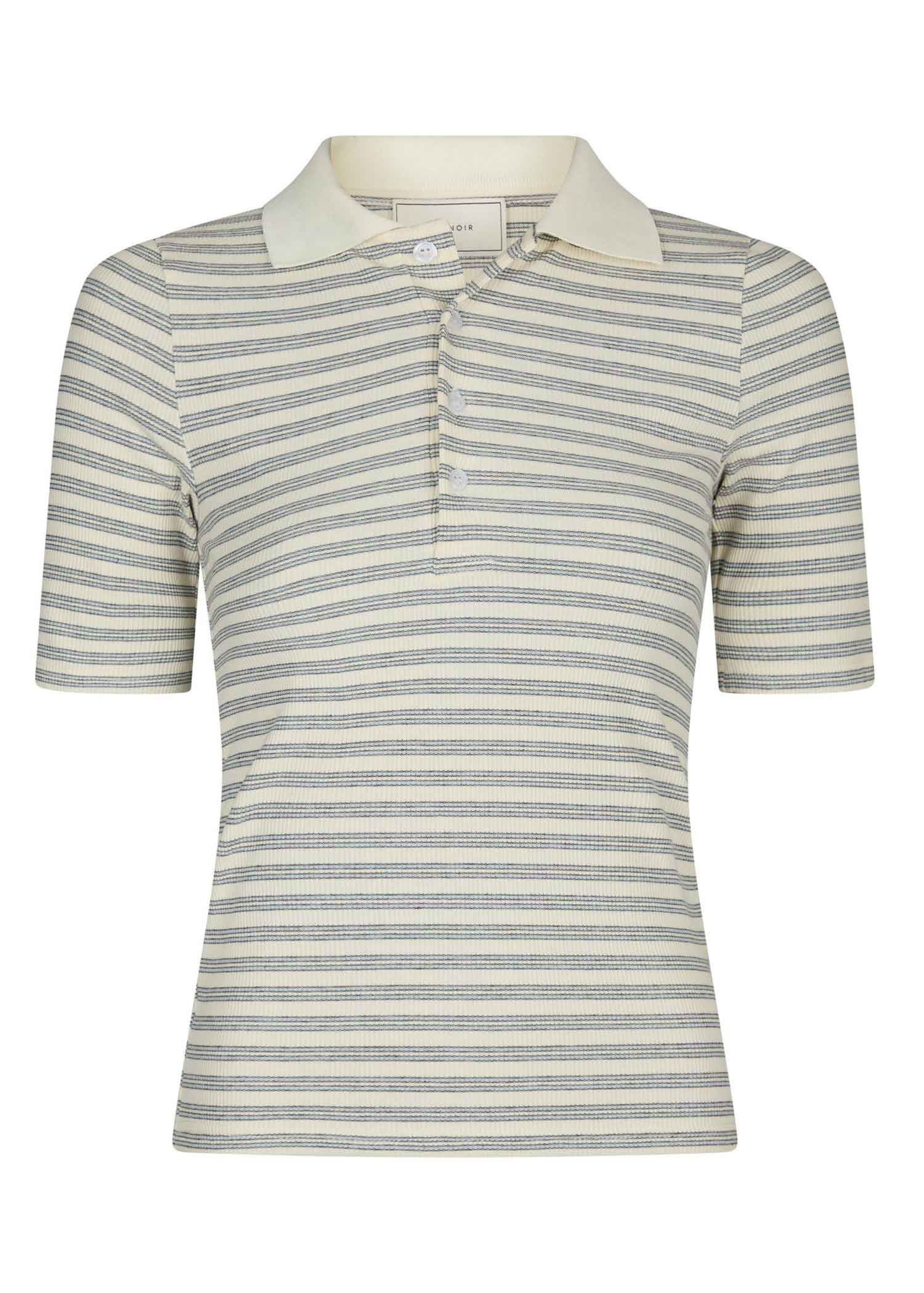 Tætsiddende off white polo bluse med lyseblå striber fra Neo Noir i en let blød bomuldskvalitet med stretch. Poloen har krave, stolpelukning foran, samt korte smalle ærmer.