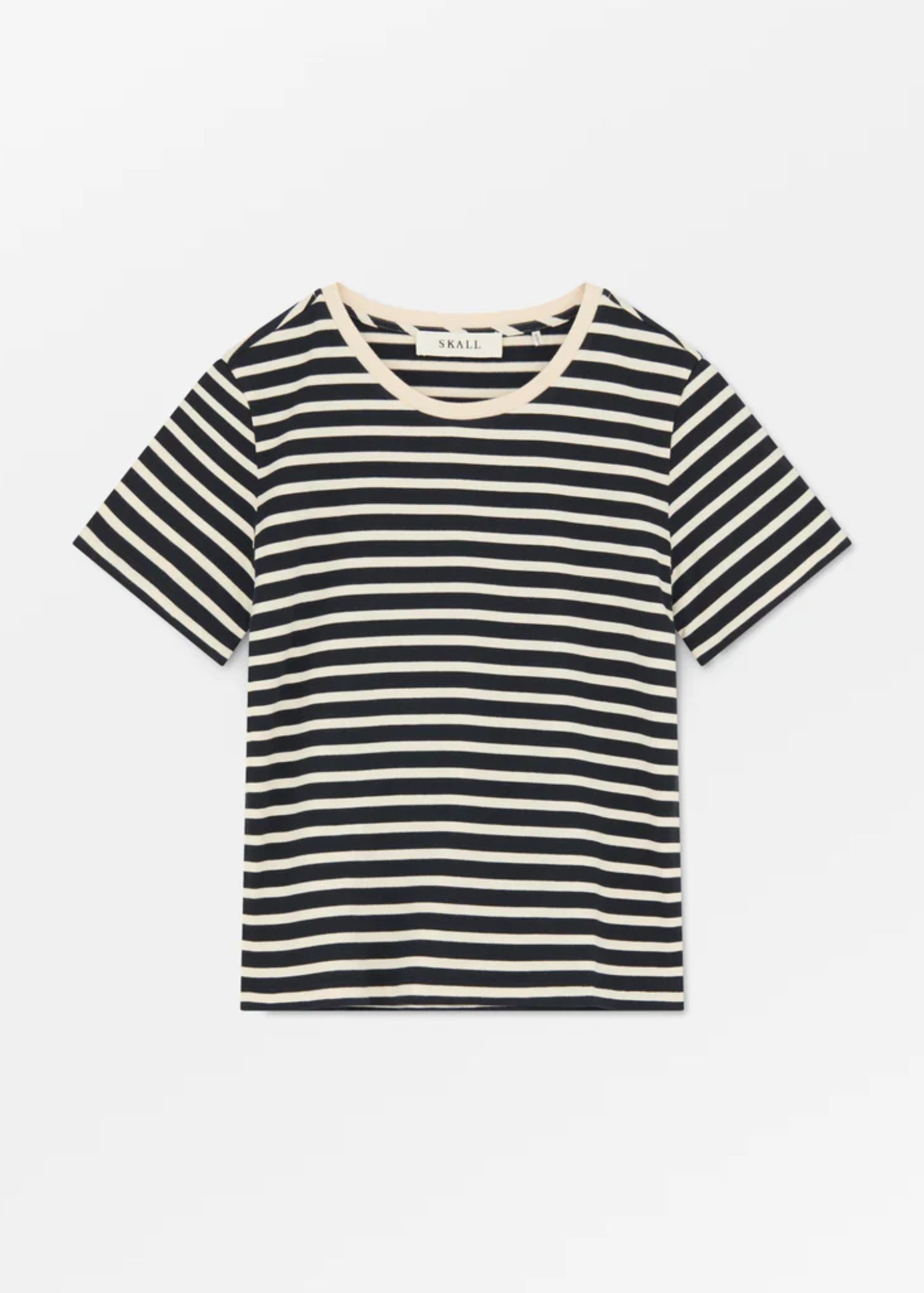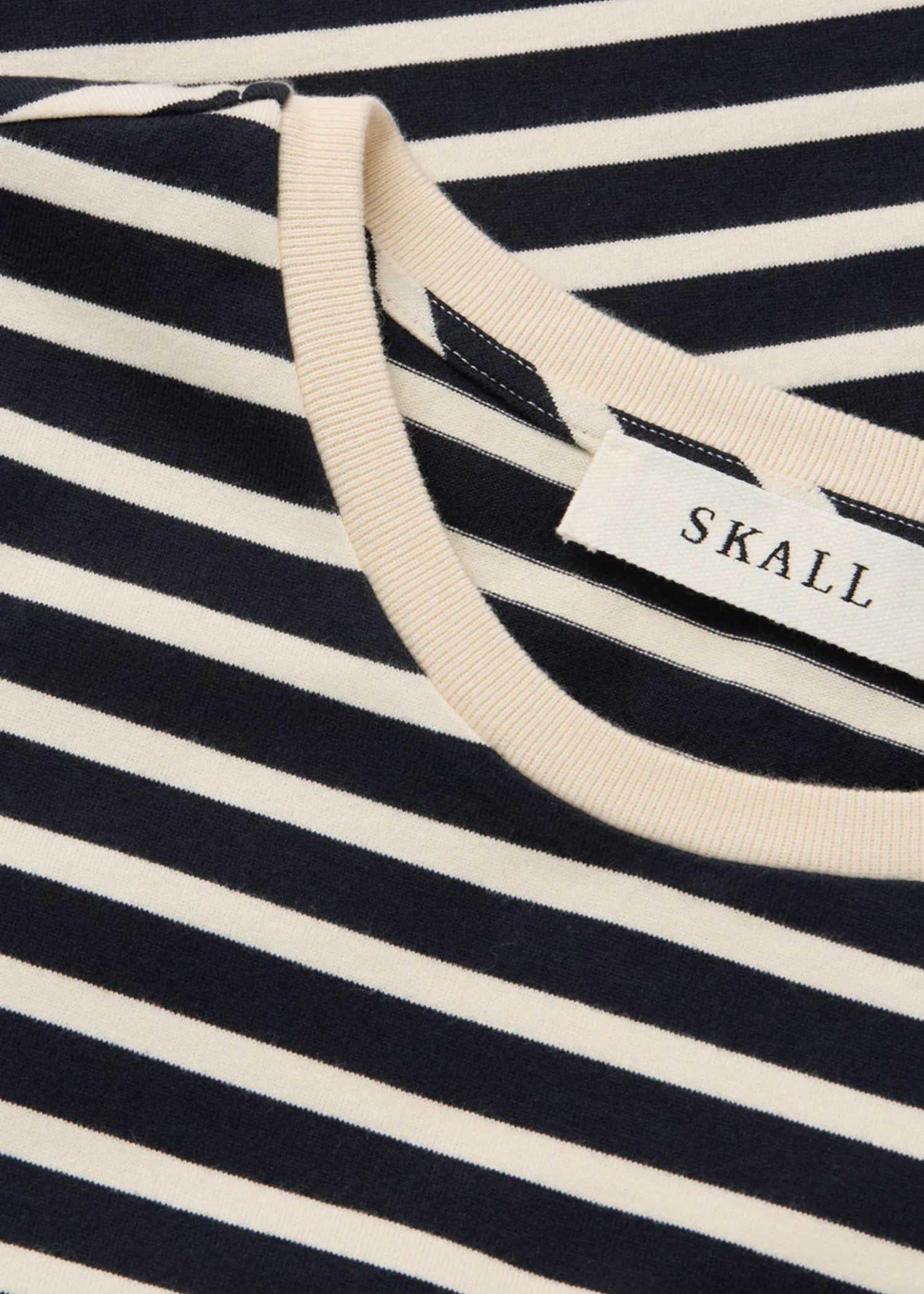 Klassisk navy/Off White stribet T-shirt fra Skall med afslappet pasform og bred rund hals.