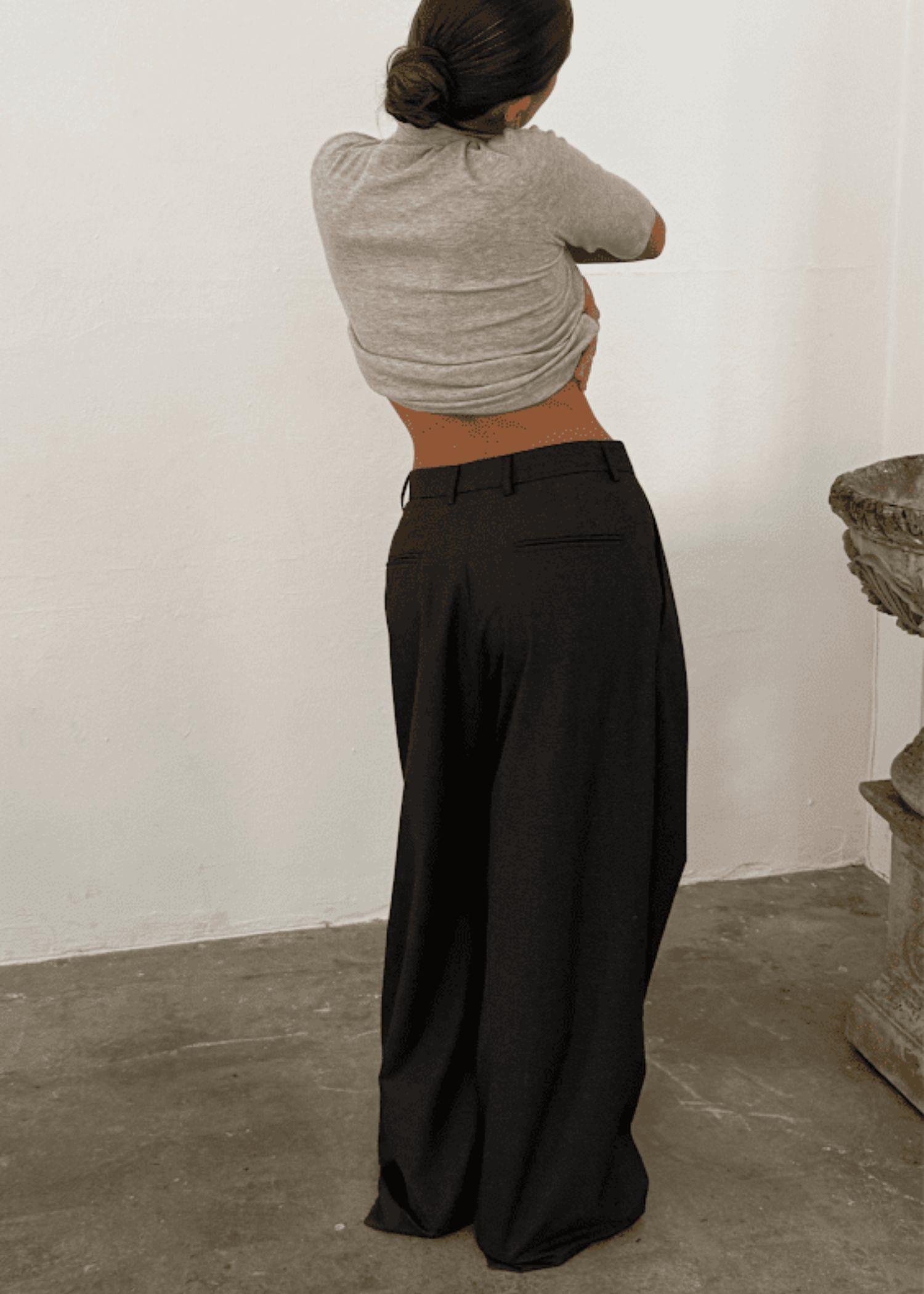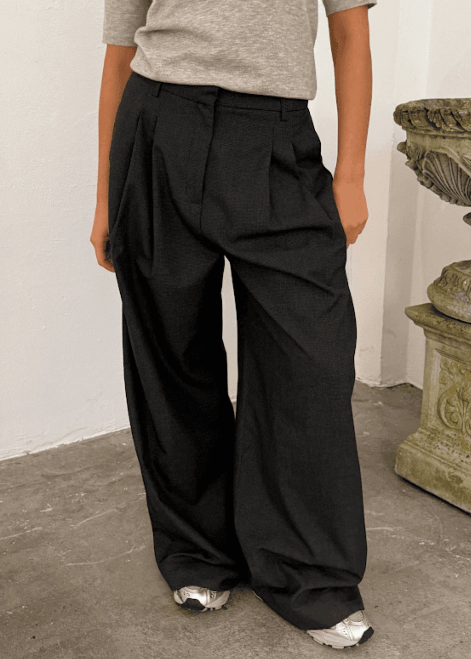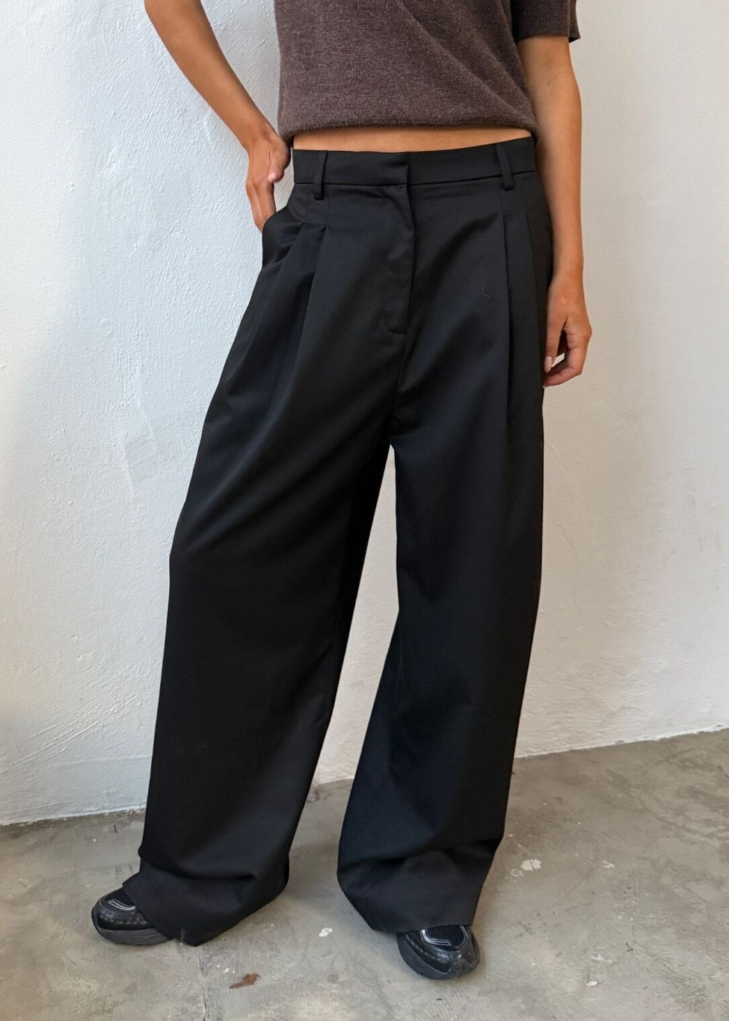 Sort buks fra Boii Studios med et løst fit med brede ben, mellemhøj talje, læg foran, lommer i siden, hægte/knap/lynlås lukning, samt paspolerede baglommer.