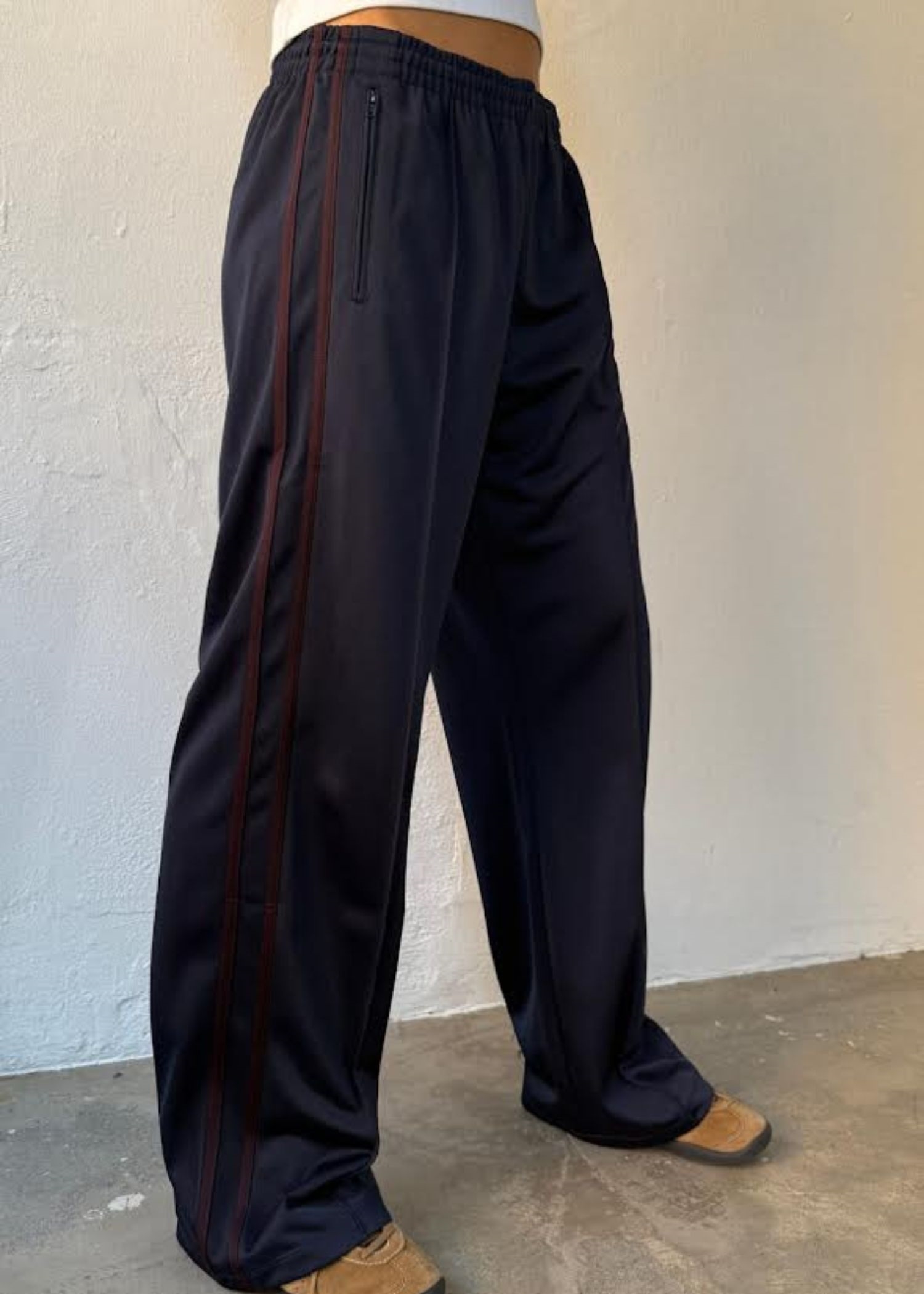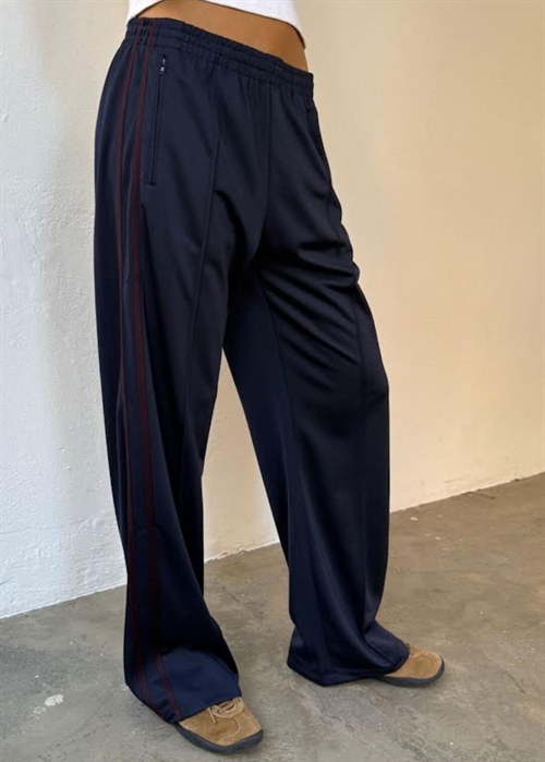 Navy track buks fra Boii Studios med bordeaux striber i siden.
