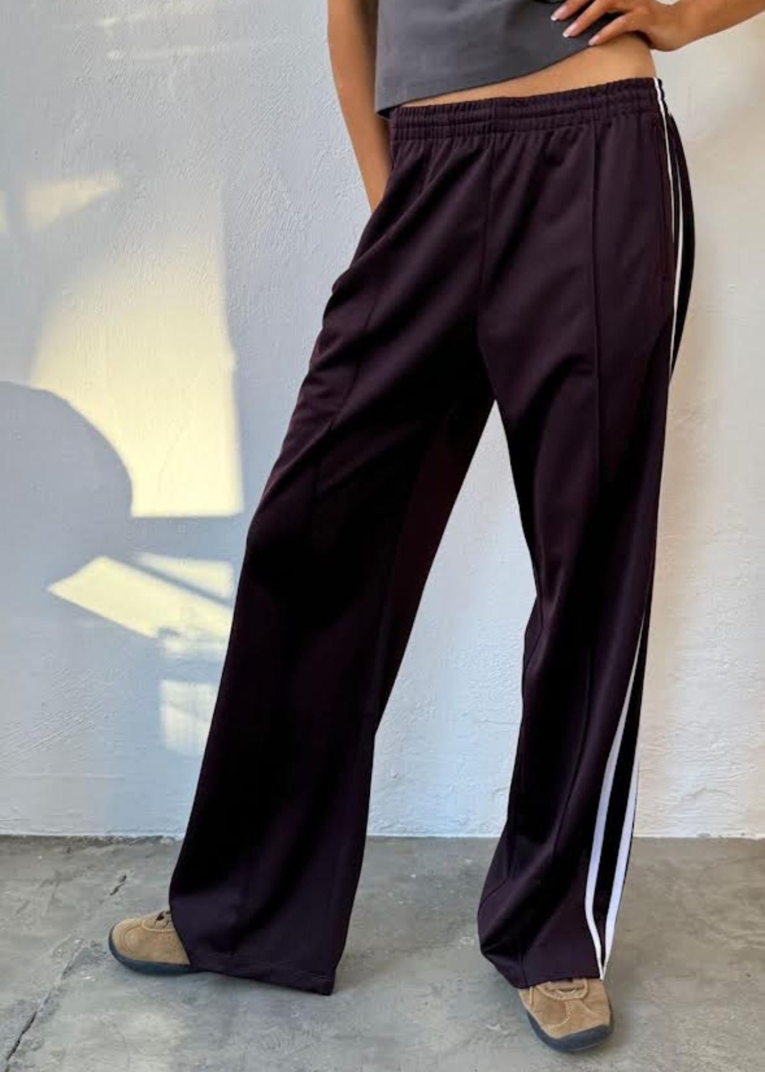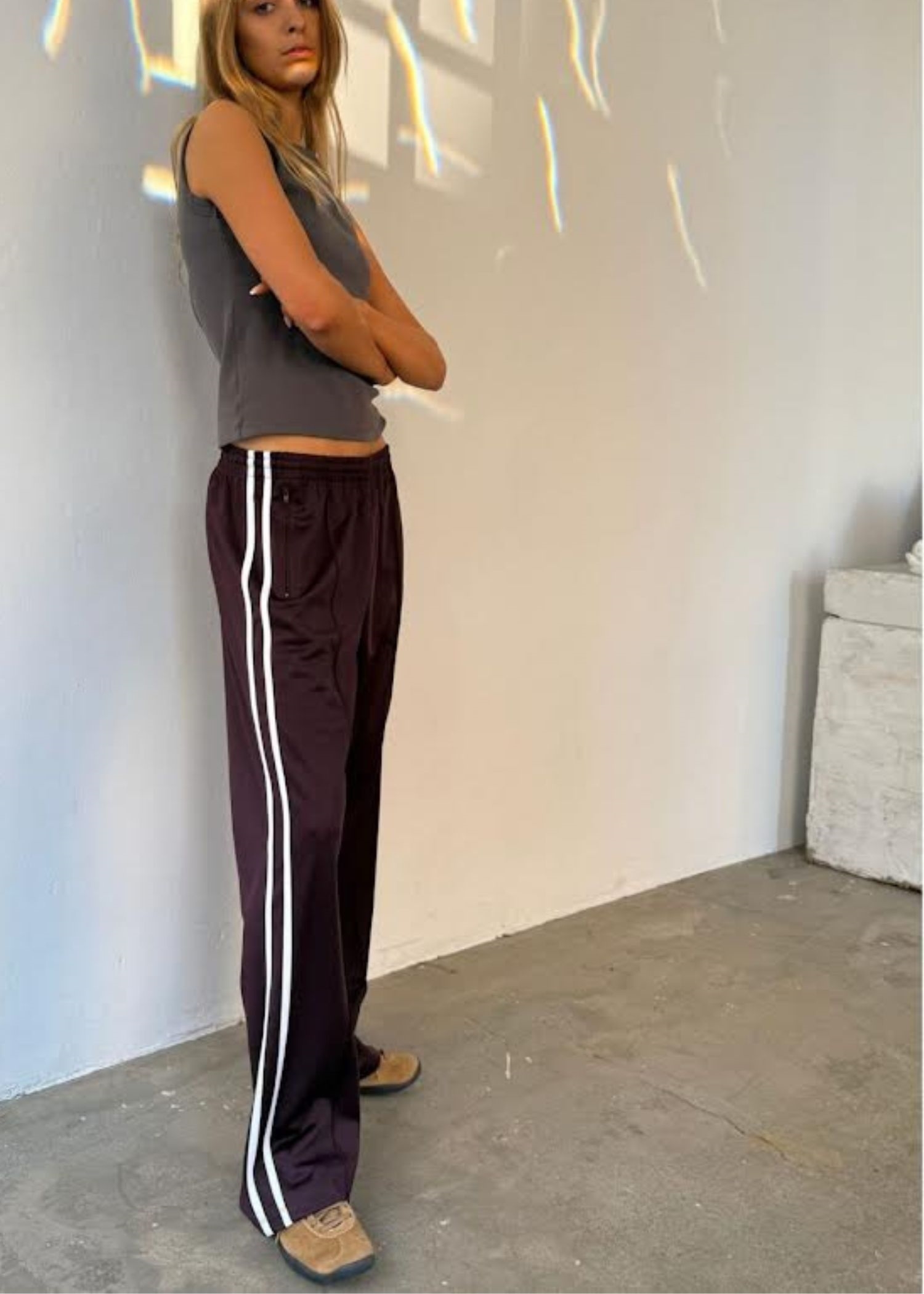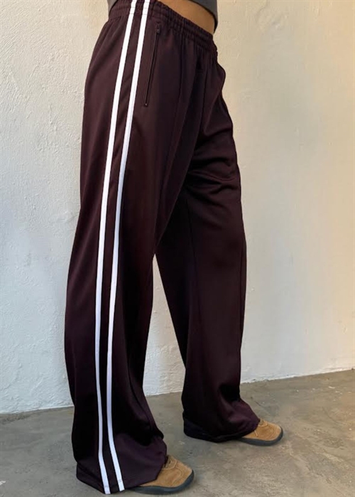 Bordeaux track buks fra Boii Studios med hvide striber i siden.