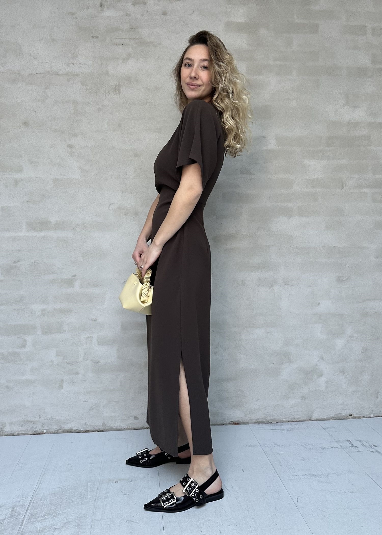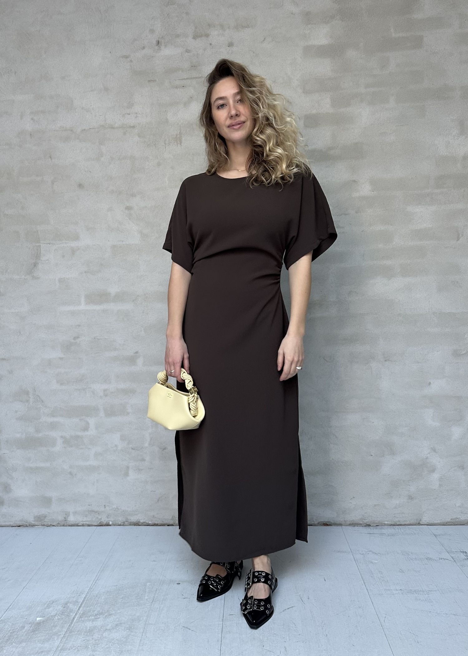 Mørkebrun midi kjole fra Neo Noir med draperinger i taljen, korte løse ærmer, skjult lynlåslukning i ryggen, samt slidser i siderne.