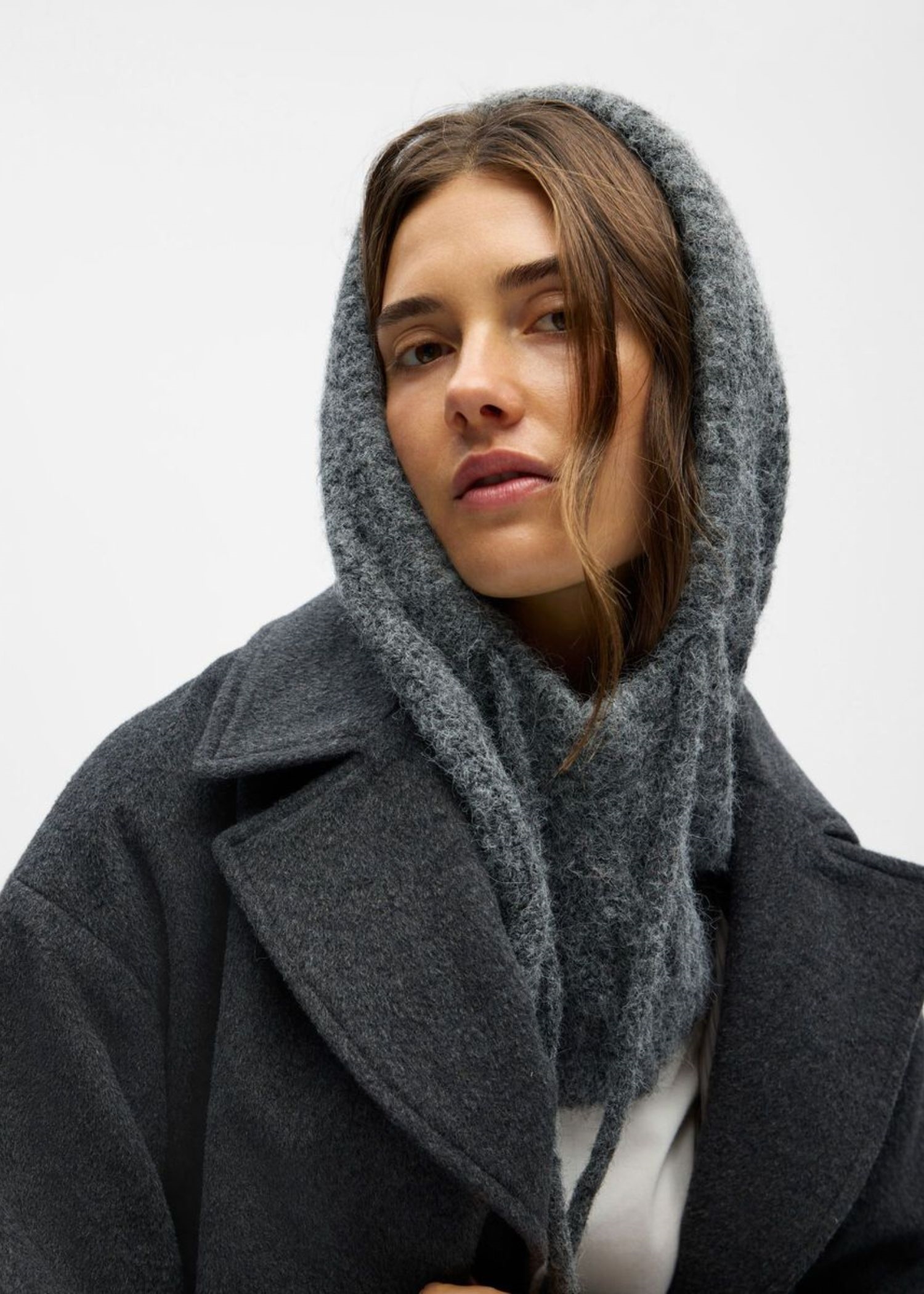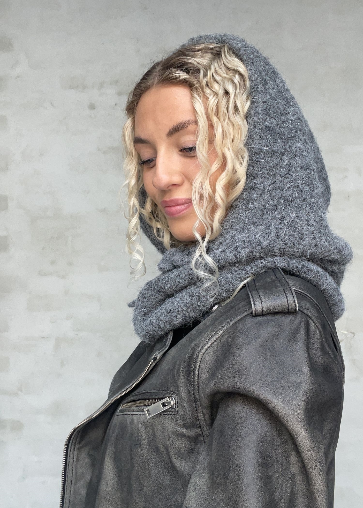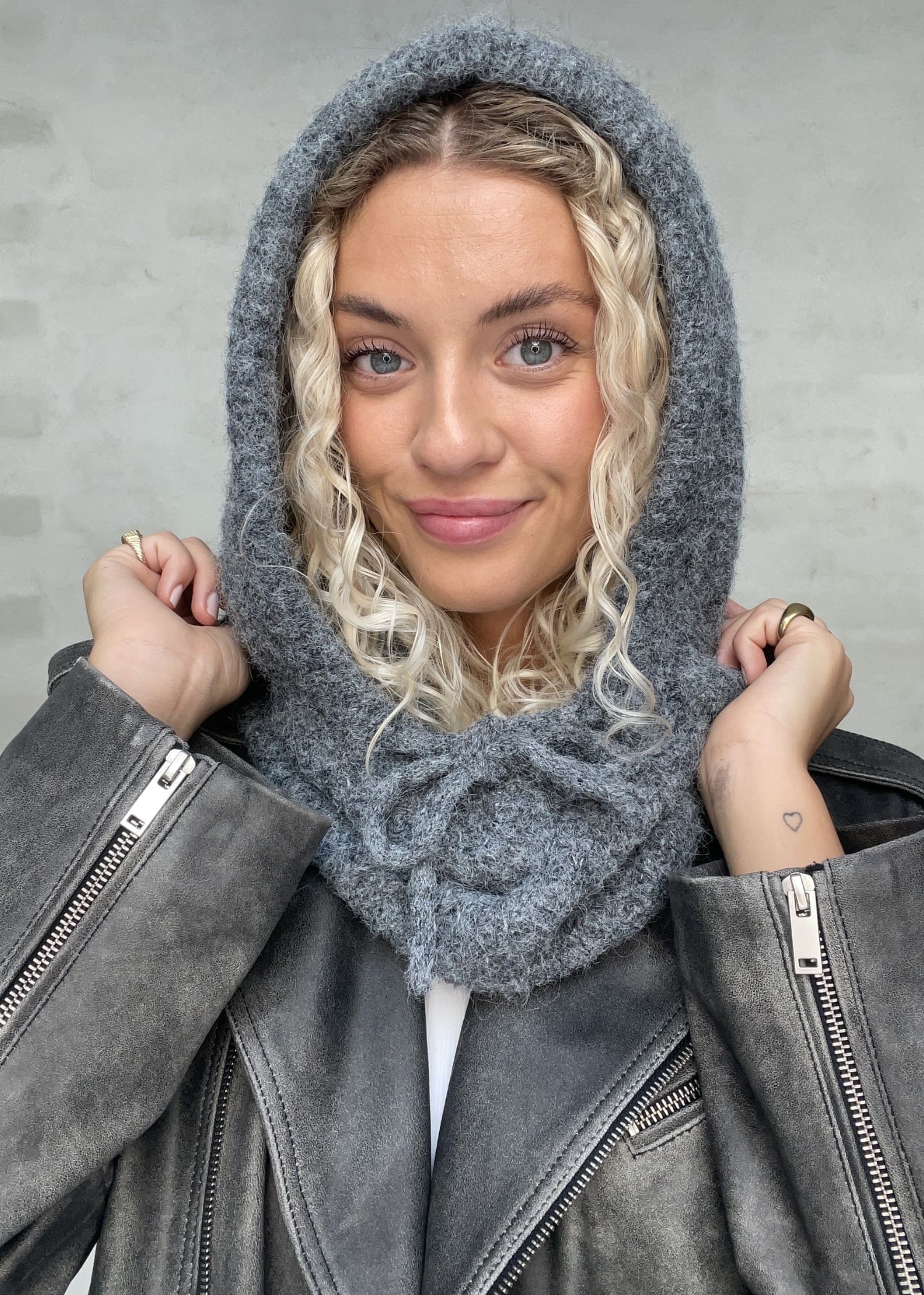 Koksgrå balaclava fra Object i en blød vamset strikkvalitet med indvendig snøre i halsen, så den kan spændes ind.
