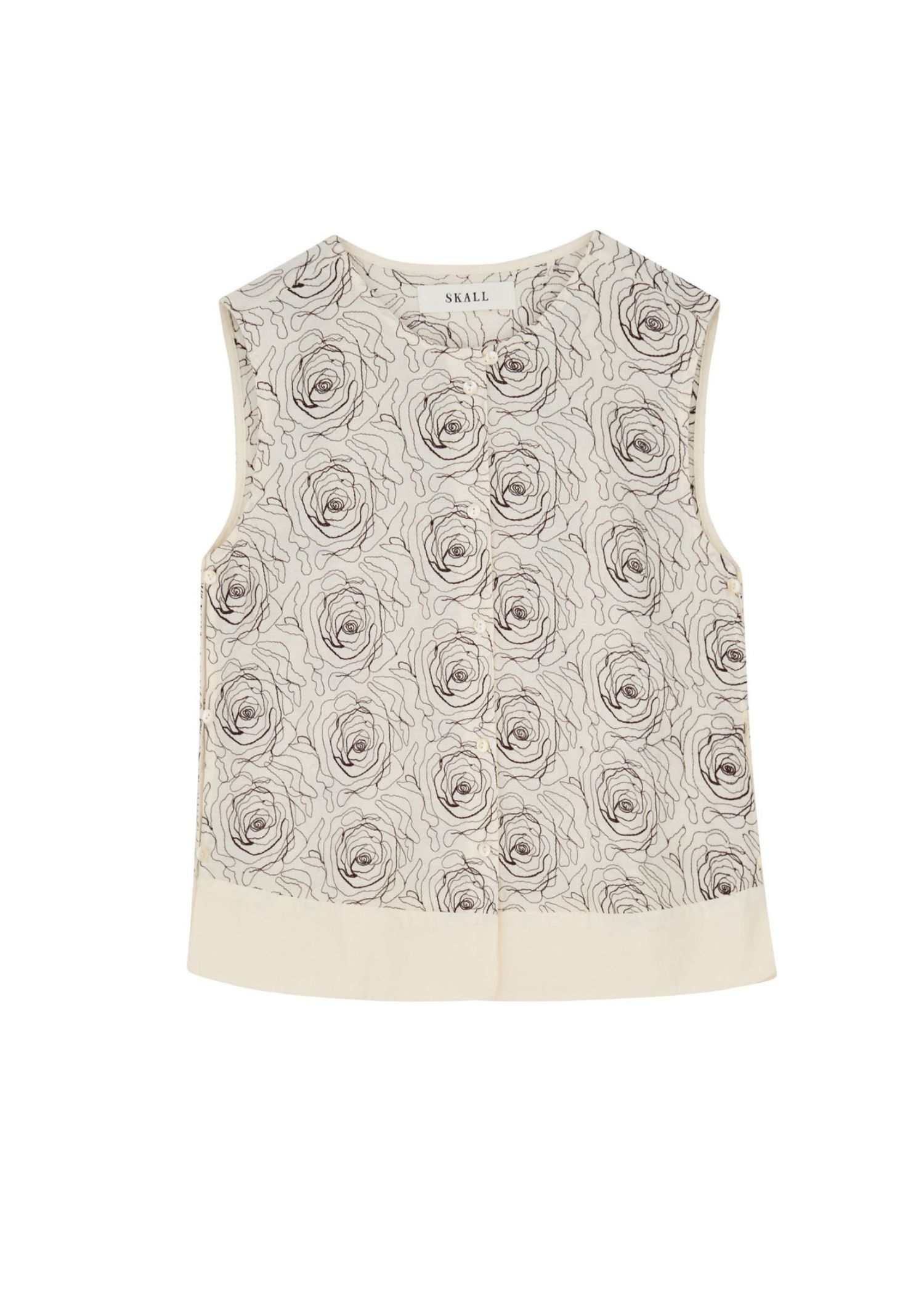 Off white hør top fra Skall med fuldbroderet rosemønster i mørkebrunt.