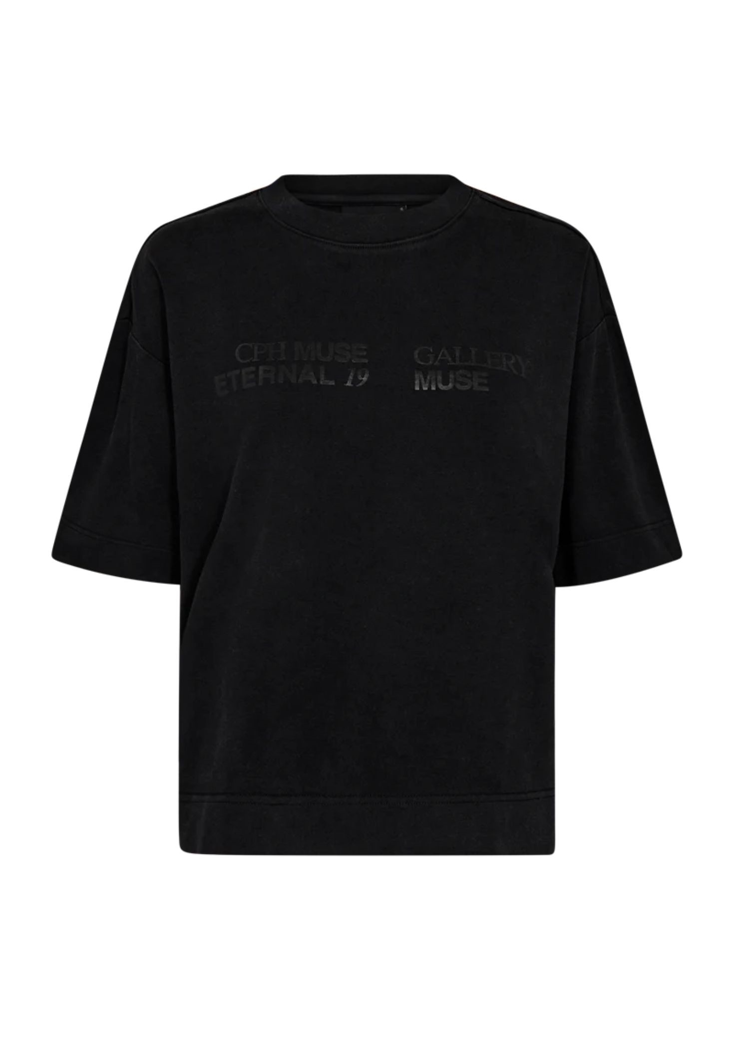 Sort kort oversized T-shirt fra Copenhagen Muse i en eksklusiv kvalitet med en rund halsudskæring, drop shoulders samt et elegant, skinnende logo print på brystet.