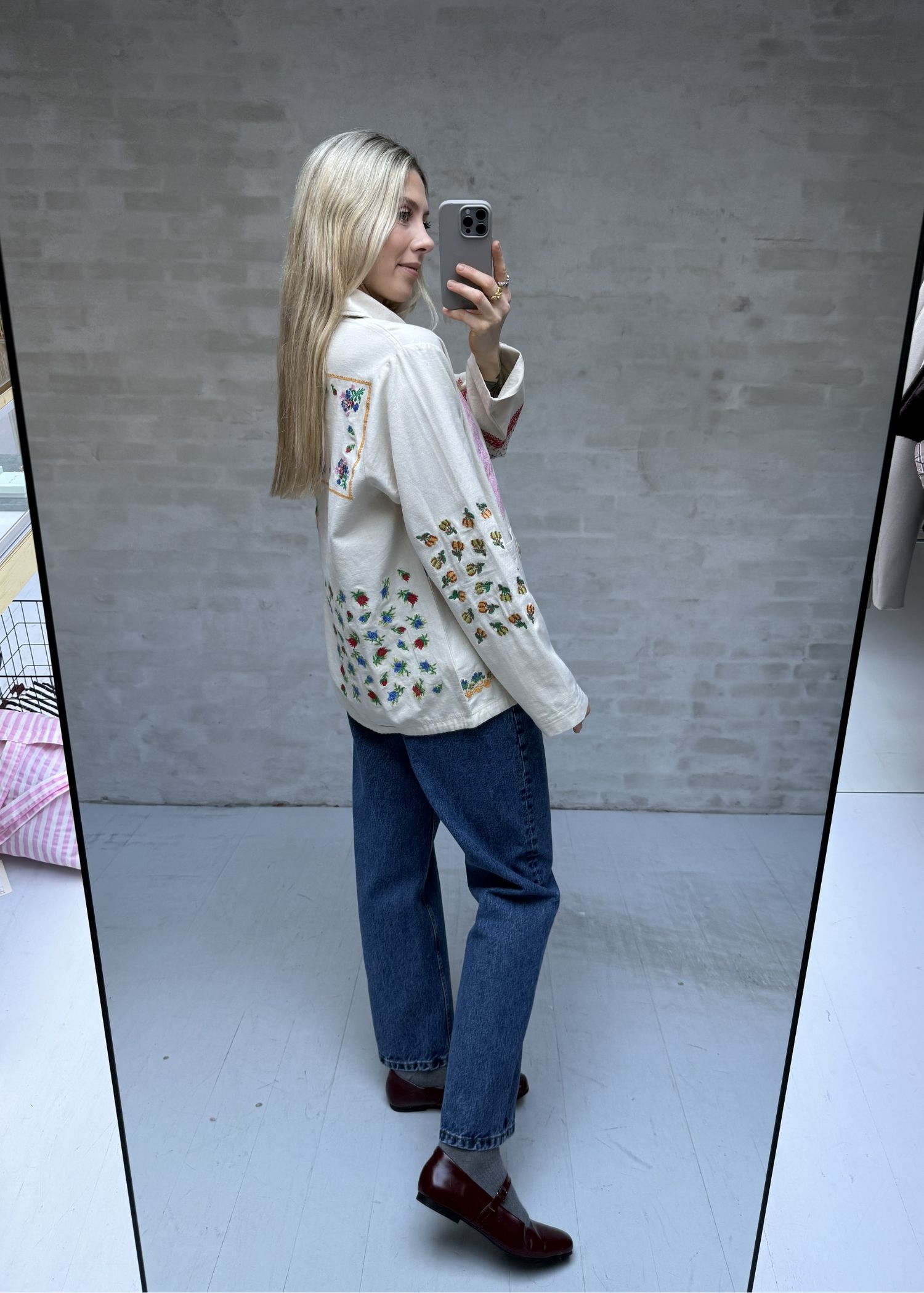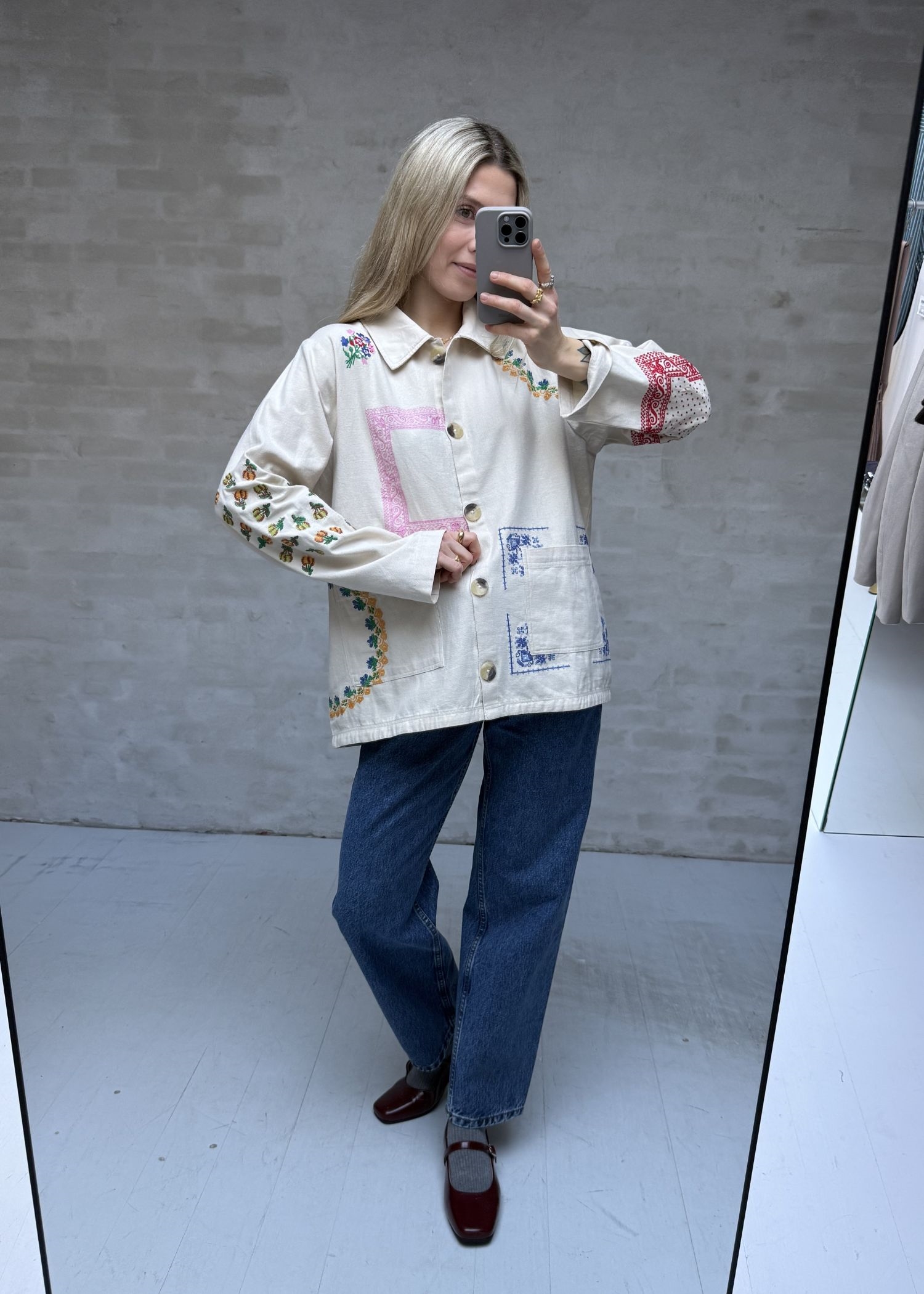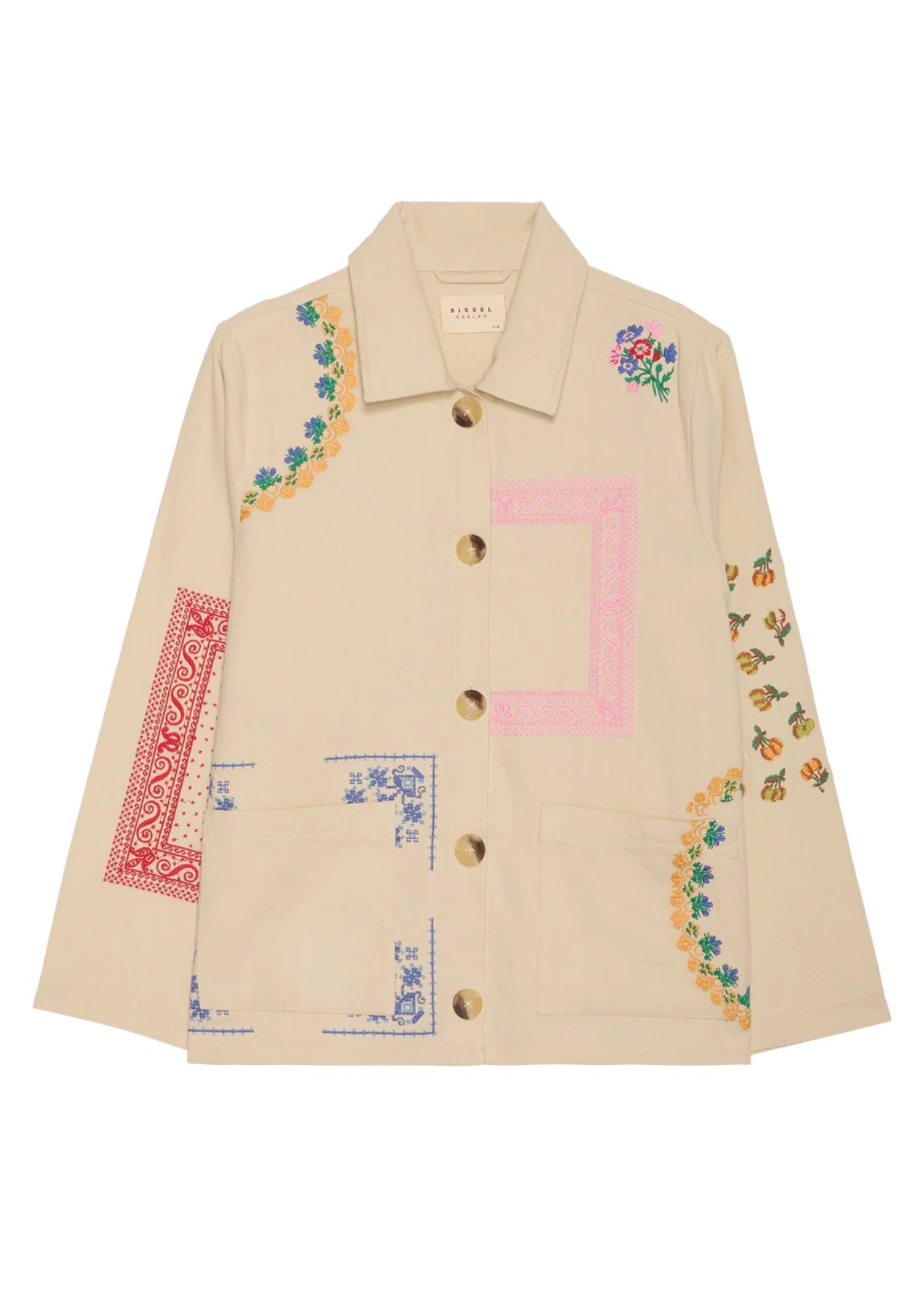 My-jakken fra Sissel Edelbo er fremstillet i 100 % økologisk bomuldscanvas og har en afslappet pasform. Jakken har en lille skjortekrave og lange ærmer. Den har to lommer og en stolpelukning foran med knapper i benlook. Jakken er dekoreret med farverigt og poetisk broderet artwork, inspireret af vintage-servietter.