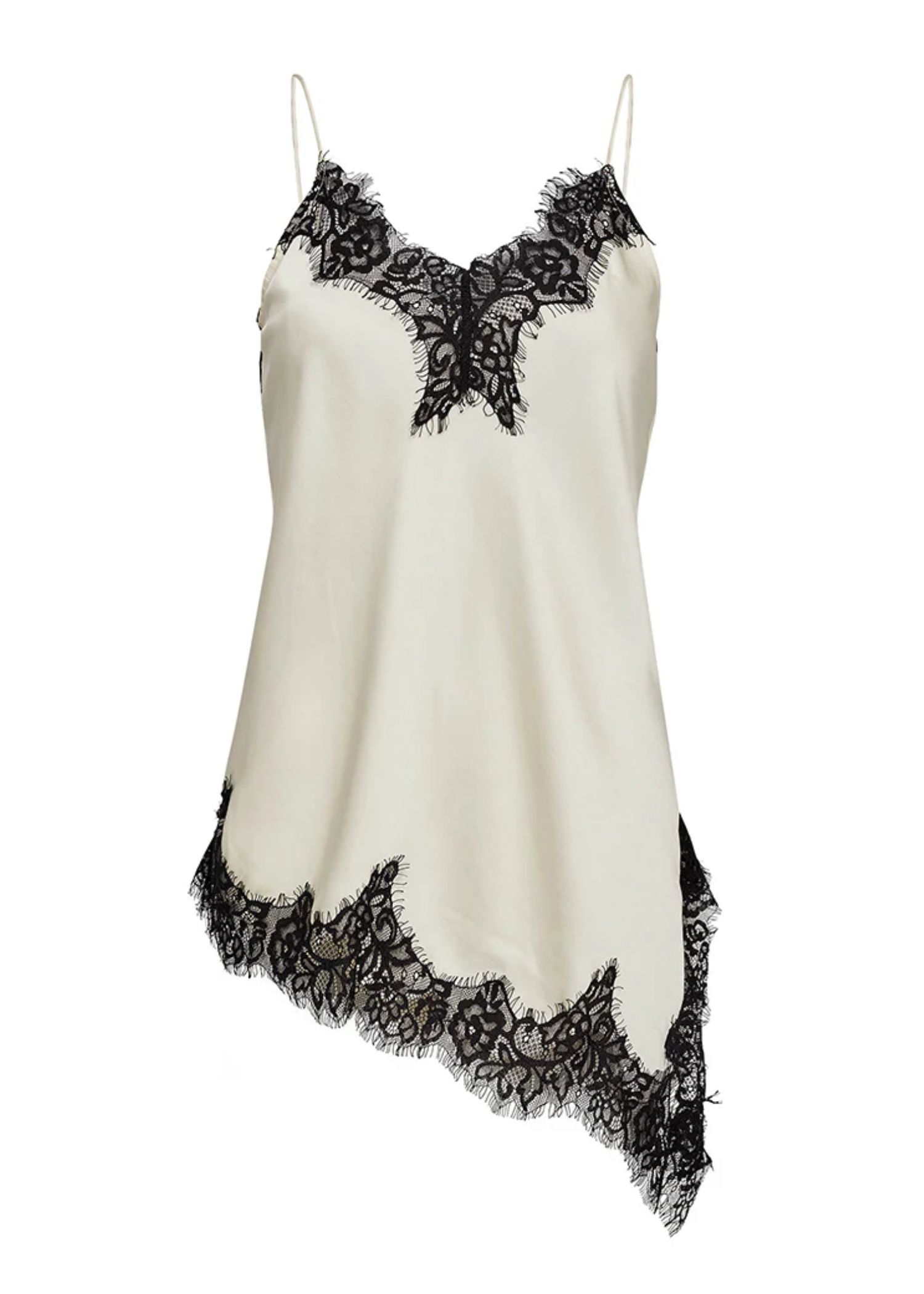 Off White asymetrisk lingerie top fra Haute L'Amitie med sort lace og regulerbare stropper.