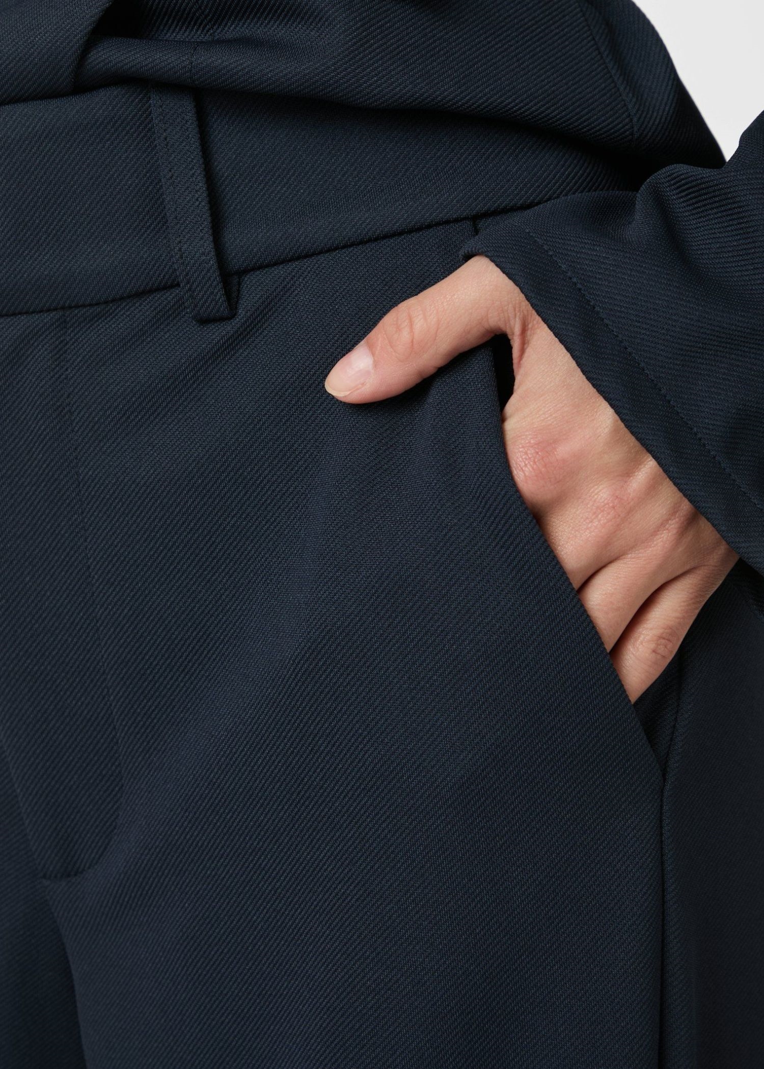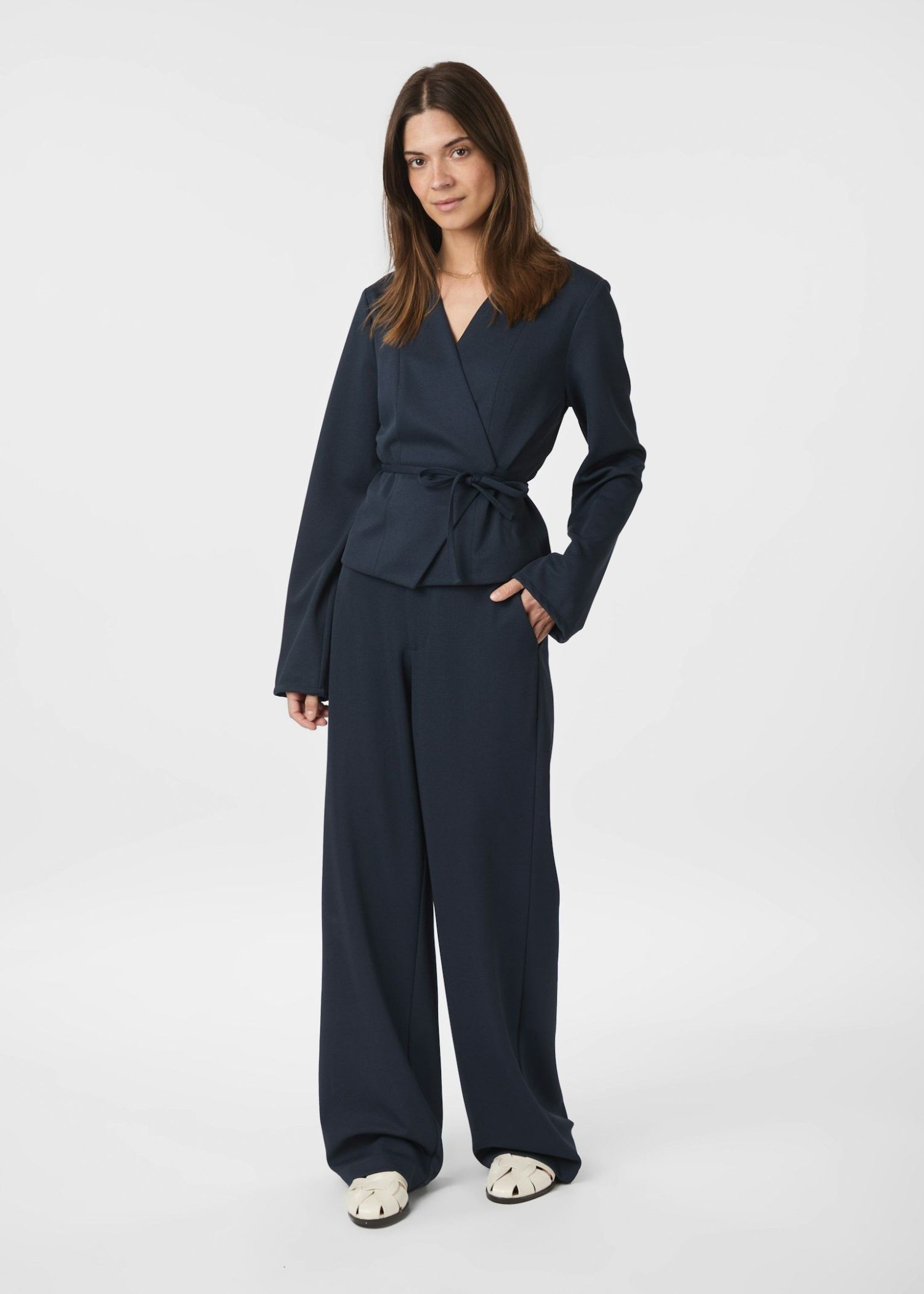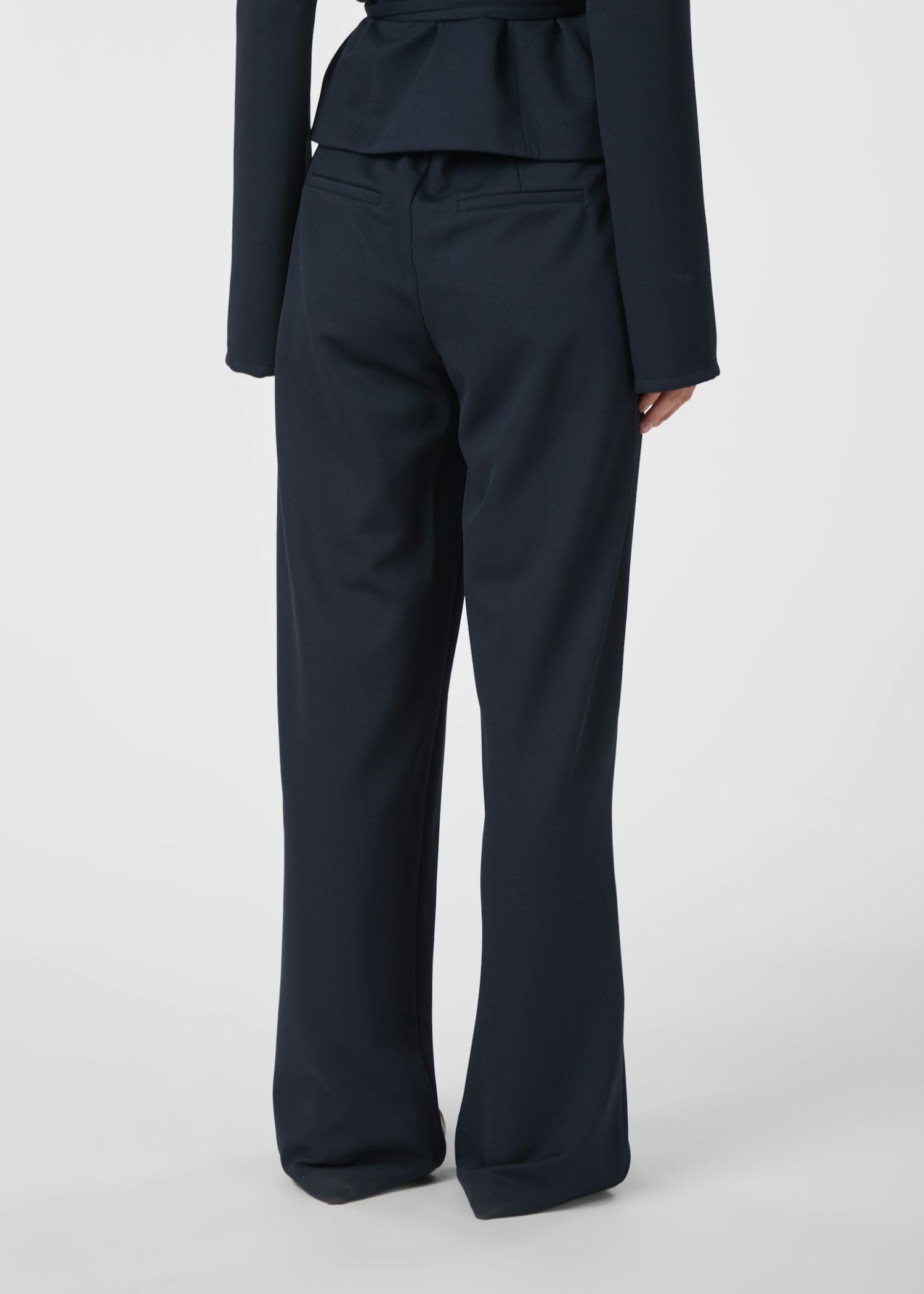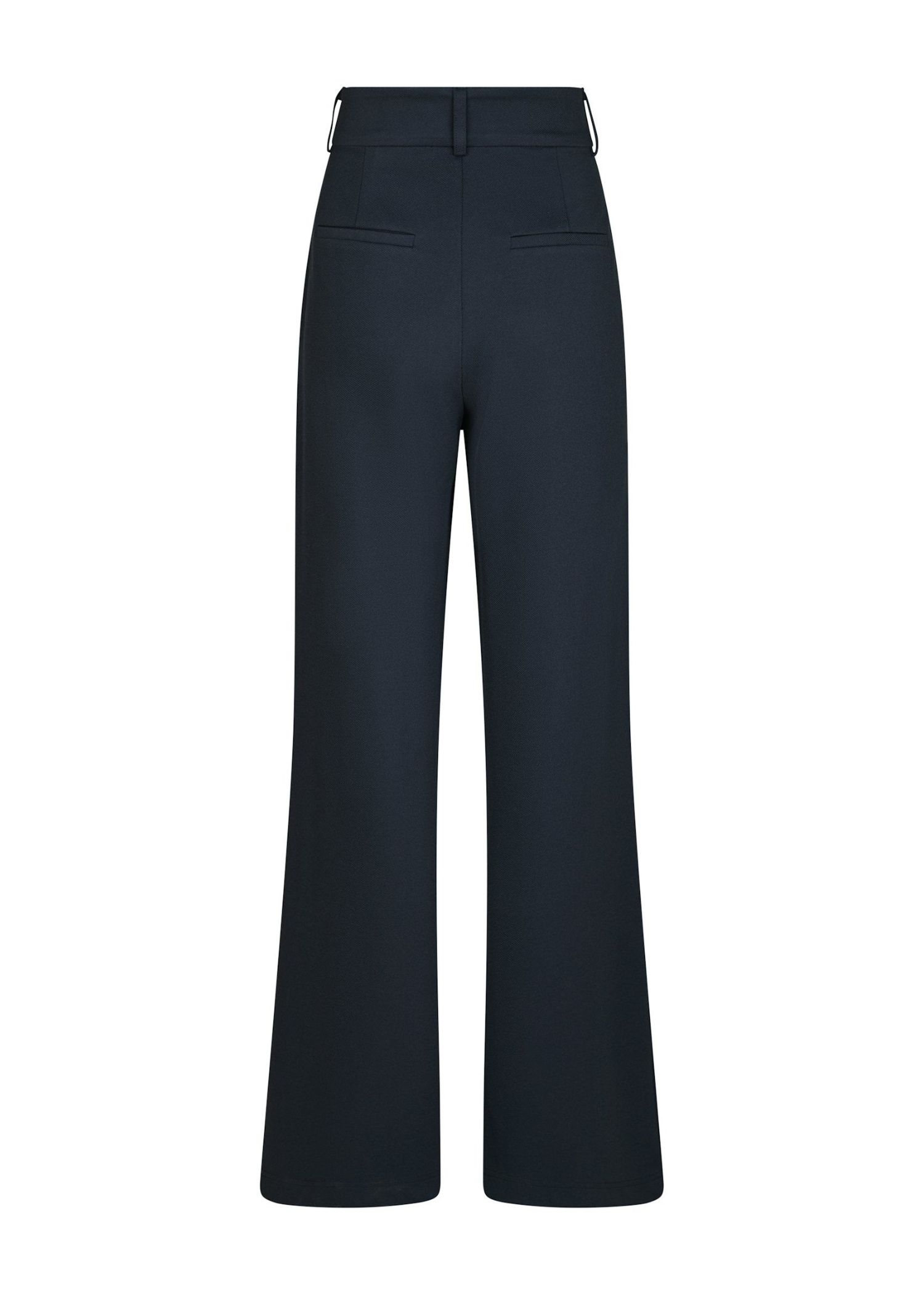 Navy buks fra Neo Noir i en kraftig polyester kvalitet med stretch. Buksen har lige løse ben, fast linning med skjult hægte/knap/lynlåslukning med bæltestropper, paspolerede baglommer, samt lommer i siden.