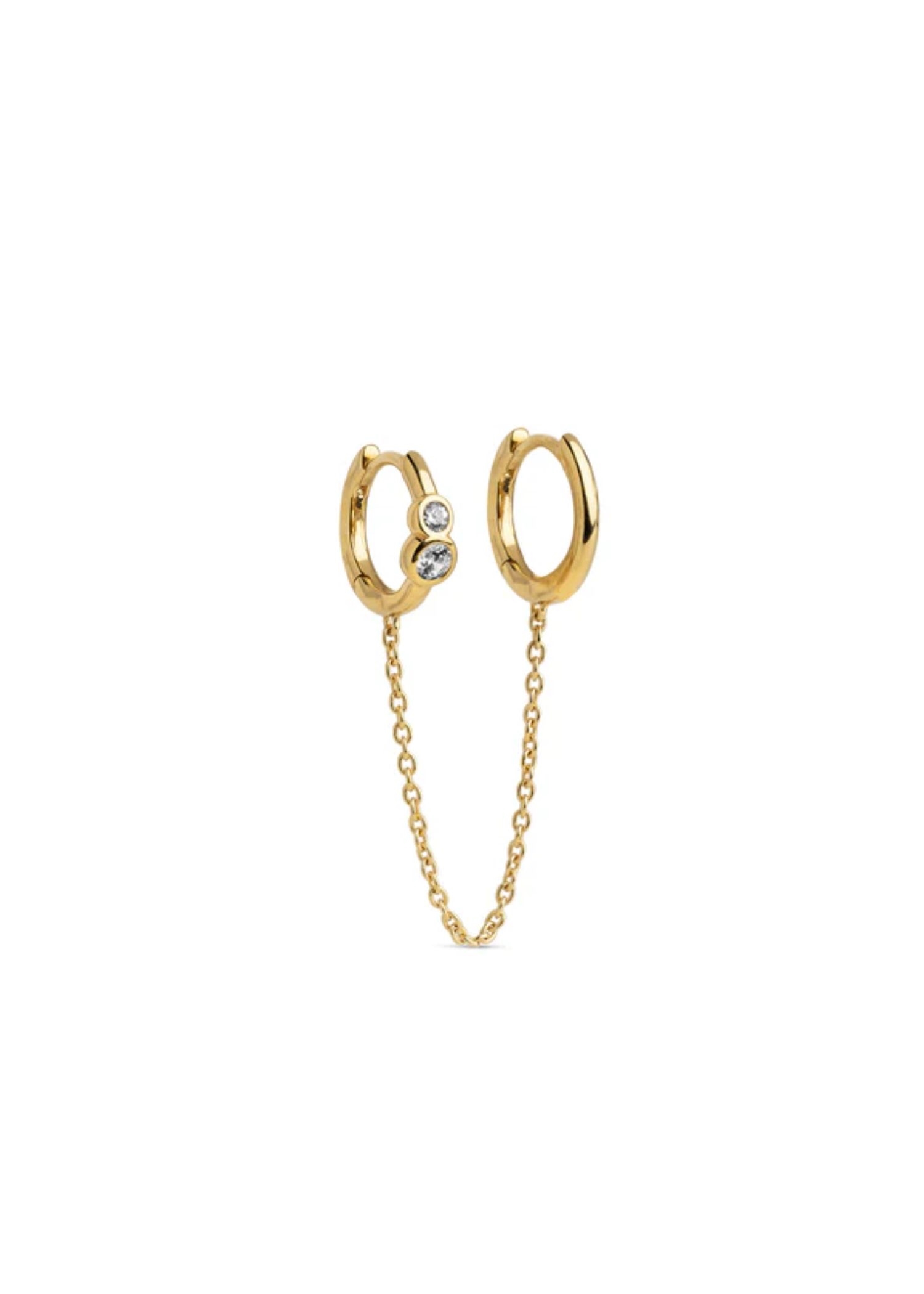 Nova Chain Hoops fra Enamel er en moderne fortolkning af den klassiske hoop – med et overraskende twist. Denne unikke double hoop earring består af to små, blankpolerede hoops forbundet af en fin kæde, der skaber illusionen af to separate øreringe, men i virkeligheden hænger sammen som én. Den ene hoop er prydet med to klare zirkonia-sten, som tilfører glans og elegance. Designet er særligt skabt til dig med to huller i samme øre, og stilen kombinerer minimalistisk kædeørering med et råt, men raffineret udtryk. Begge hoops har kliklås, der gør dem nemme at tage på og sikre i brug. Nova Chain er perfekt til dig, der elsker kreativ styling af ørepiercinger, og ønsker noget anderledes, men stadig elegant.