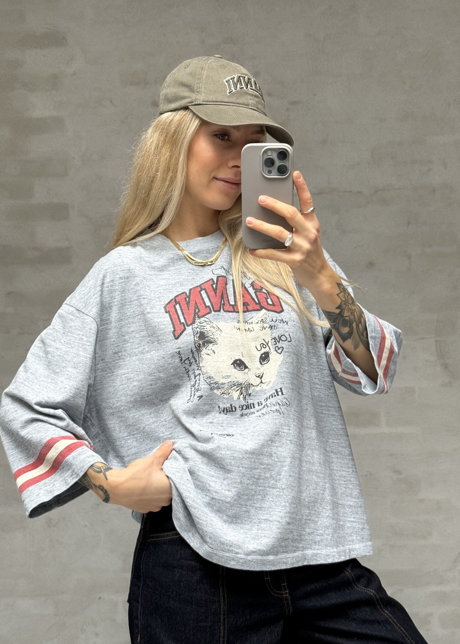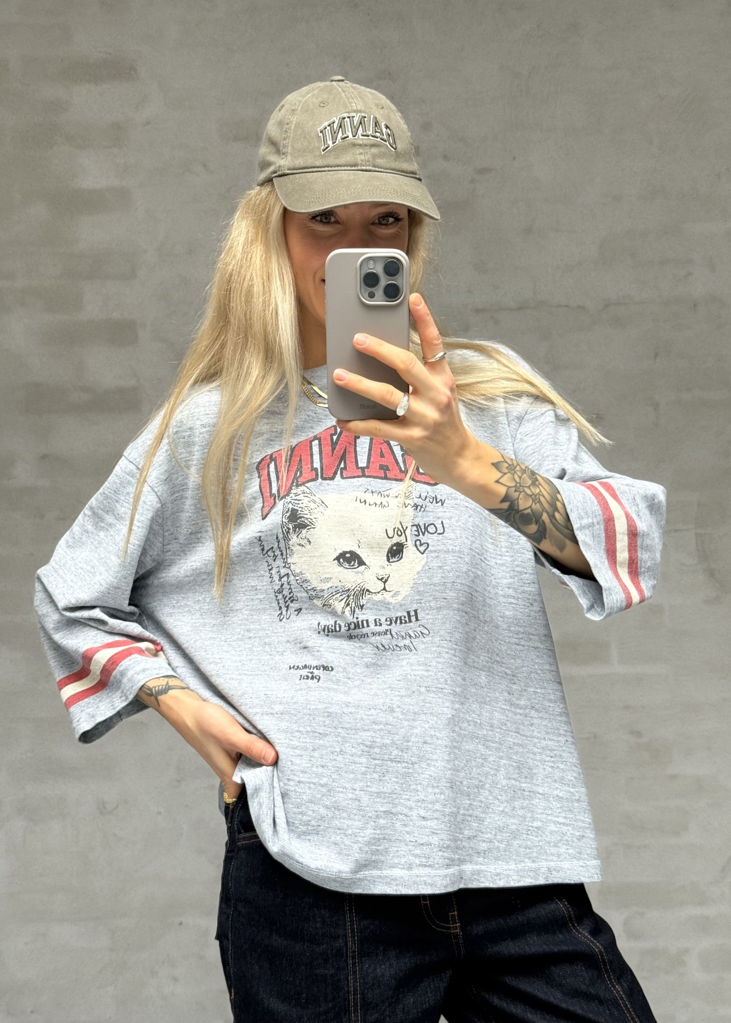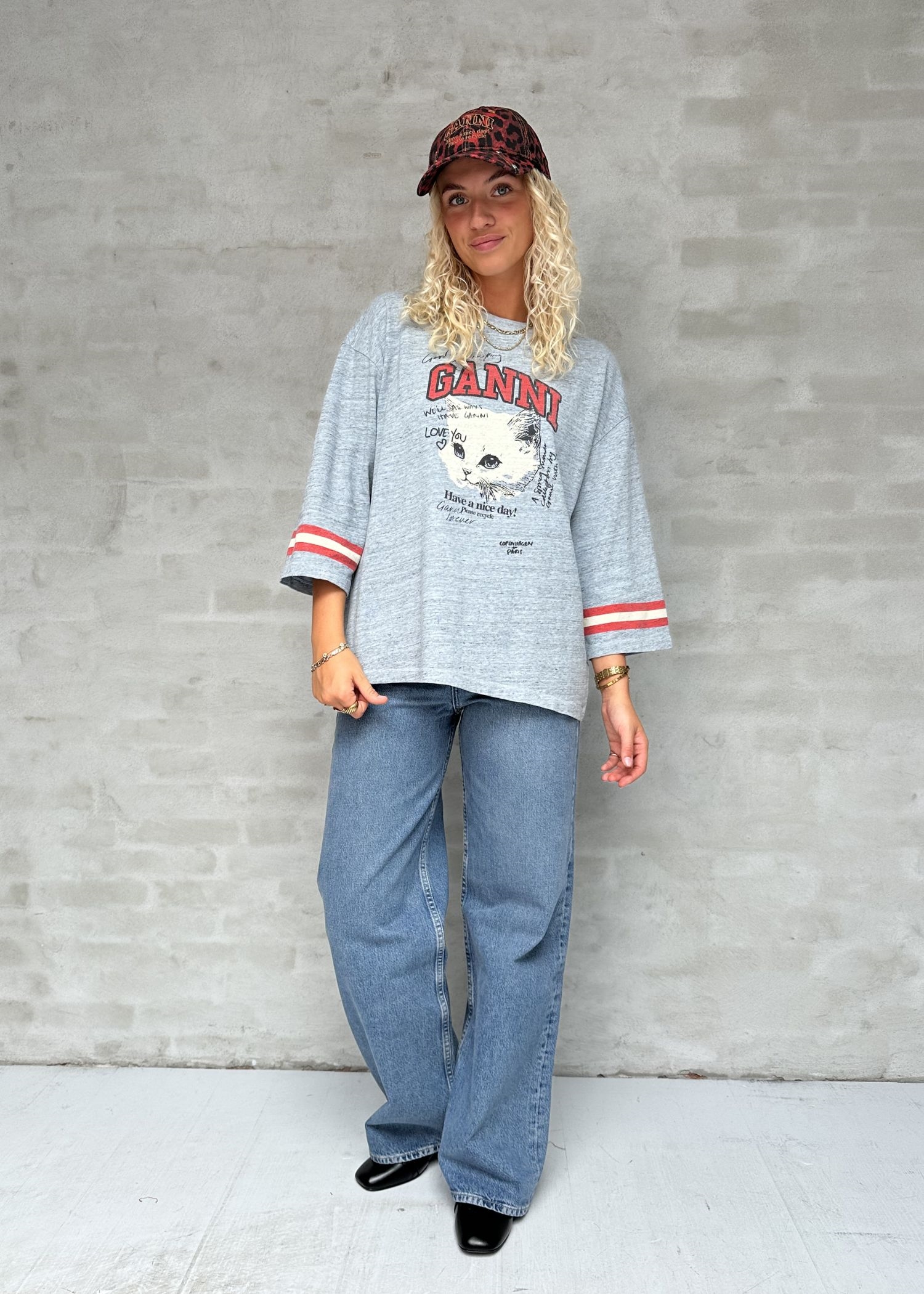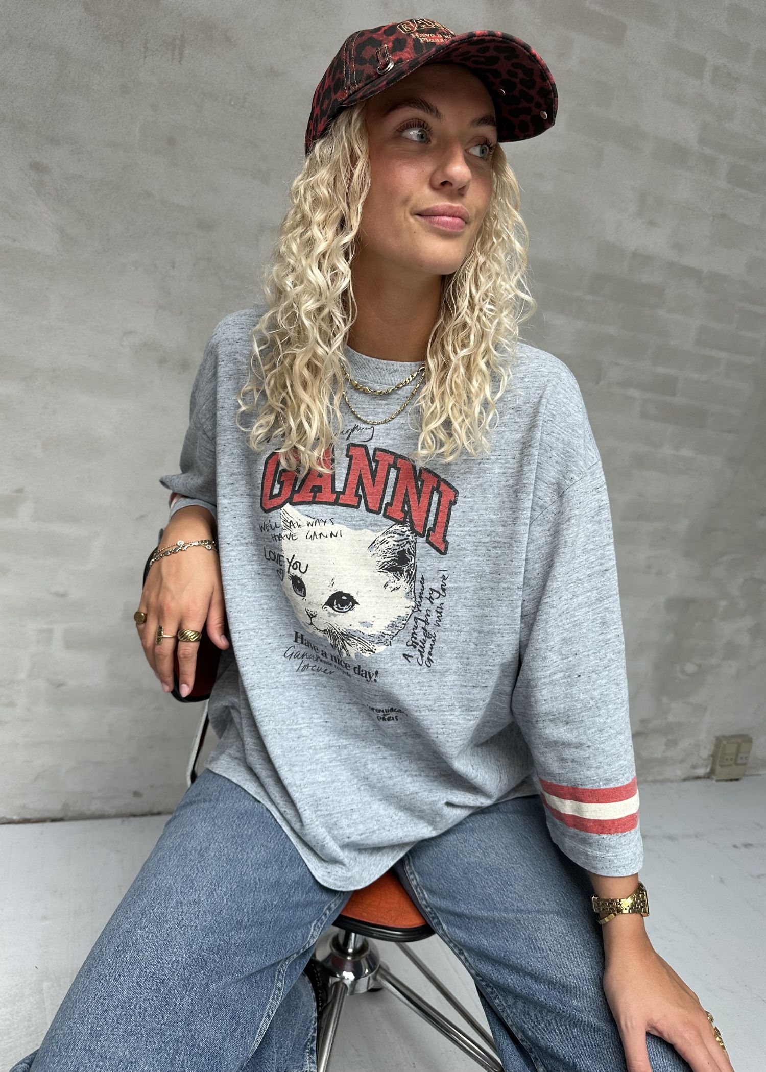 Lyseblå meleret sweat/bluse fra Ganni med print på brystet. Blusen er i en lidt kraftigere blød bomuldskvalitet med 3/4 ærmer med stribede detaljer.