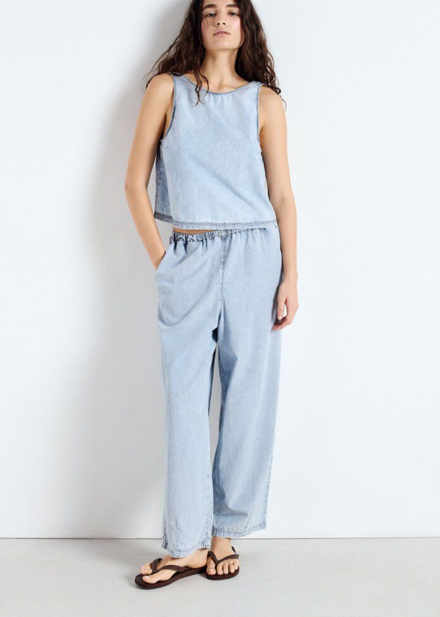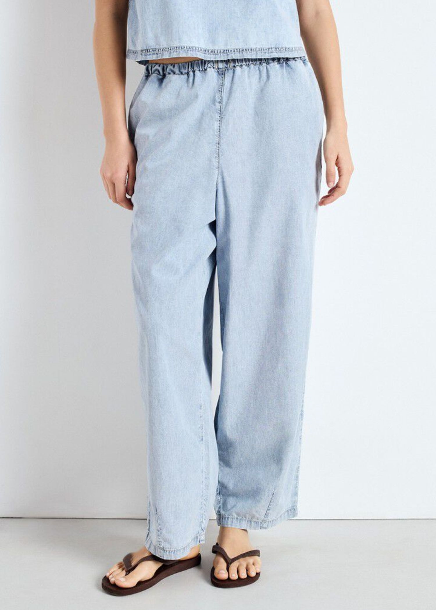 Cool lyseblå jeans fra American Vintage i en let tynd blød bomuldskvalitet, med elastik i taljen, lommer i siden, 1 påsyet baglomme med trykt logo, samt løse ben med let indsnævring i bunden.
