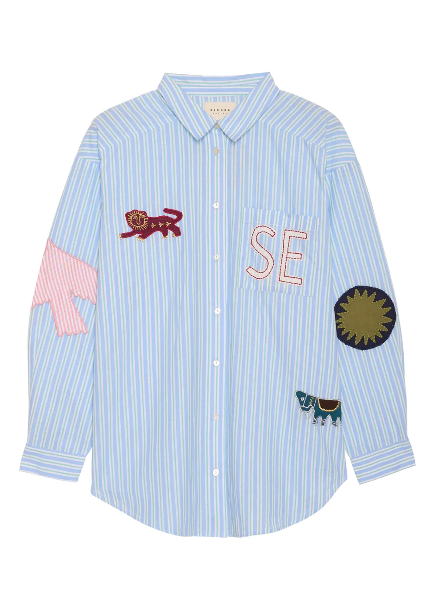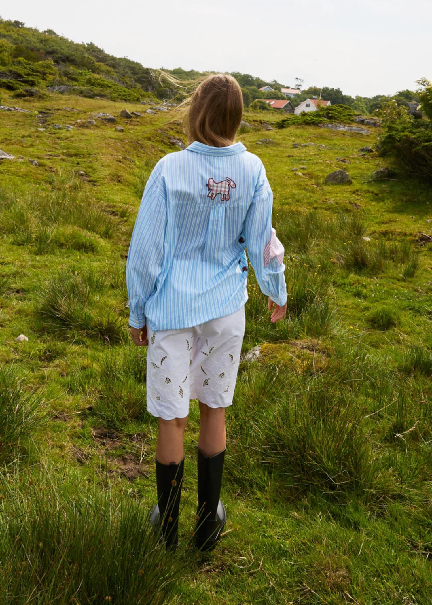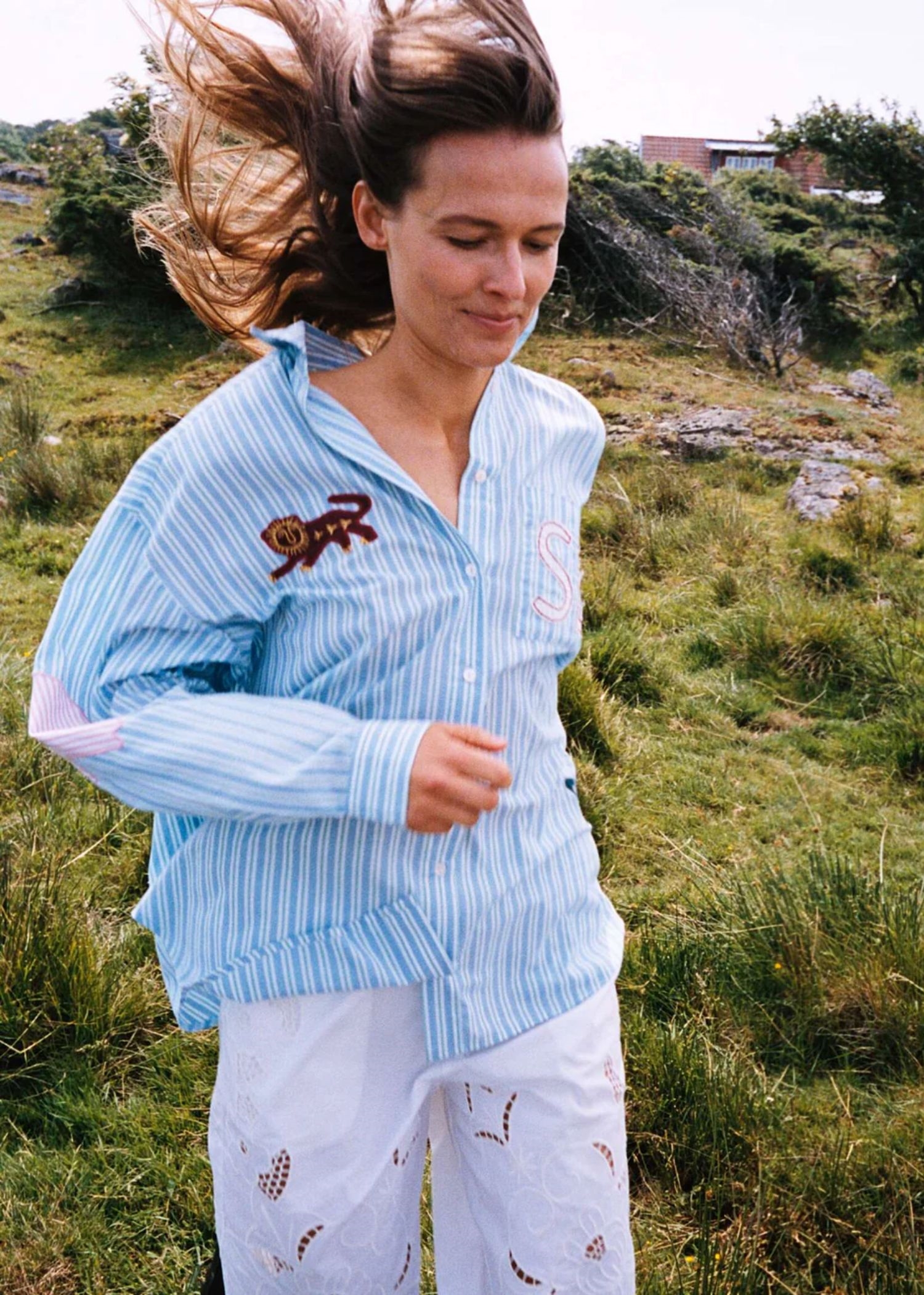 Pil-skjorten fra Sissel Edelbo har en løs, lige pasform med brede skuldre og er fremstillet af overskydende bomuld i garnfarvede striber. Den har lange, regulære ærmer med manchetter, klassisk skjortekrave og stolpelukning foran med knapper. Den buede bundkant giver en blød afslutning, og en enkelt brystlomme er placeret på venstre side. Skjorten er smukt dekoreret med charmerende motiver som en løve, en fugl og et sødt æsel, udført i en kombination af overskydende stoffer, ensfarvet bomuld og fint broderi.
