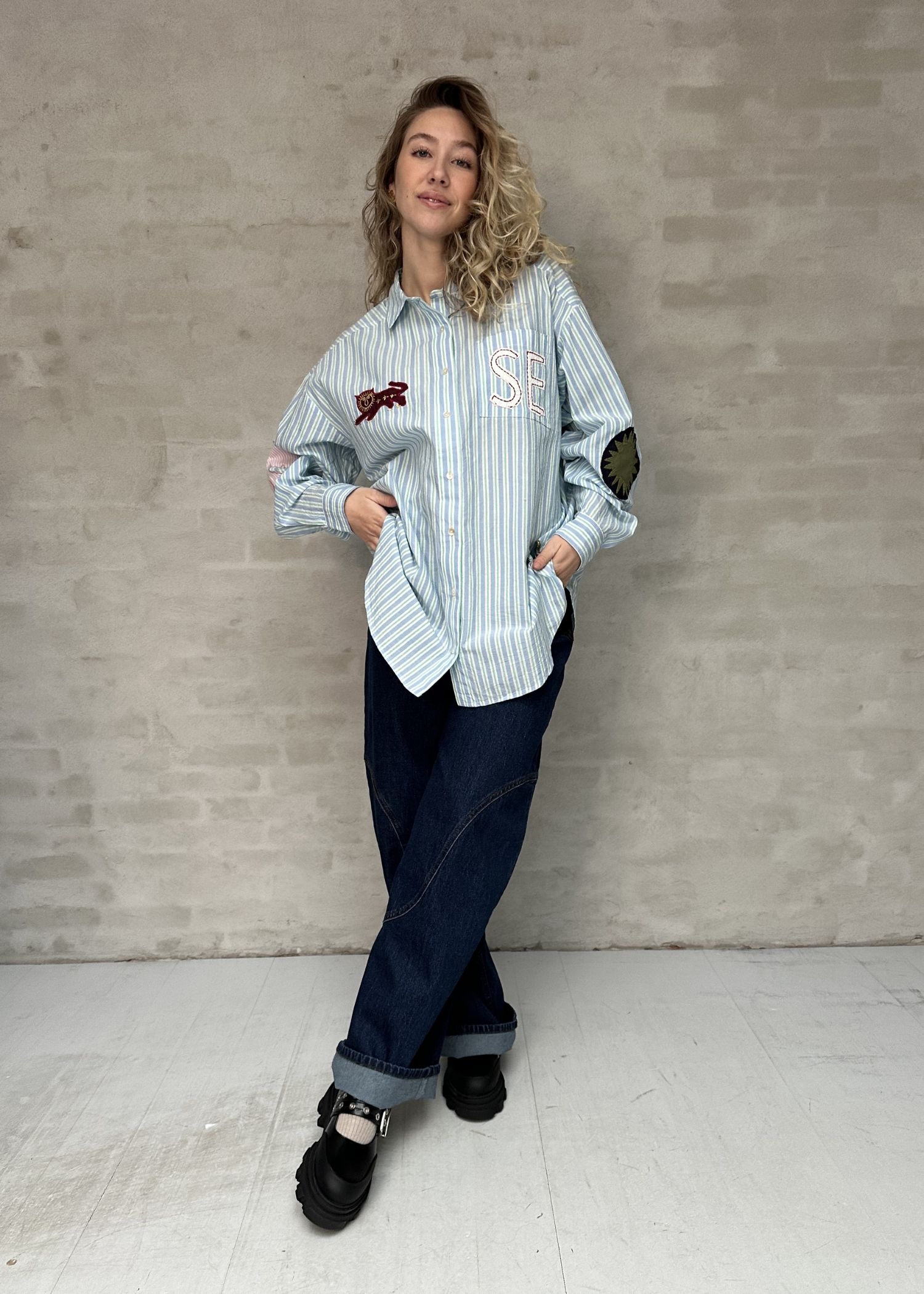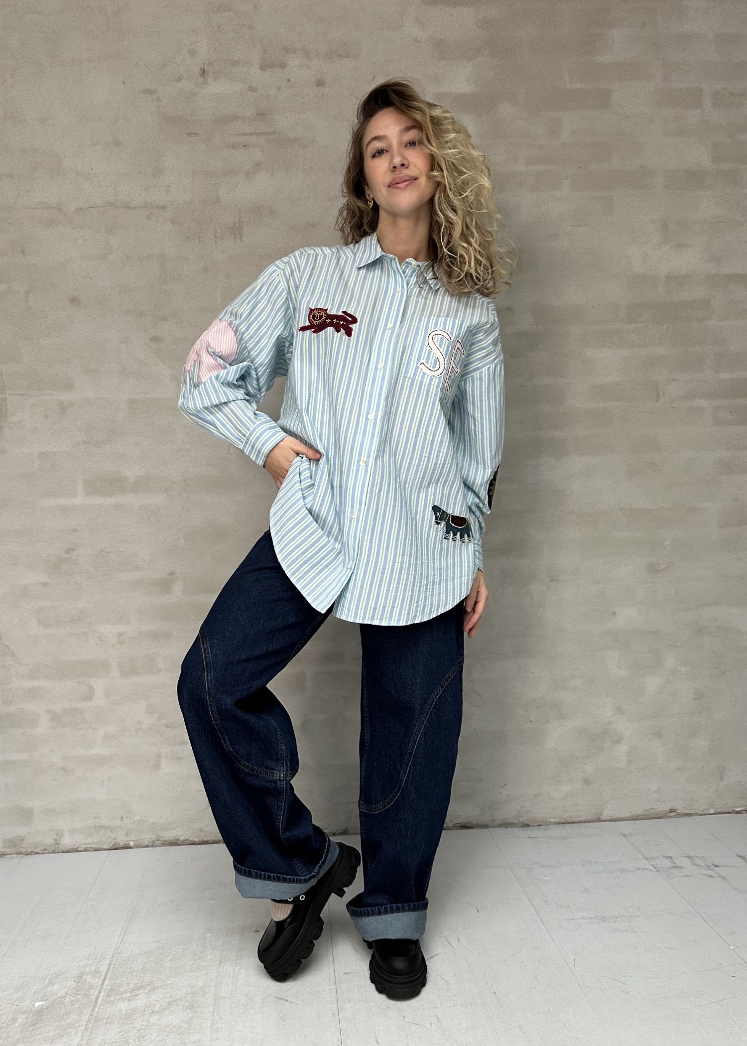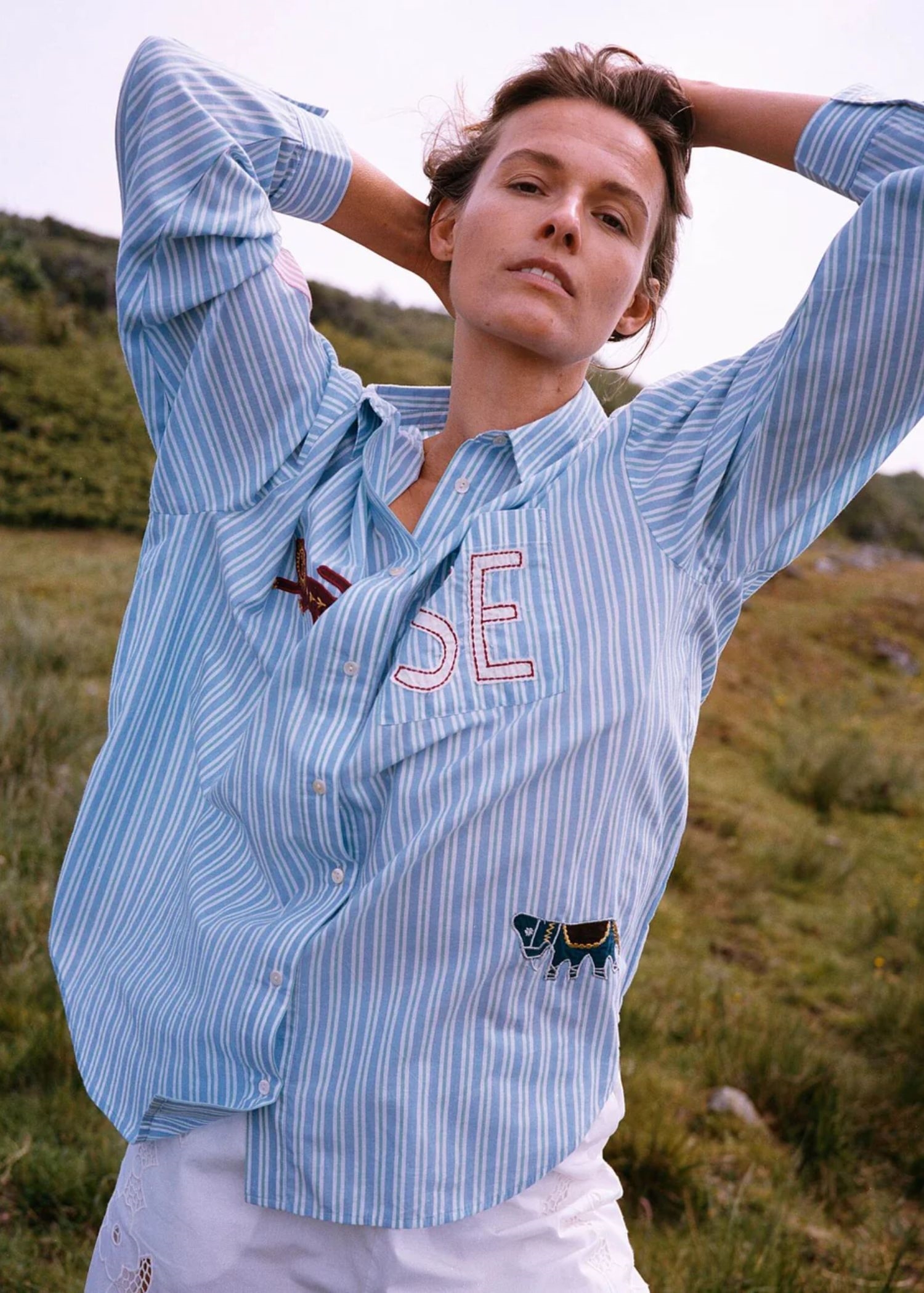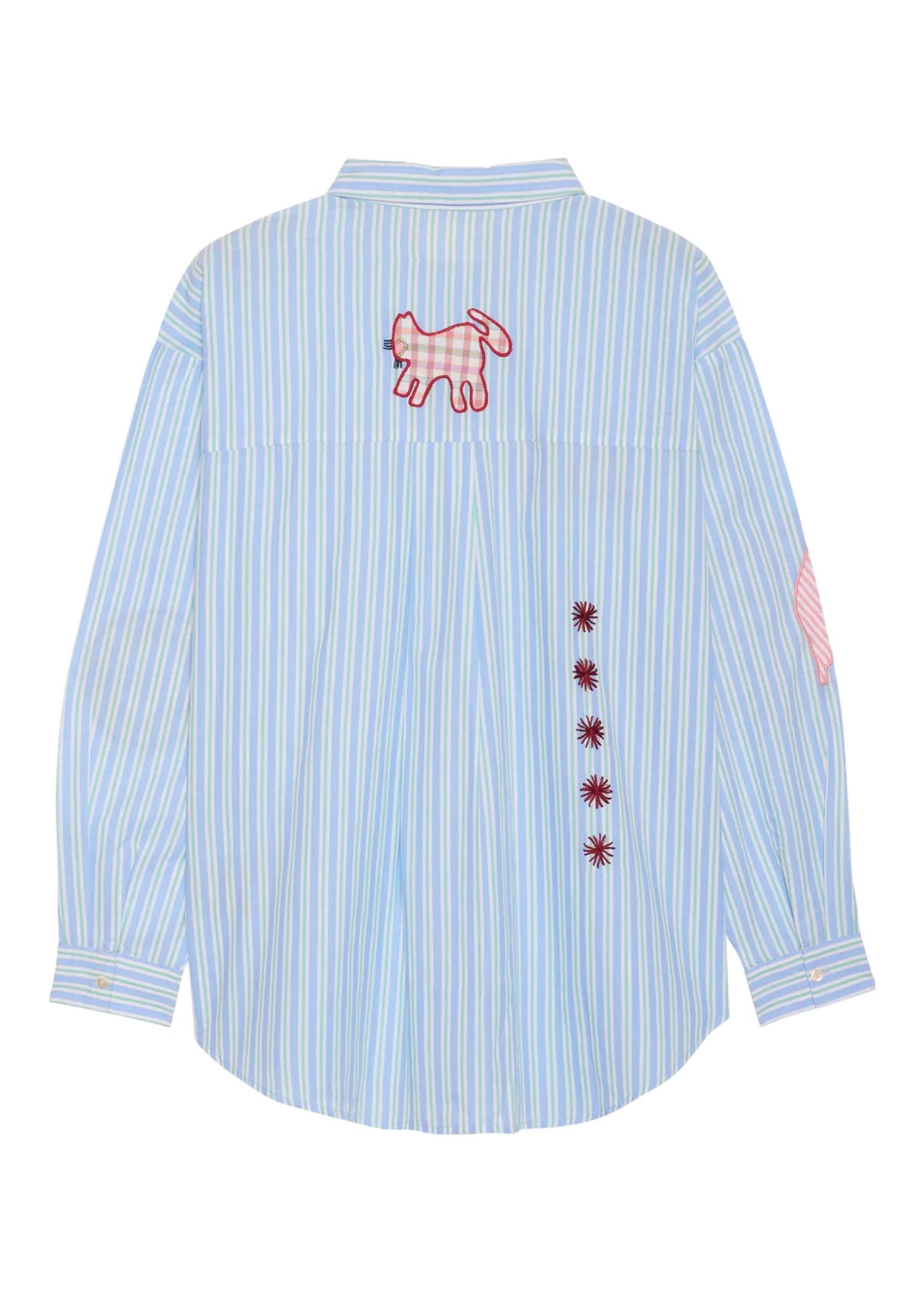 Pil-skjorten fra Sissel Edelbo har en løs, lige pasform med brede skuldre og er fremstillet af overskydende bomuld i garnfarvede striber. Den har lange, regulære ærmer med manchetter, klassisk skjortekrave og stolpelukning foran med knapper. Den buede bundkant giver en blød afslutning, og en enkelt brystlomme er placeret på venstre side. Skjorten er smukt dekoreret med charmerende motiver som en løve, en fugl og et sødt æsel, udført i en kombination af overskydende stoffer, ensfarvet bomuld og fint broderi.