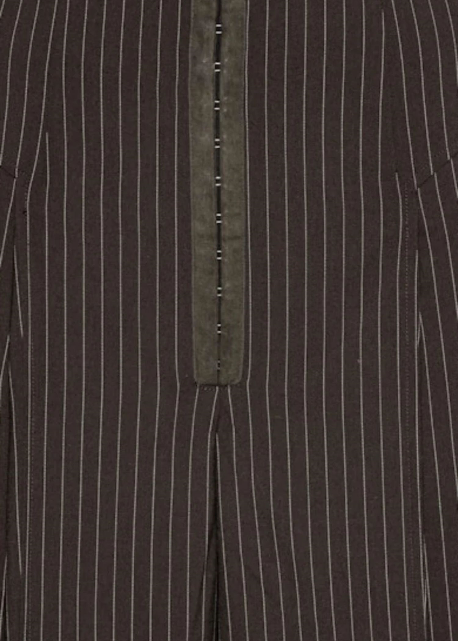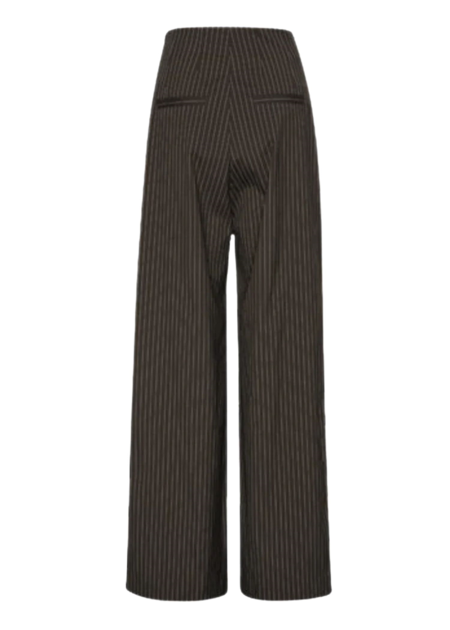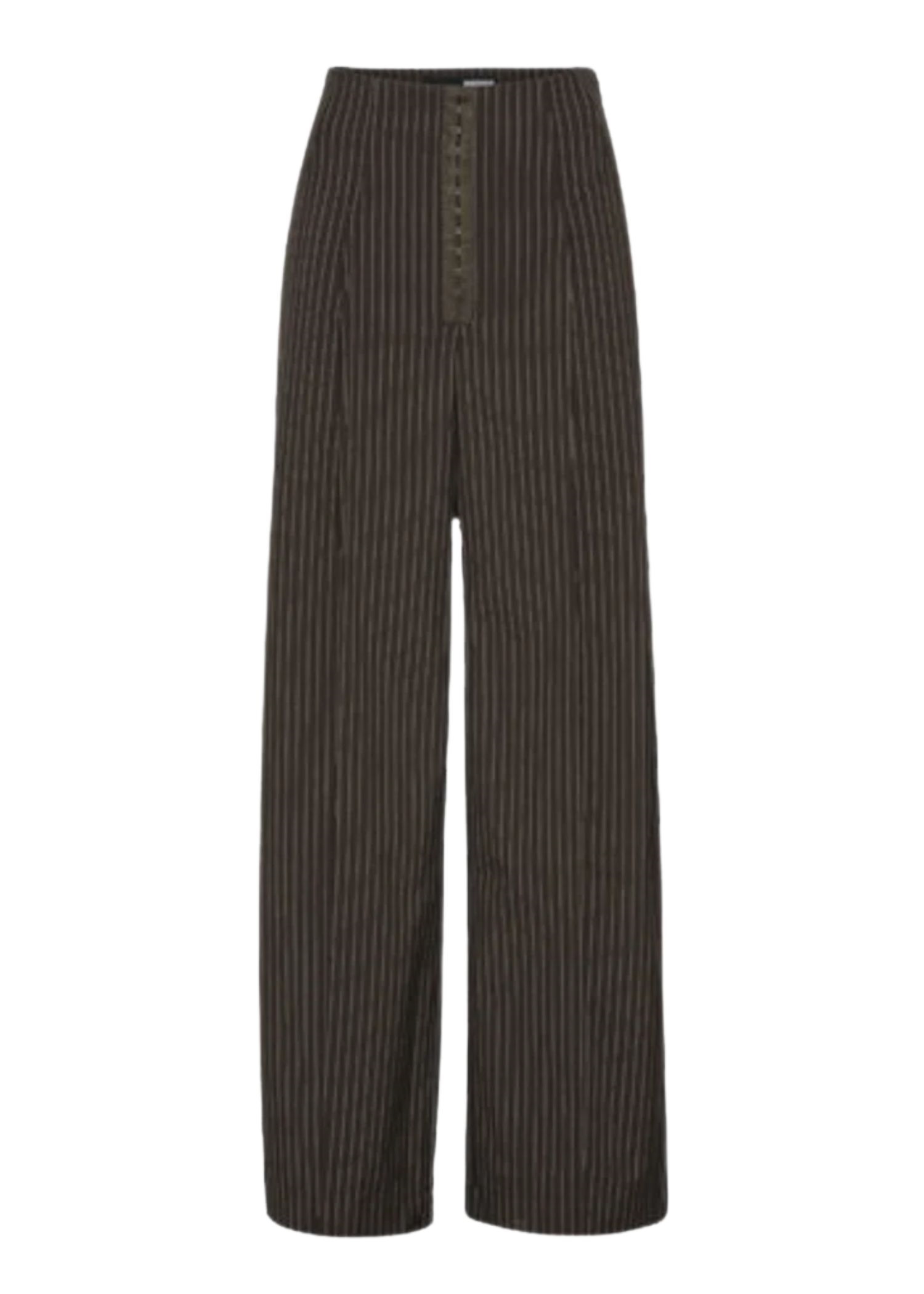 Mørkebrune pinstripe bukser fra Rotate med høj talje, læg, lange løse ben, hægtelukning foran som ikke kan åbnes, samt skjult lynlås i siden.