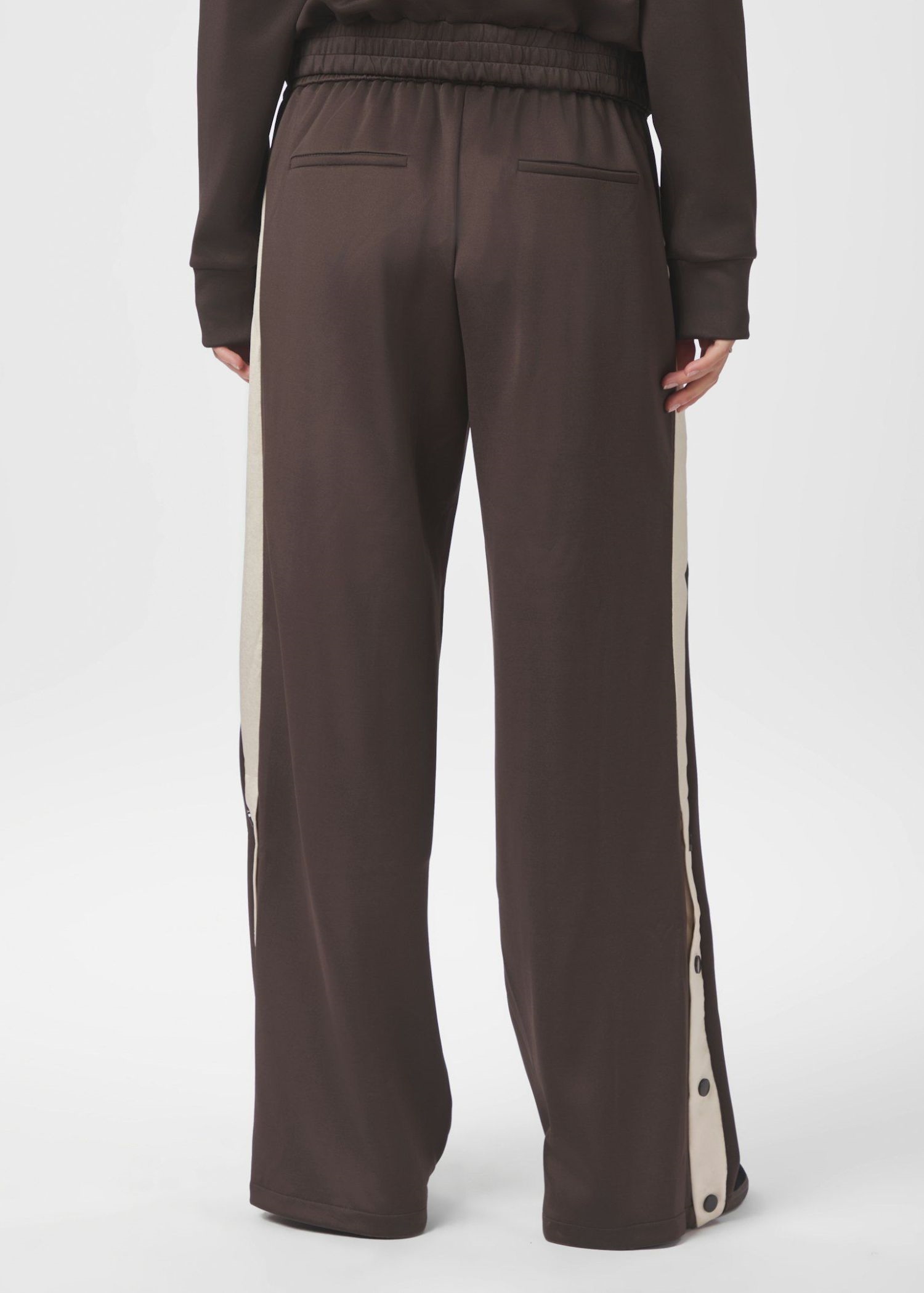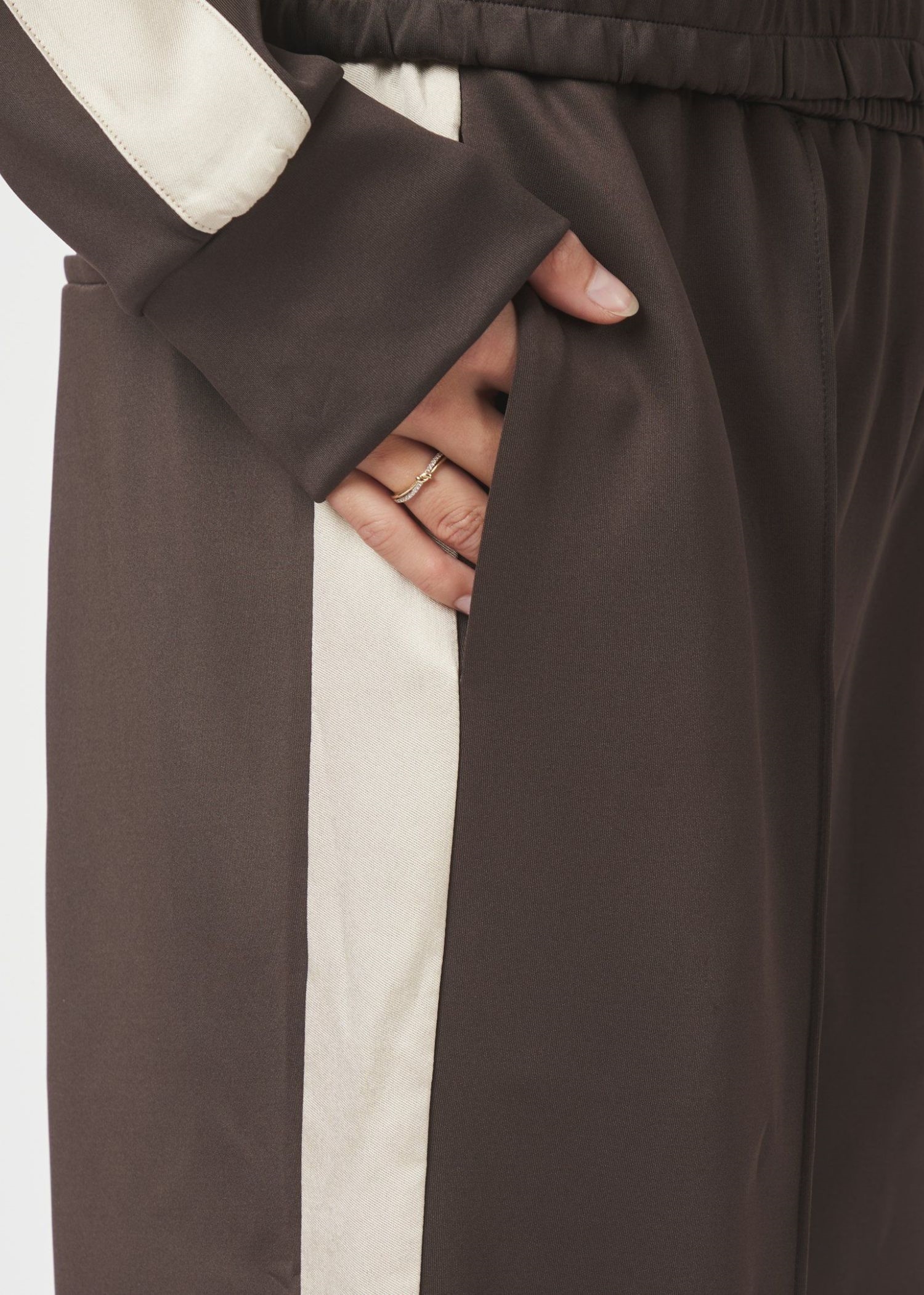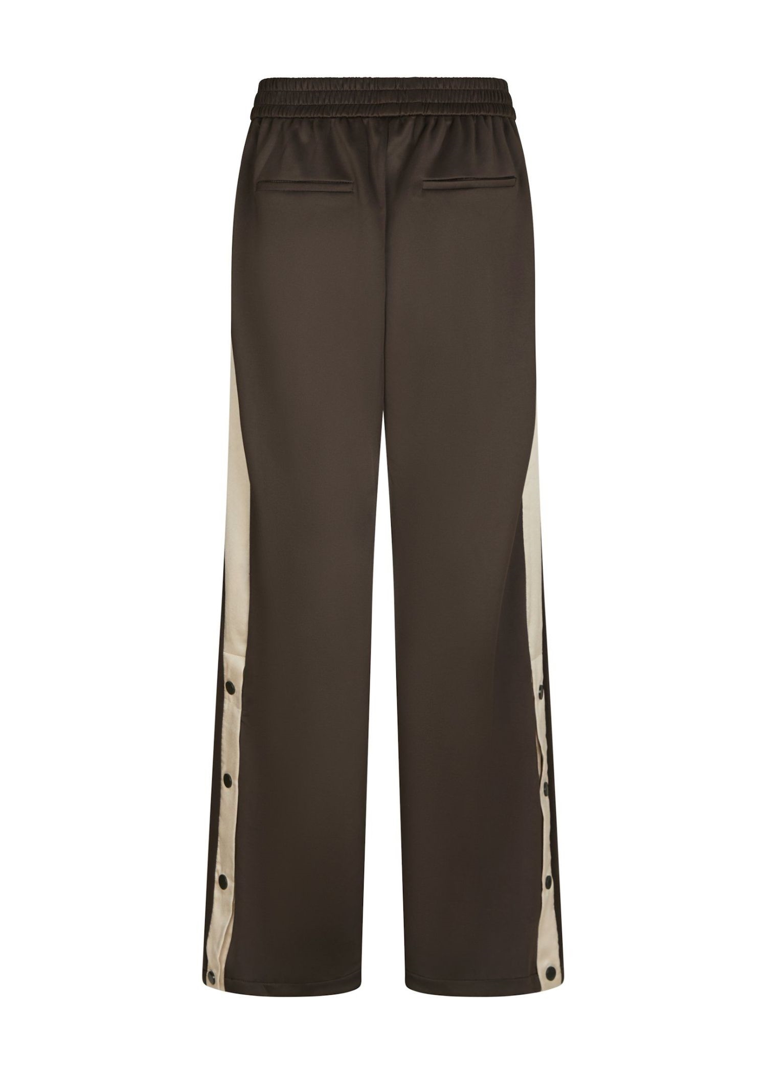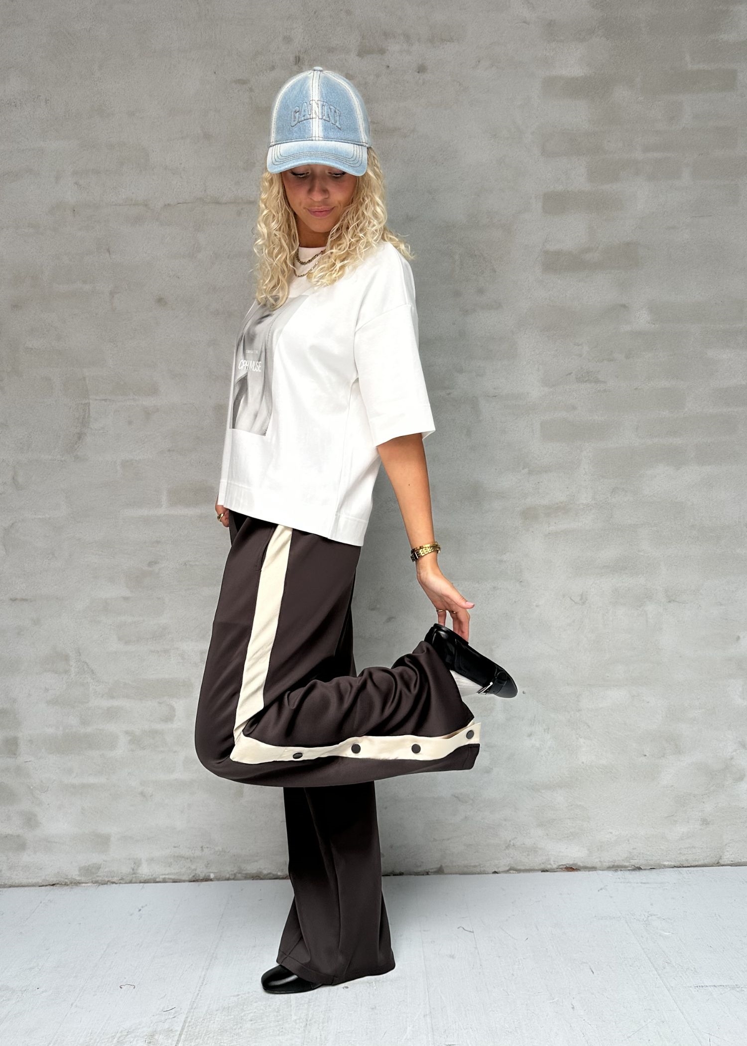Mørkebrune track suit bukser fra Neo Noir med brede ben og off white stribedetaljer ned langs benet, elastik i taljen, paspolerede baglommer, sidelommer, samt slids med knapper forneden.