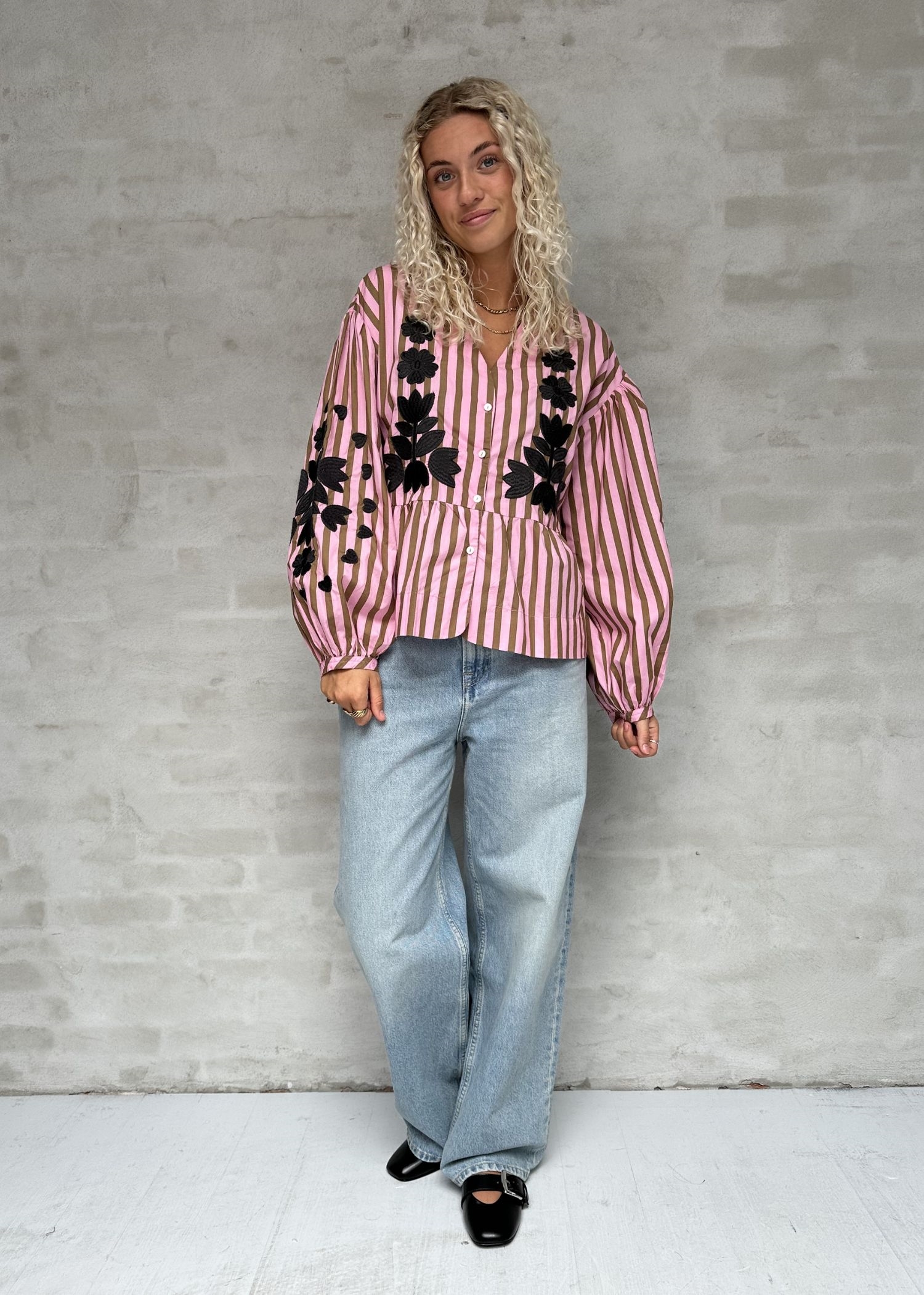 Rikke Top fra Sissel Edelbo er en løs, feminin top lavet af 100% økologisk bomulds-poplin. Toppen har dropped shoulders og brede ballonærmer med elastik ved ærmeåbningerne. Den har en V-udskæring og kan lukkes med rhinsten-knapper. Toppen er fint dekoreret med voluminøst broderi i en kontrastfarve. Broderiet er placeret på brystet og på ydersiden af ærmerne.