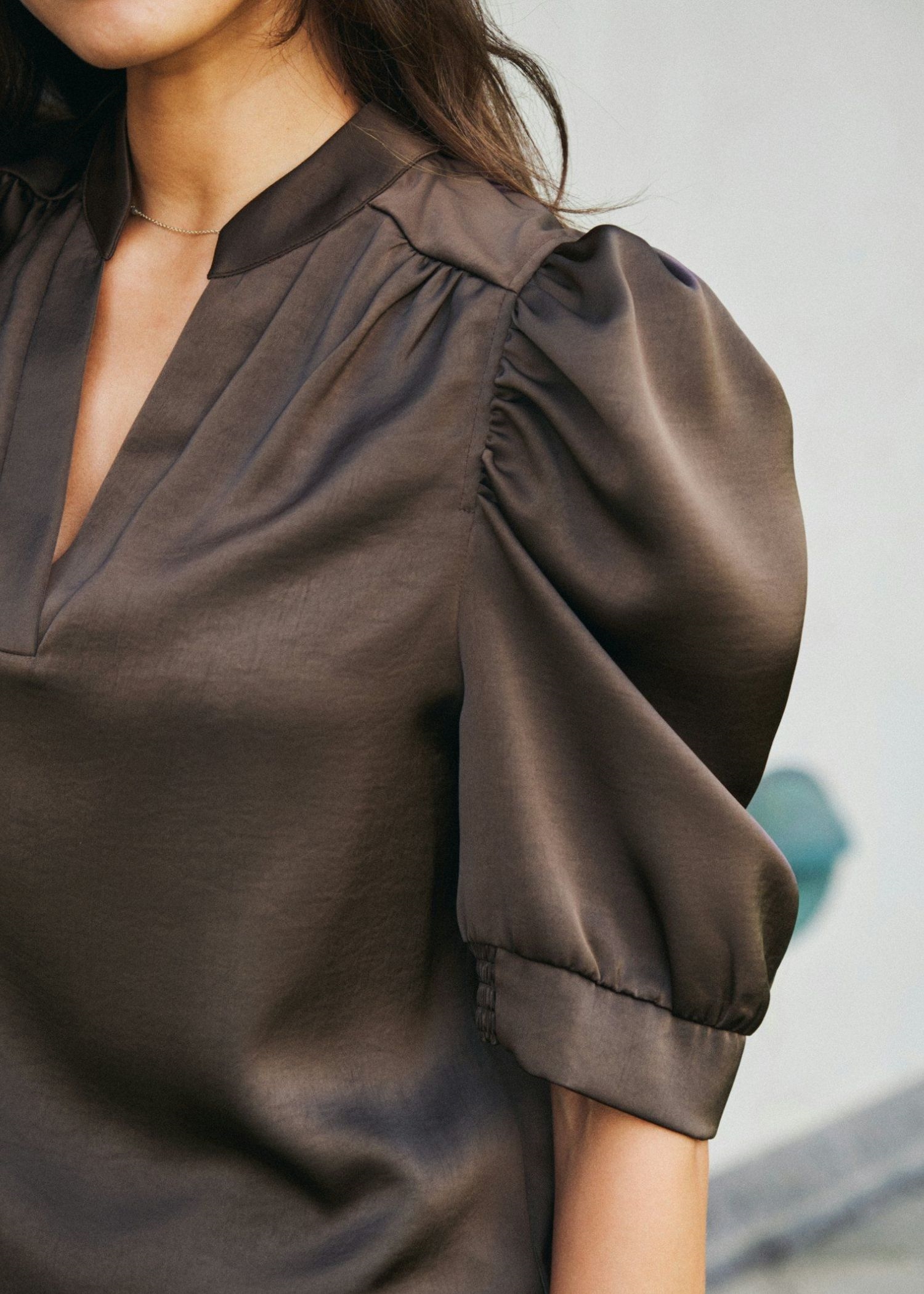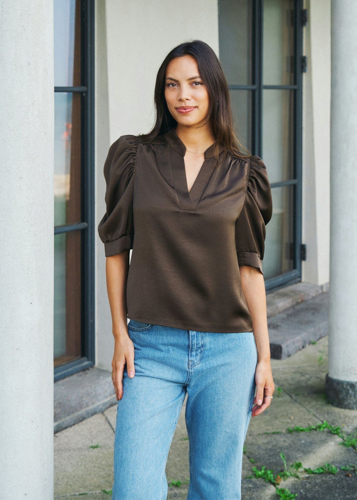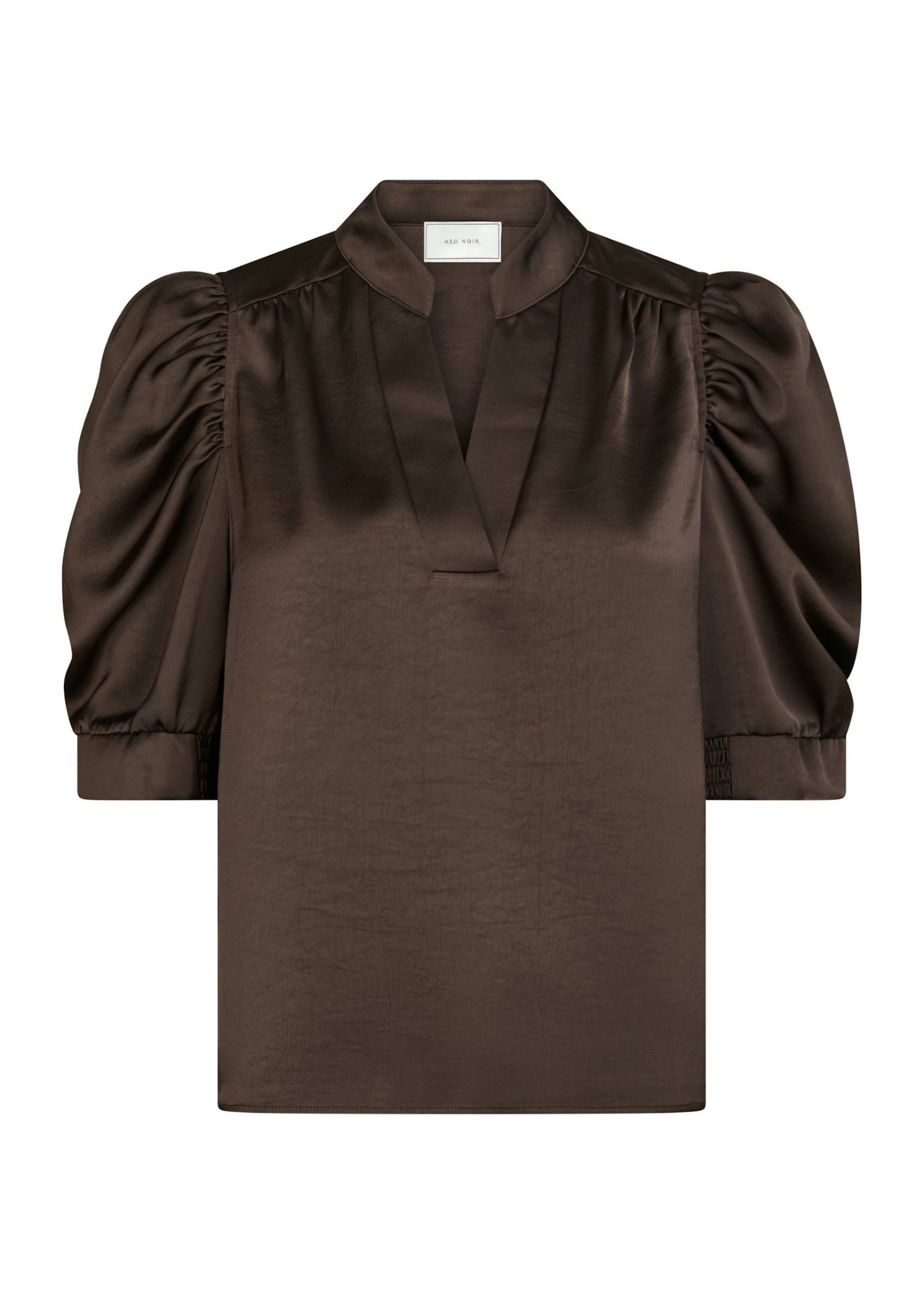 Smuk mørkebrun satin bluse fra Neo Noir i en glat polyester kvalitet med stretch. Blusen har ståkrave, v-hals, samt korte puffede ærmer med elastisk afslutning.