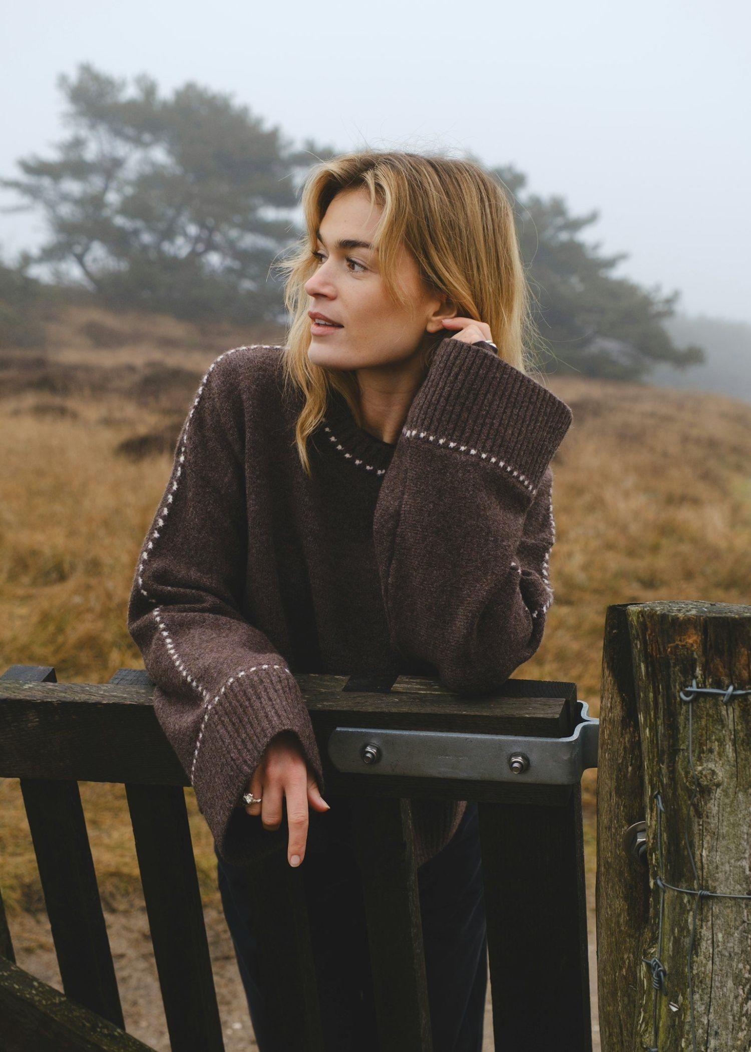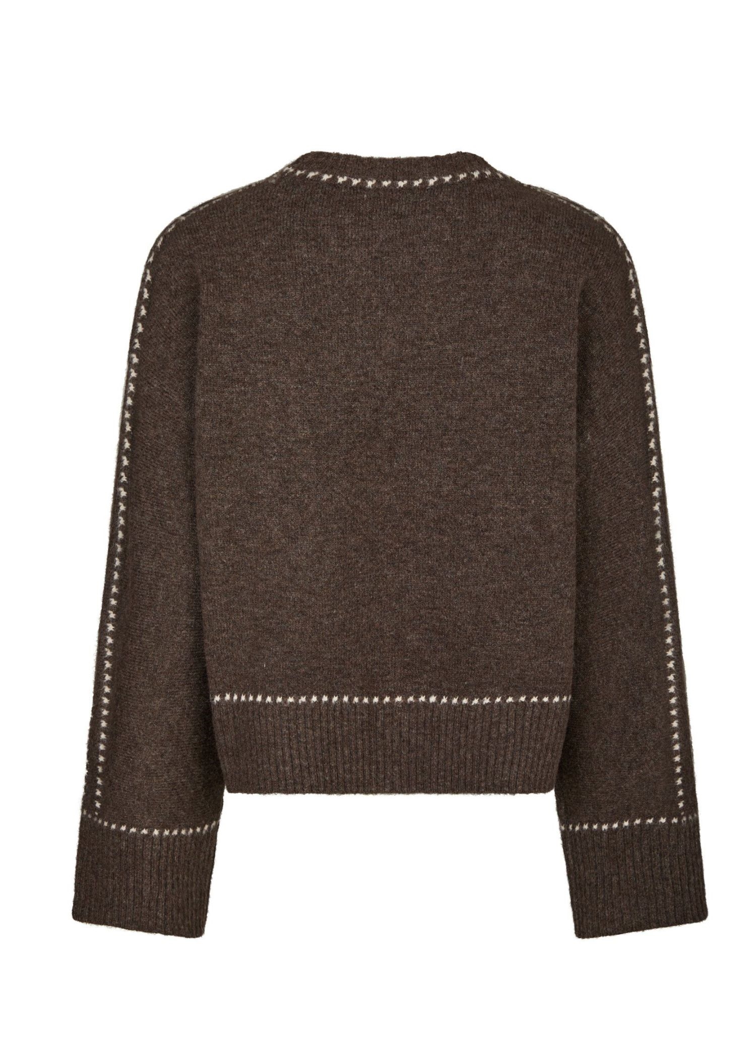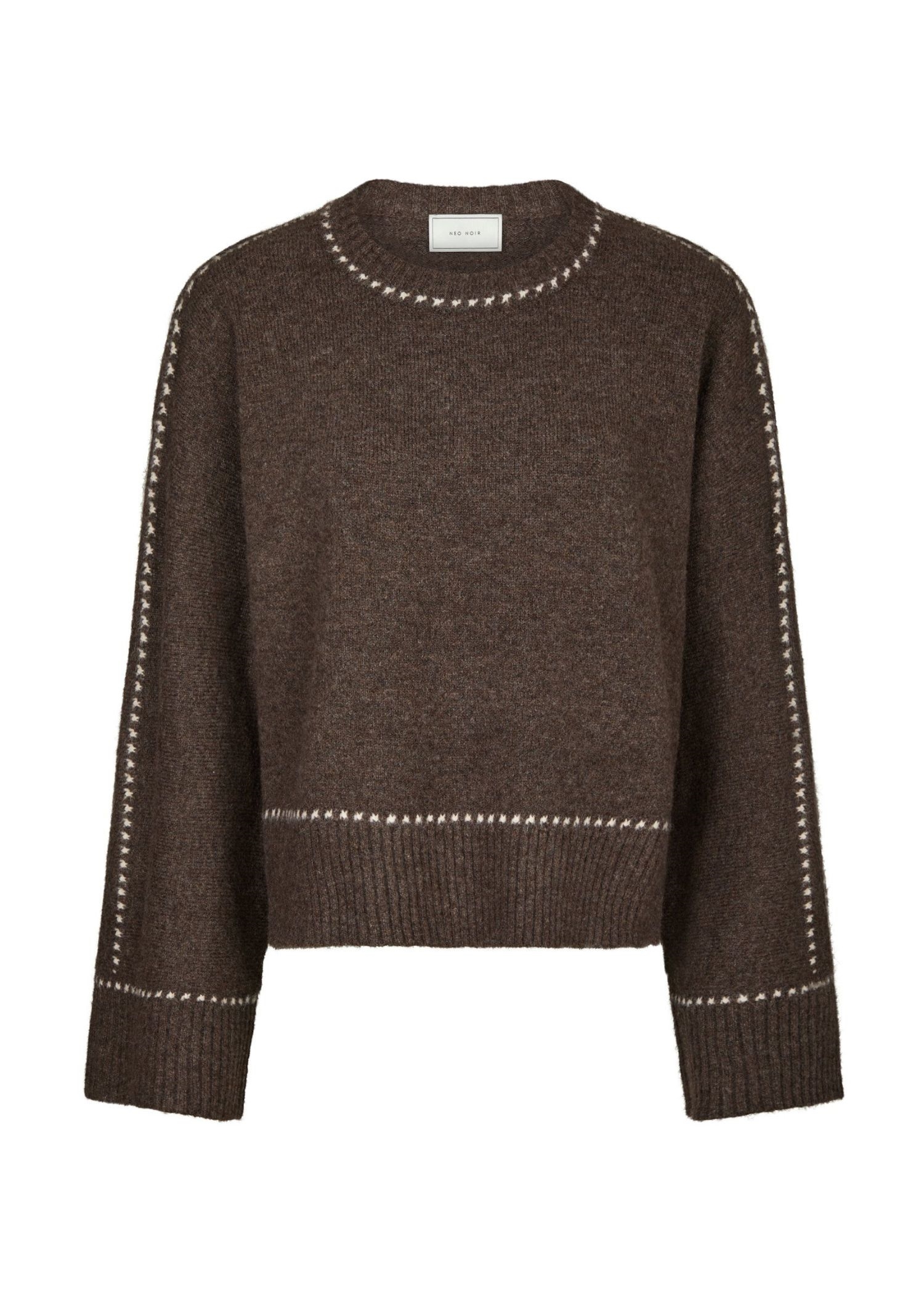 Brun meleret strik fra Neo Noir med lyse stitch detaljer. Strikken er bred i modellen, har rib o-hals, samt brede ærmer med ribafslutning.
