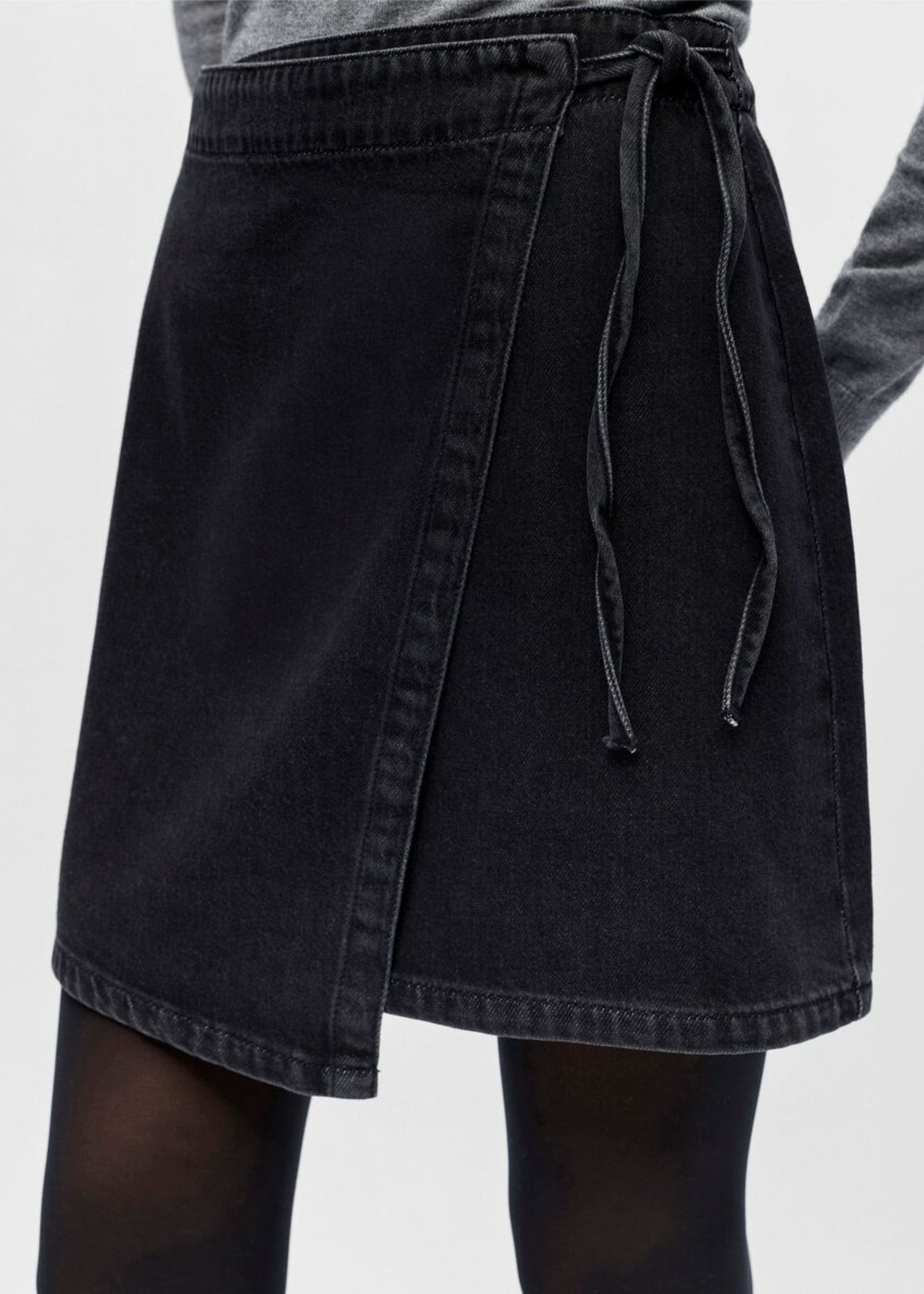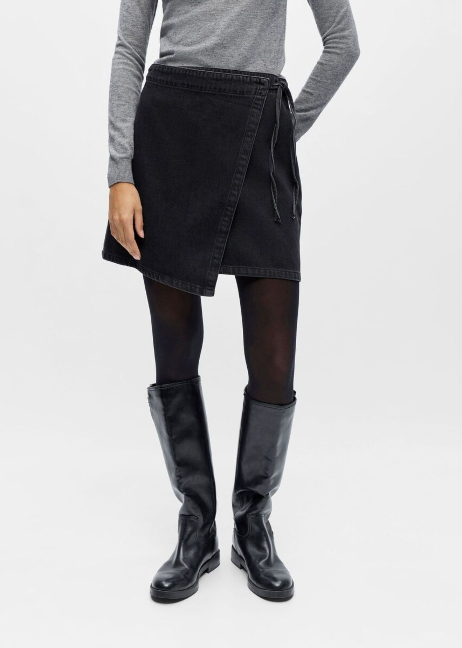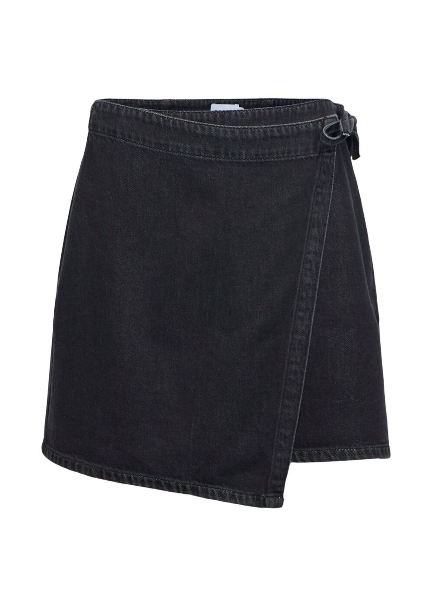Kort sort slå om skirt fra Object i en blød denim kvalitet med bindebånd i siden.
