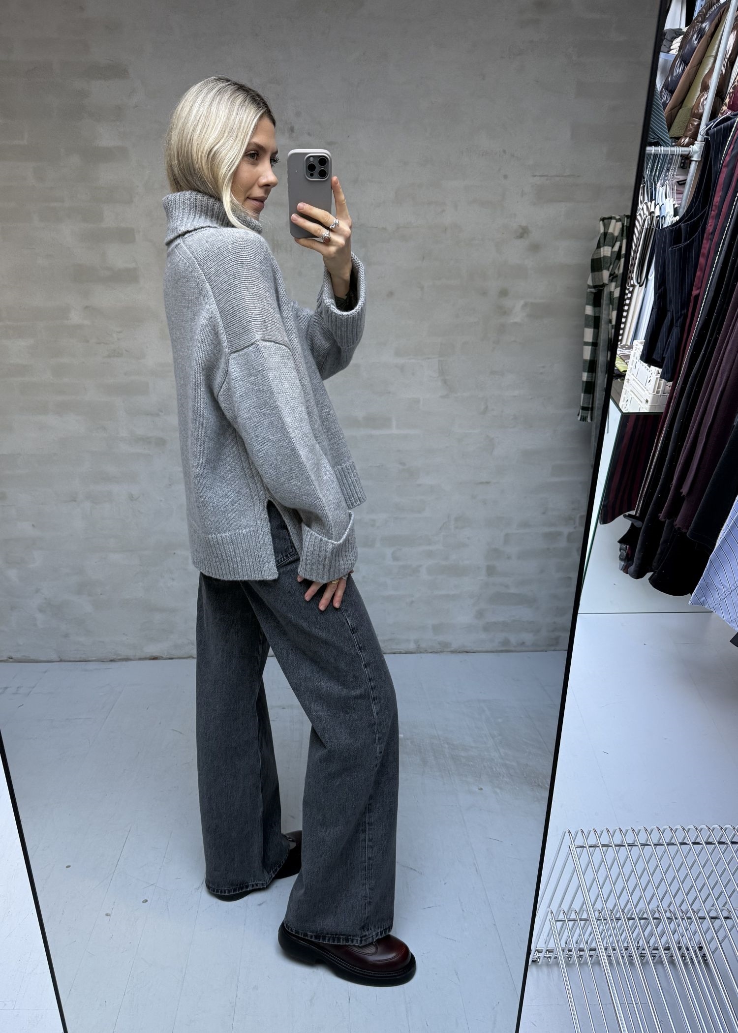 Lysegrå meleret turtleneck strik fra Samsøe med oversized pasform og dropped shoulder-effekt. Ribstrik i krave, manchetter og forneden. Hovedmaterialet er fremstillet i en blanding med uld.