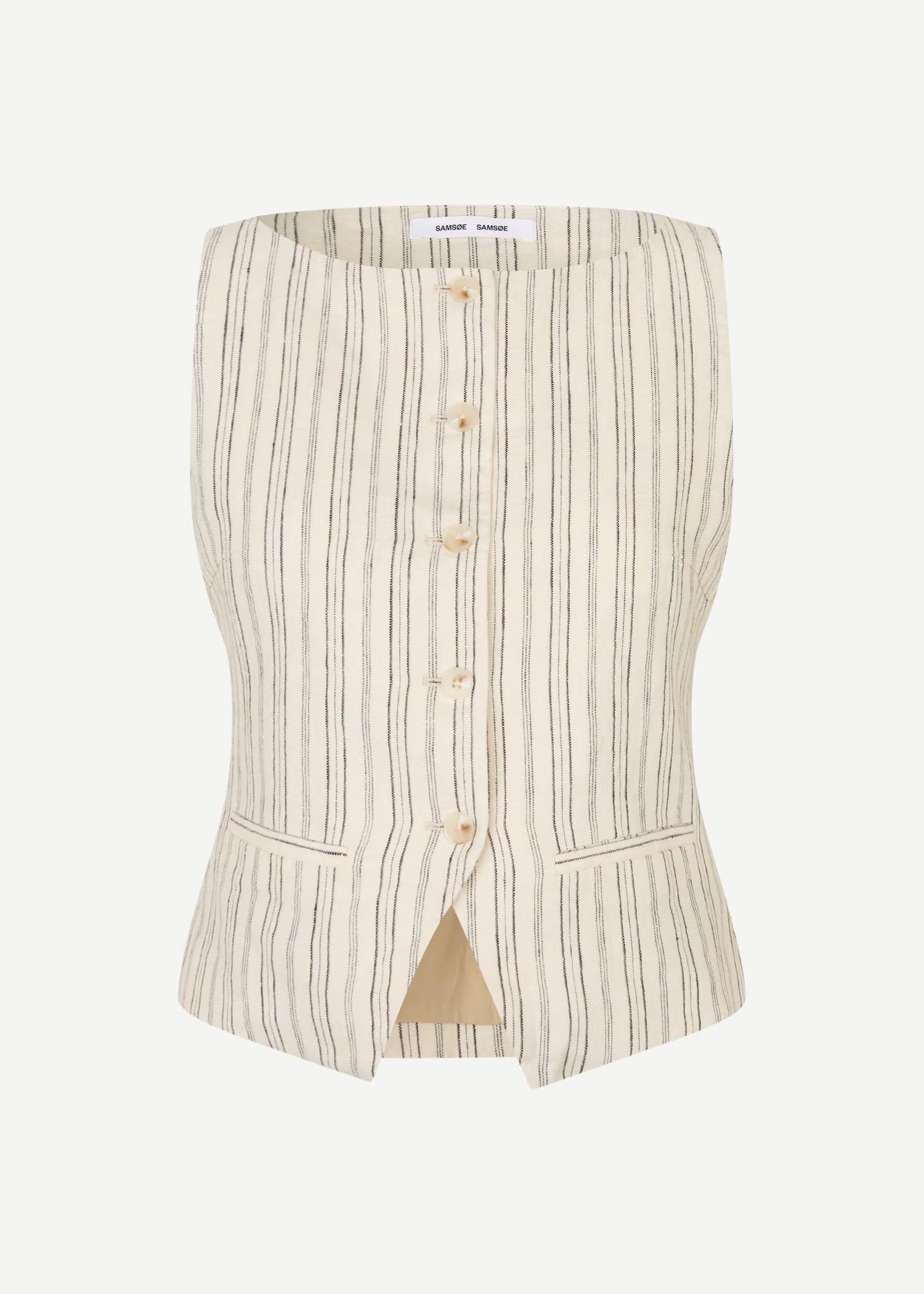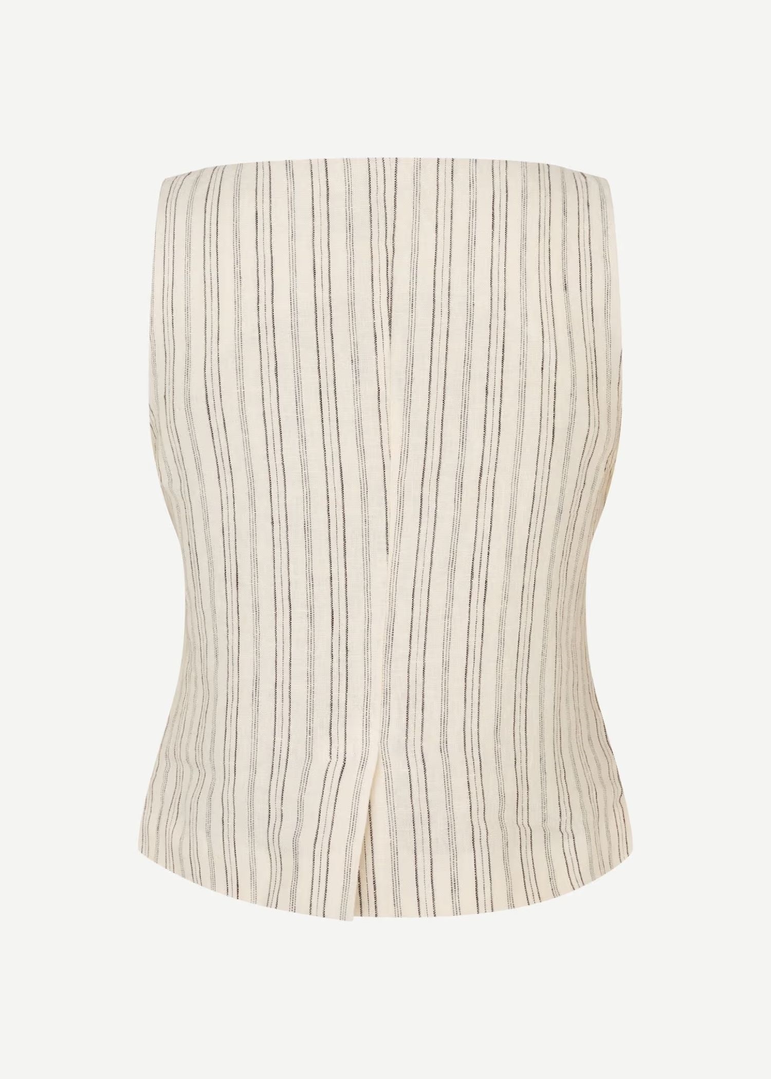 Off White stribet vest fra Samsøe i vævet stof med normal pasform. Knaplukning midt foran og paspolerede lommer foran. Rund hals. Hovedmateriale fremstillet af 100 % hør. Hovedfor i 100 % bomuld.