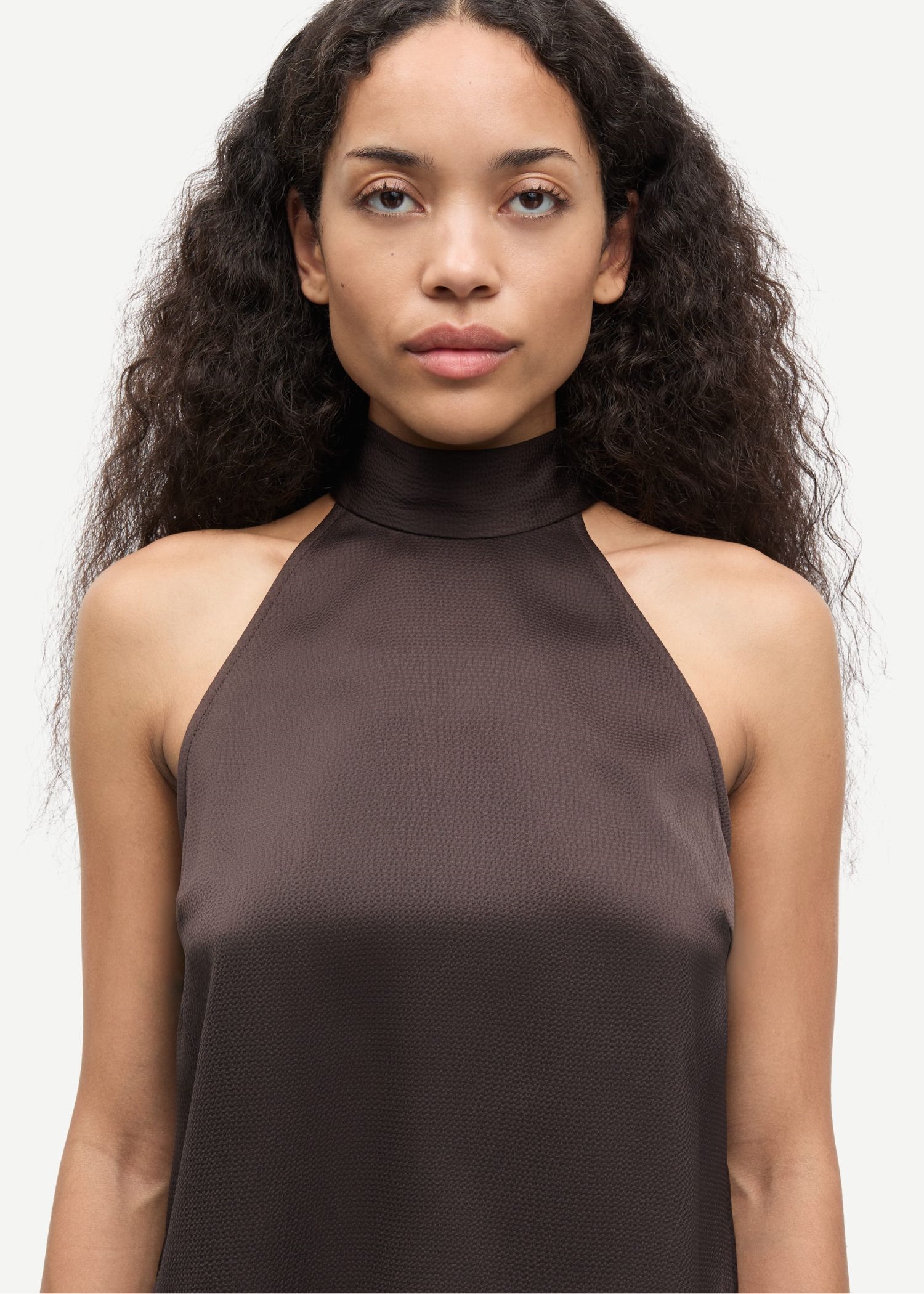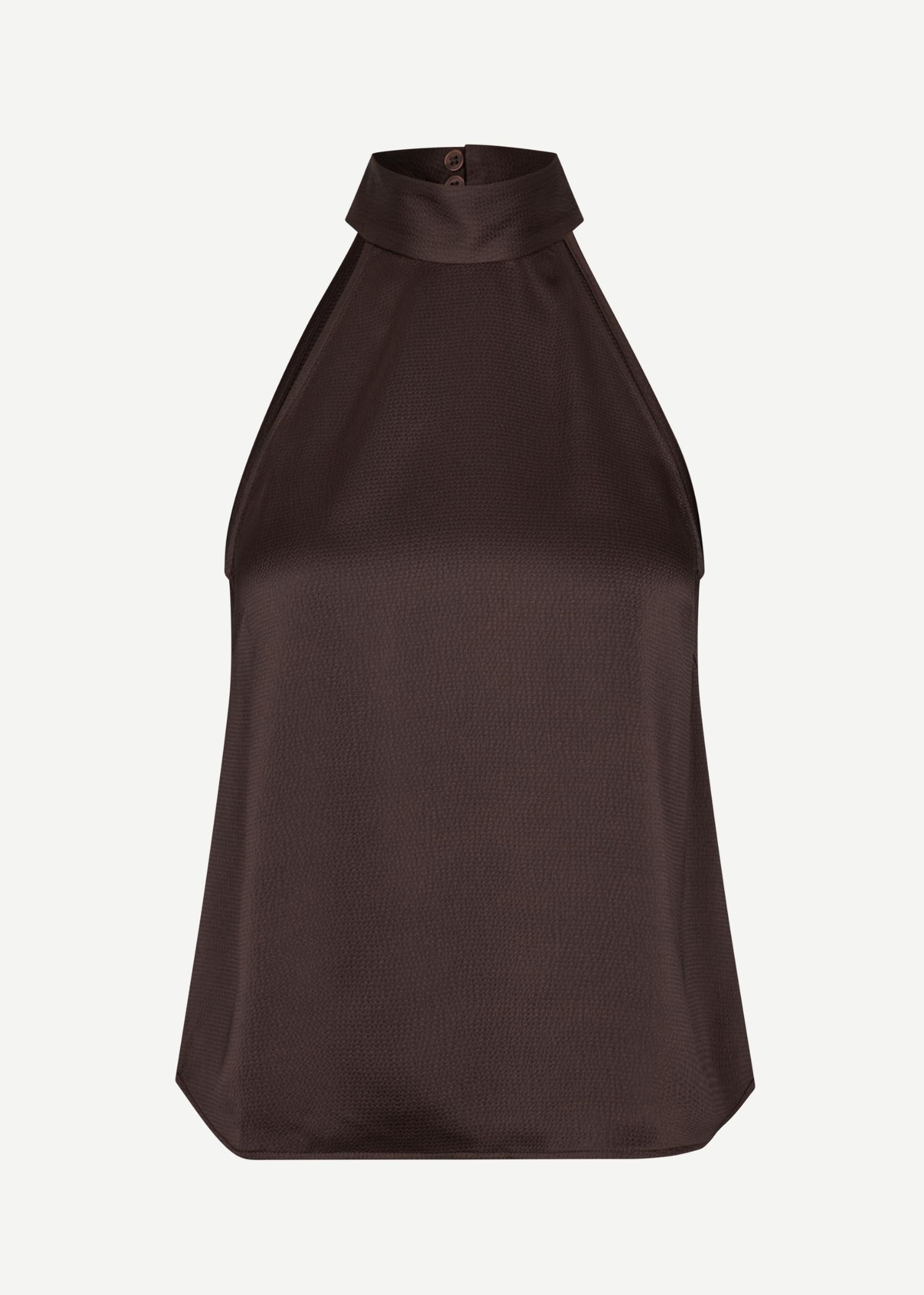 Mørkebrun top fra Samsøe i en let shiny polyester kvalitet med stretch. Toppen har  høj hals, knaplukning i nakken, samt revneåbning bagpå foroven.